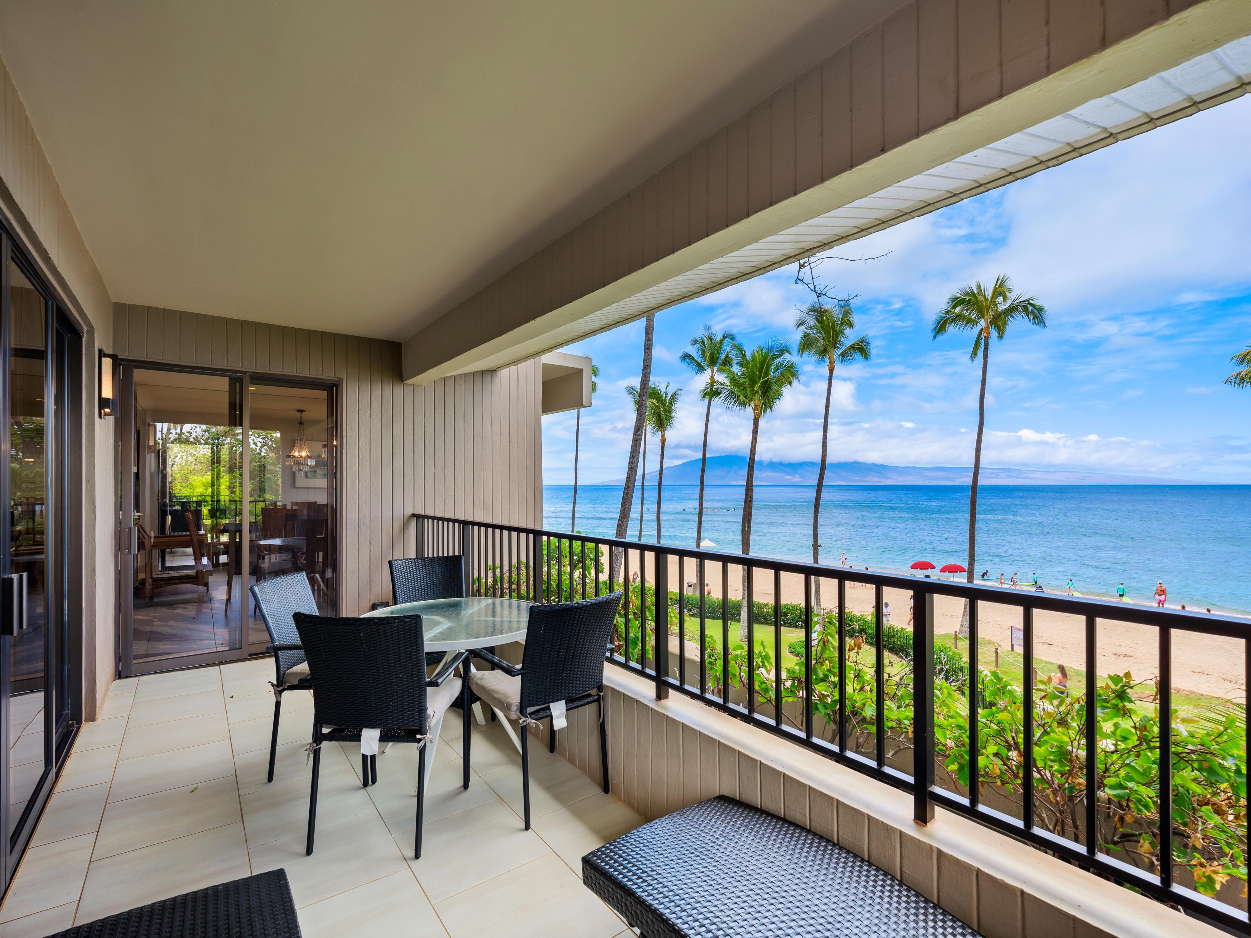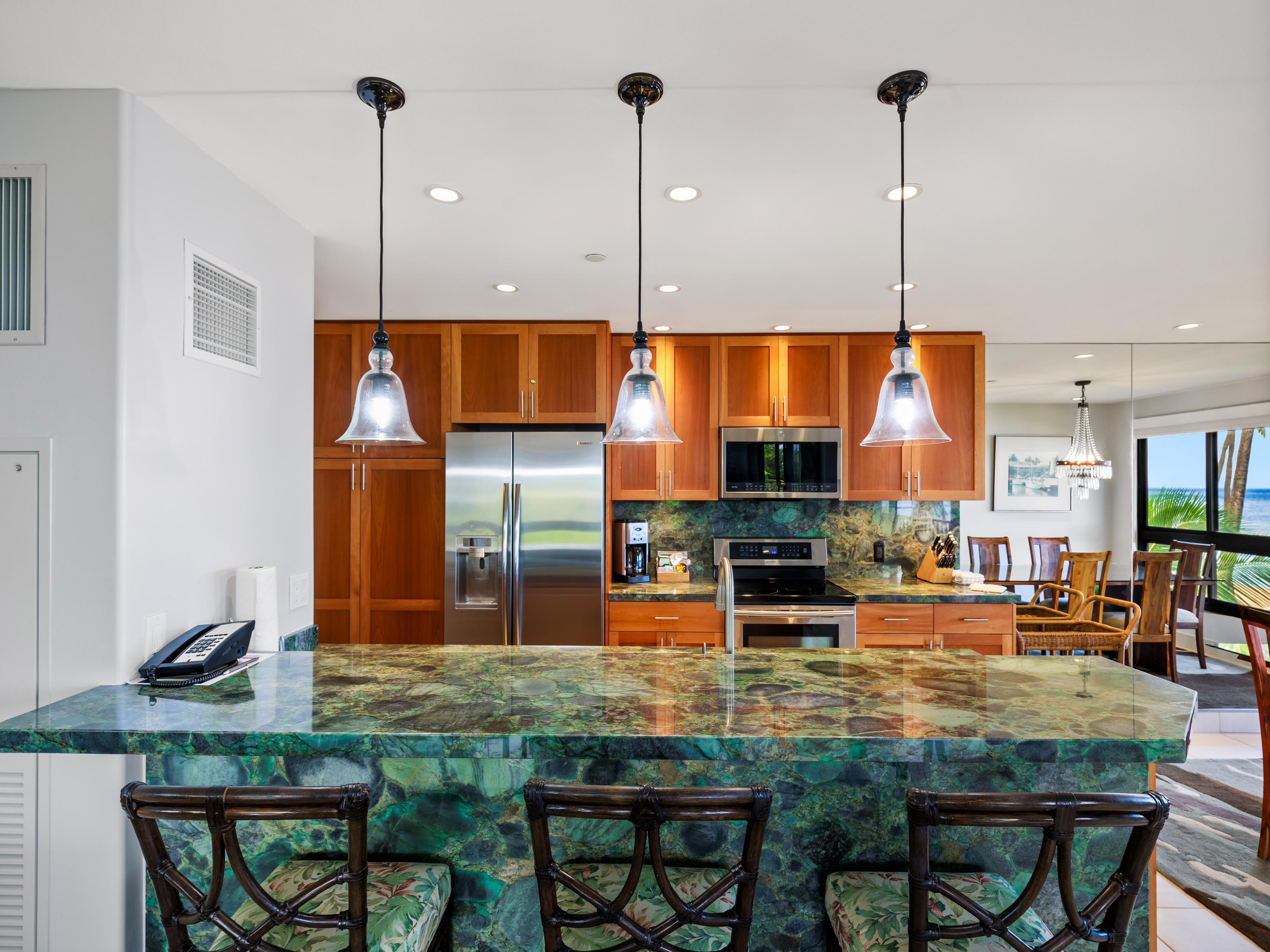 The fully equipped kitchen features rich wood cabinetry, emerald granite counters, and stainless steel appliances, making it easy to prepare Hawaiian-inspired meals. Dine indoors at the table overlooking the ocean or outside on the lanai with the refreshing Maui breeze.