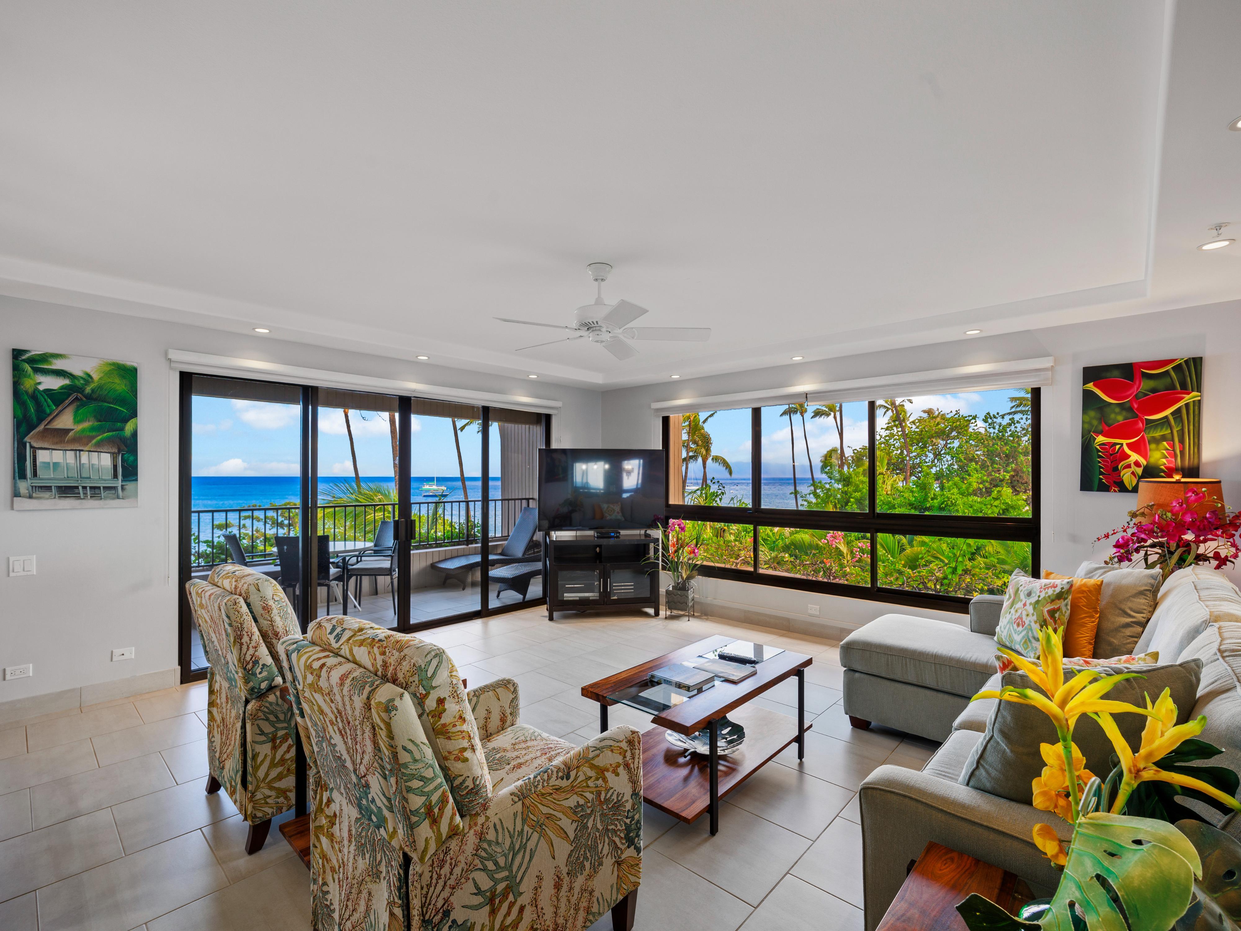 Welcome to Kaanapali Alii 135, a vibrant two-bedroom oceanfront condo that brings the energy and beauty of Maui indoors. Bright emerald green granite countertops, tropical plants, and patterned armchairs infuse the space with cheerful island charm, while walls of windows ensure sparkling Pacific Ocean views are never out of sight. Step onto the private lanai to sip your morning coffee as the sun rises over the waves or enjoy a tranquil evening watching the ocean shimmer in the sunset.
