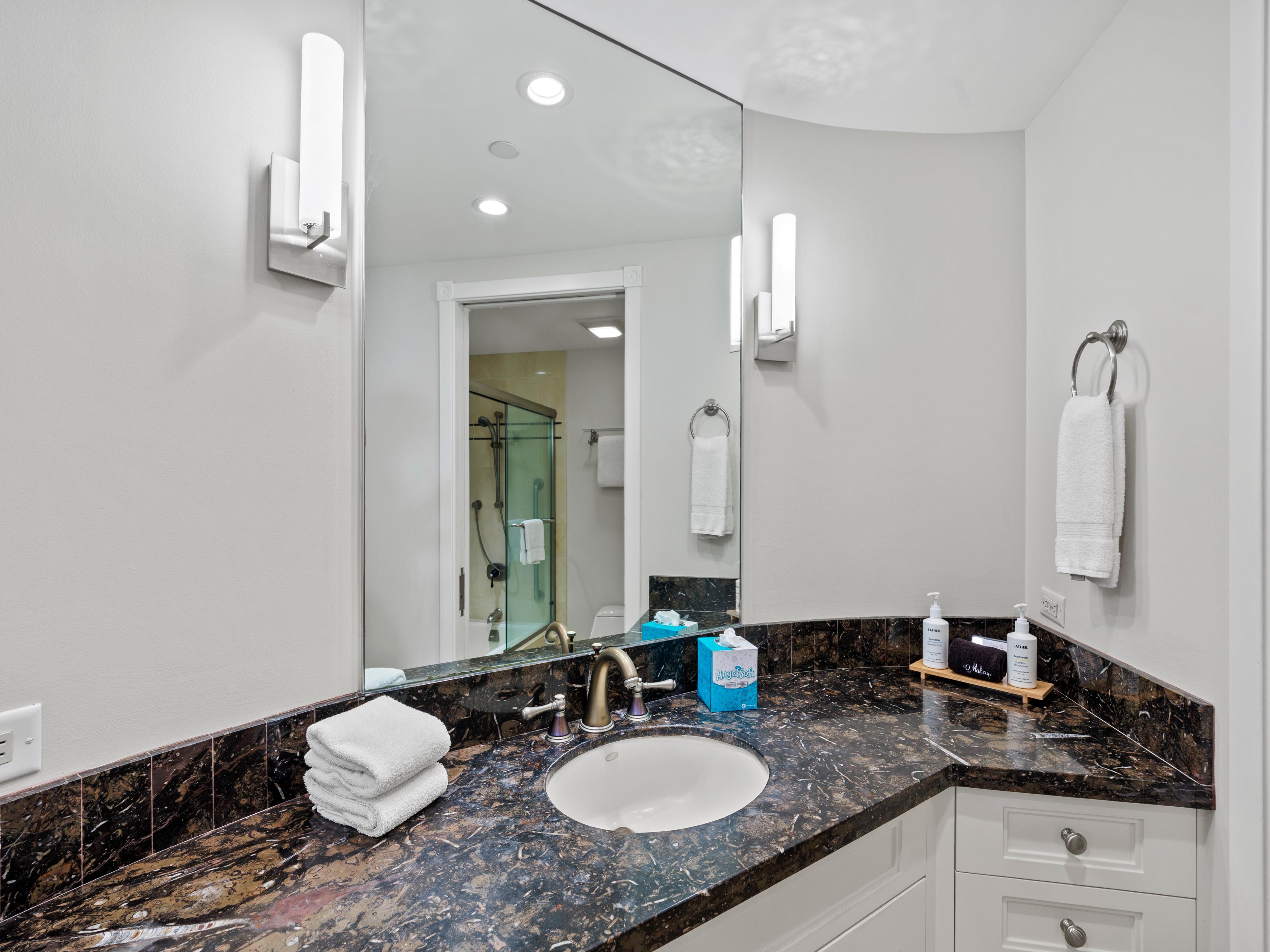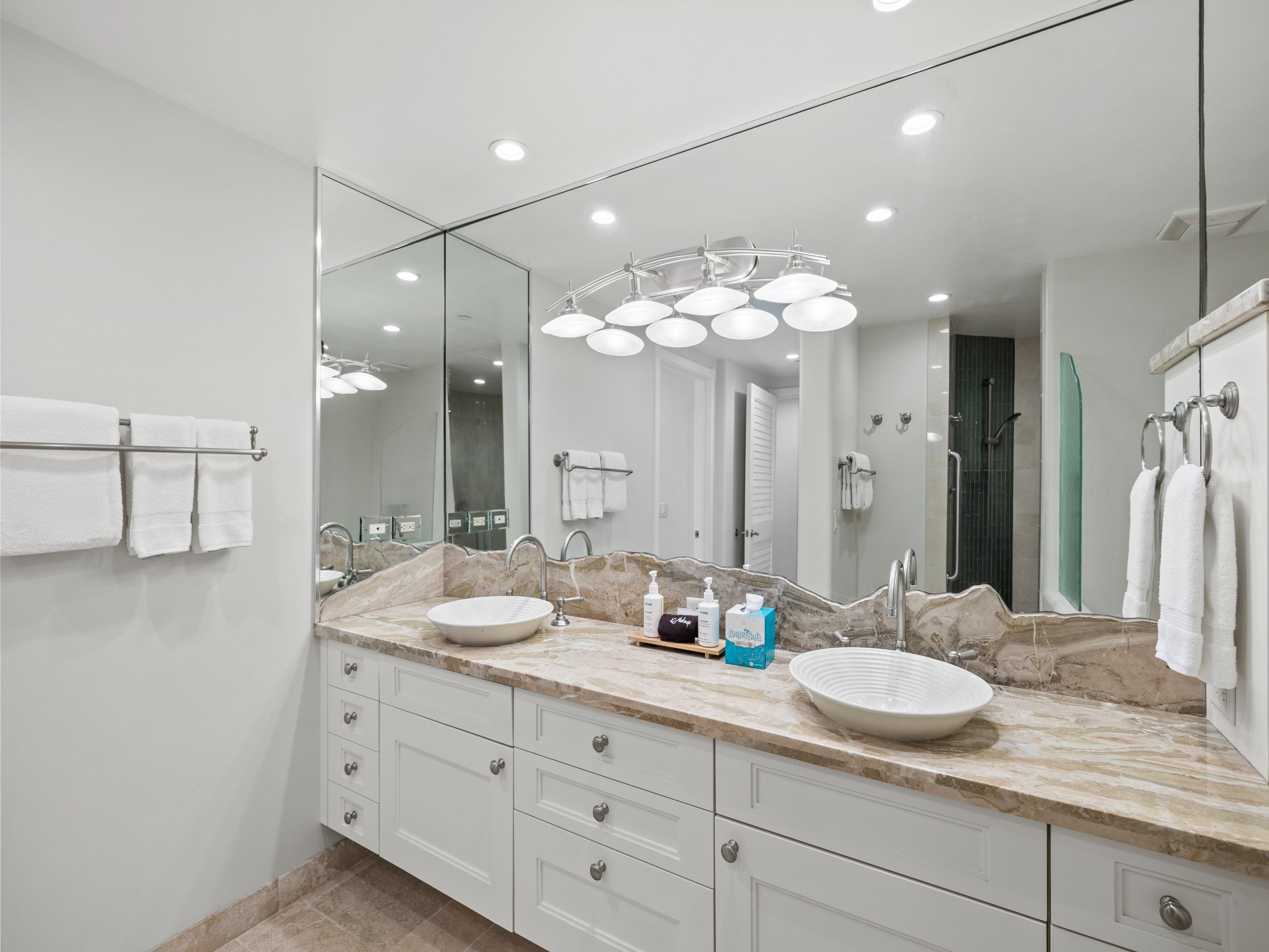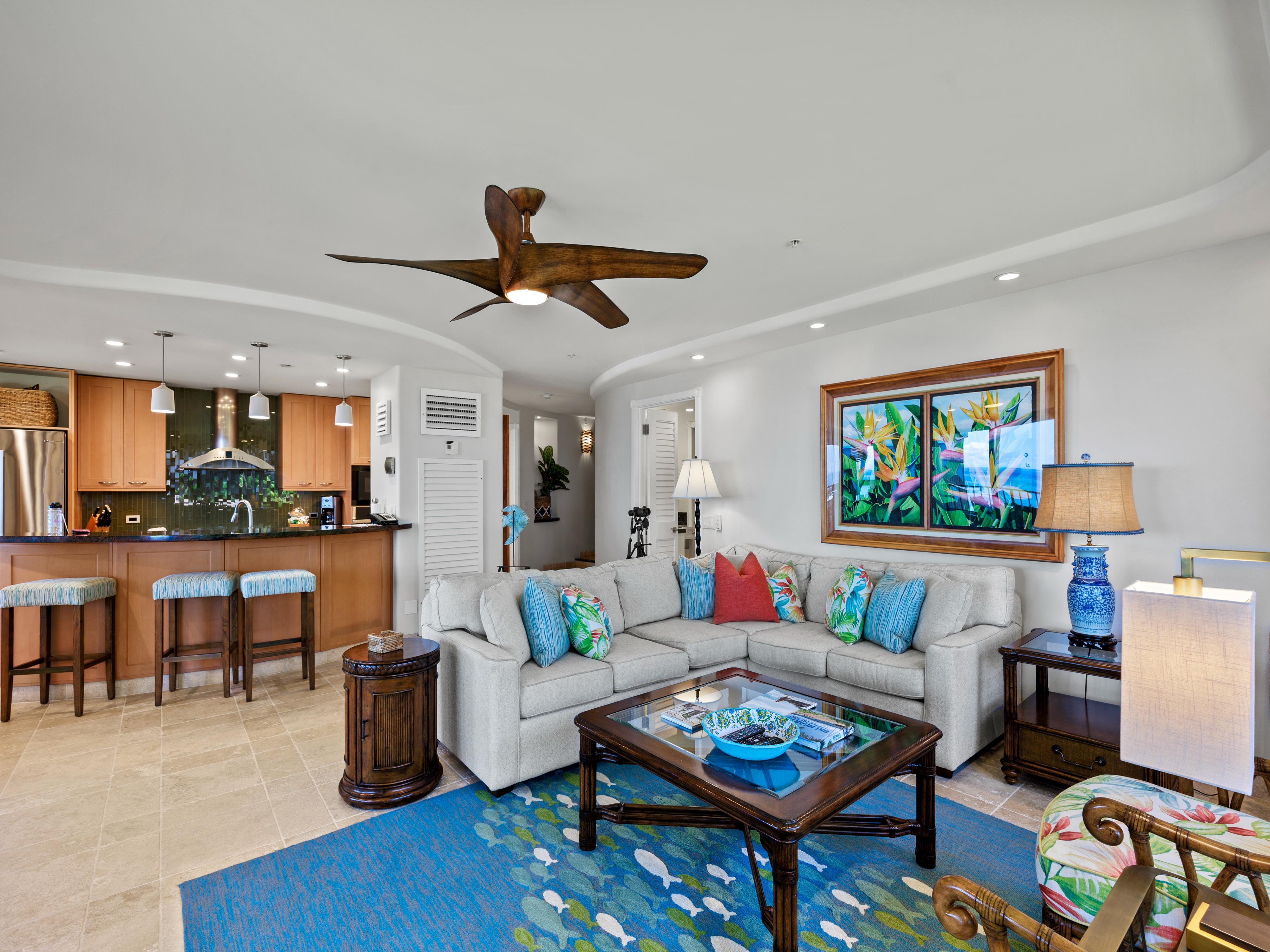 Inside, the interiors are wonderfully contemporary with pops of color that mimic the beauty of Hawaiian wildlife. At 1,845 square feet, this condo is truly spacious with room for up to six guests to relax comfortably. The open floorplan design seamlessly connects each room for a feeling of signature Hawaiian togetherness.