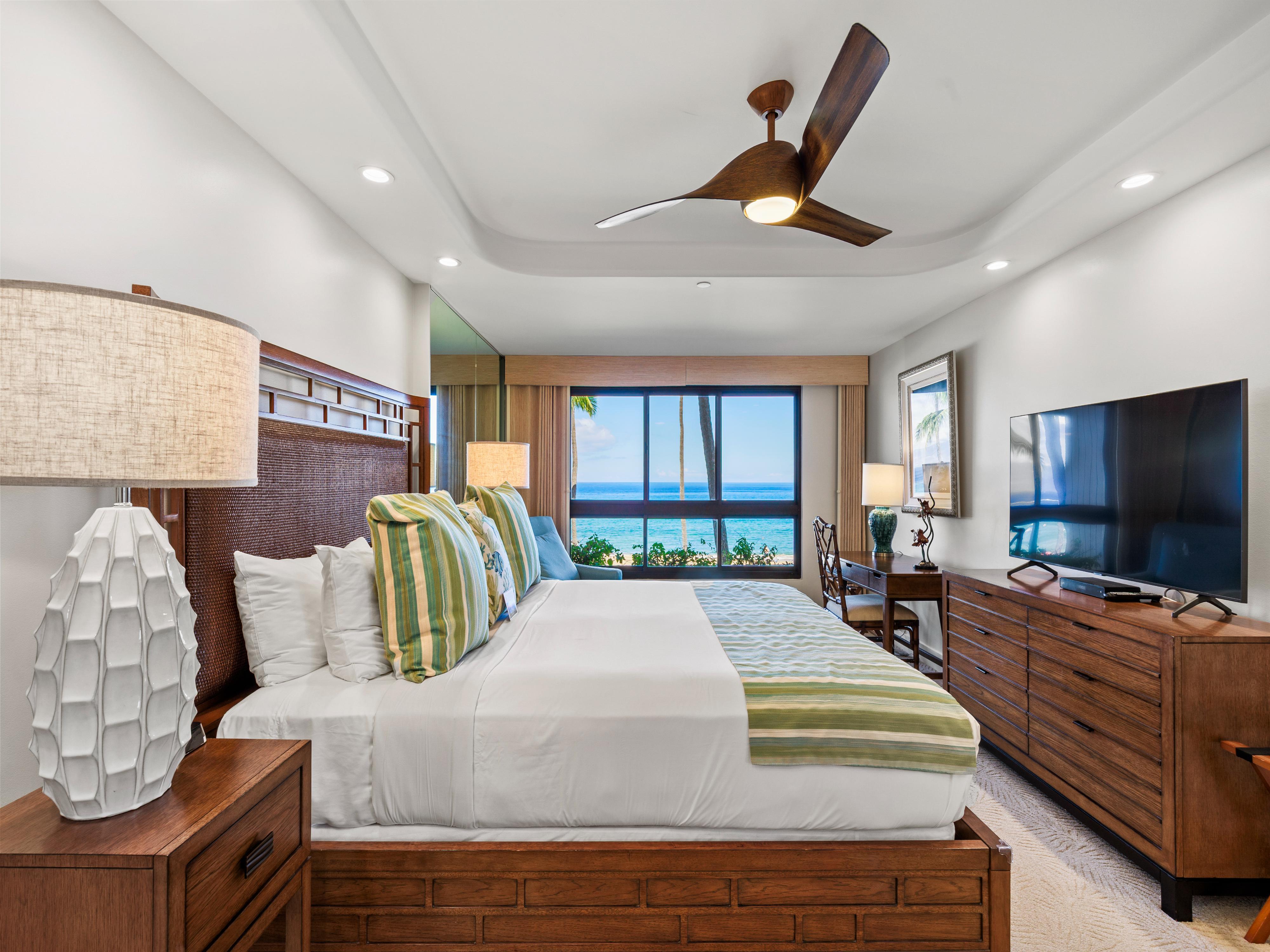 This two-bedroom oceanfront condo offers beautiful ocean views from all rooms! Enjoy an unobstructed look at the gleaming pacific and the golden Kaanapali Beach, plus a peek at the neighboring islands of Lana'i and Molokai. Because this condo is located in the corner of the resort tower fronting the ocean, one is able to enjoy the beach and ocean from one view and the pool and ocean from another.