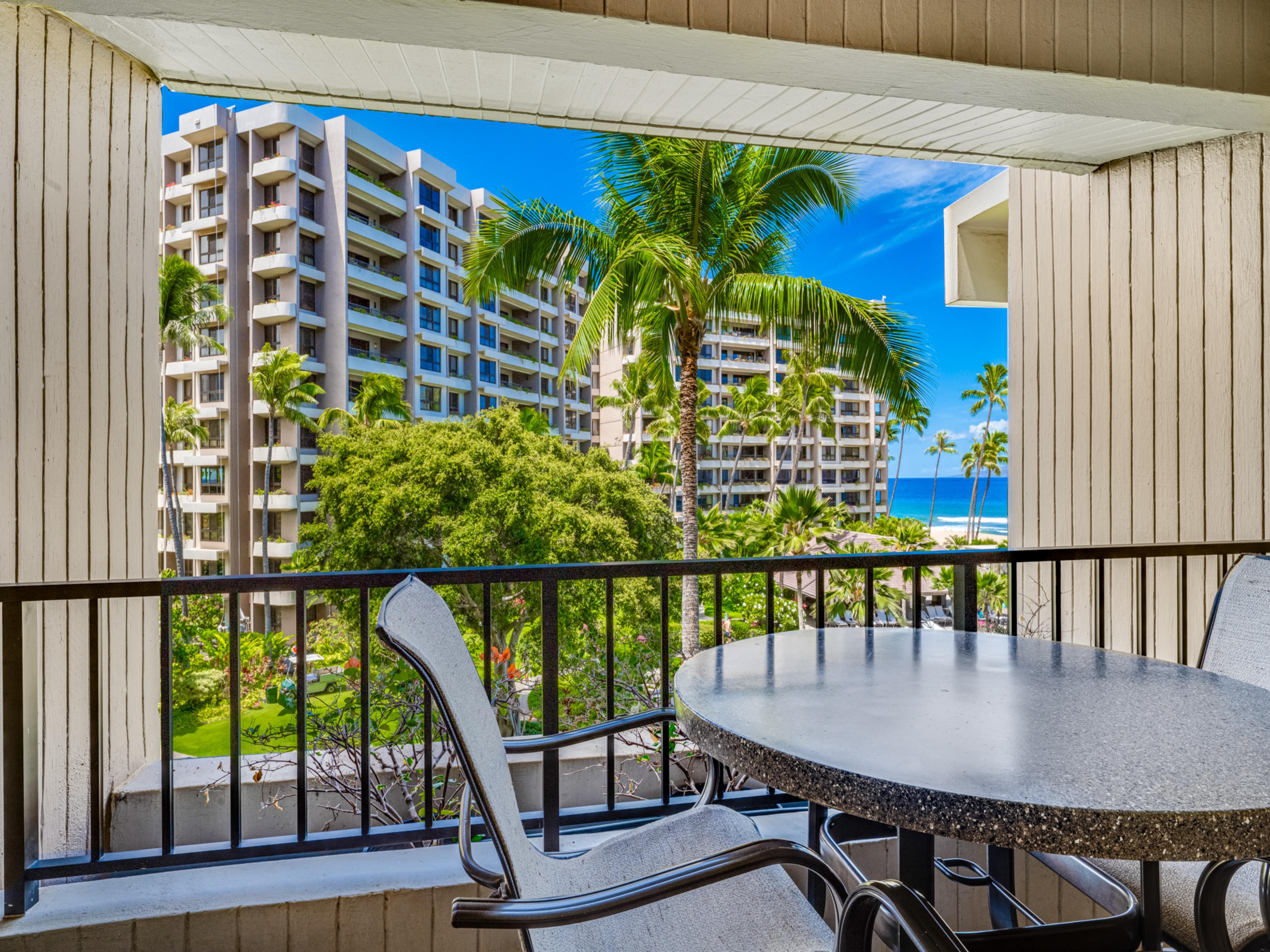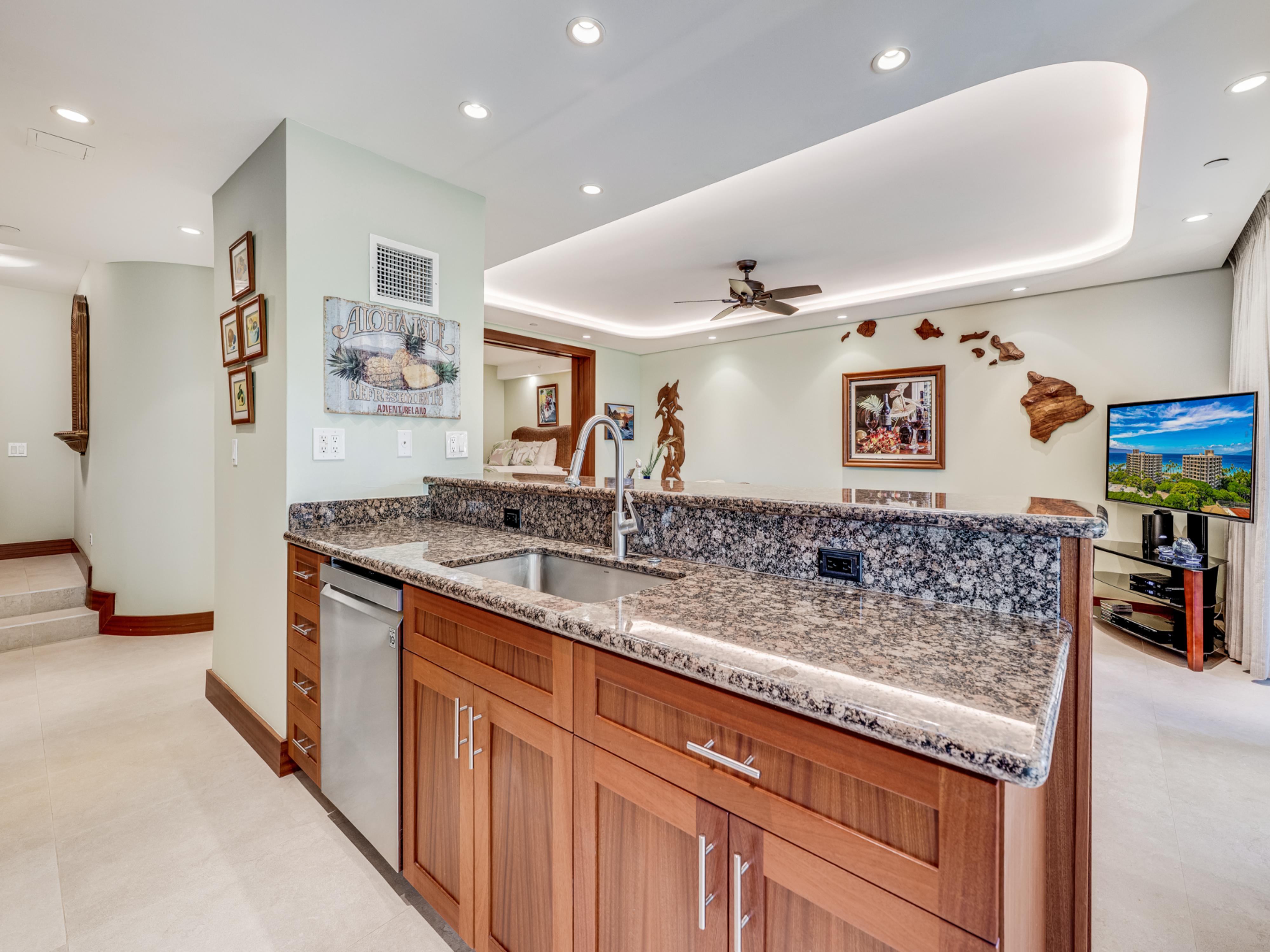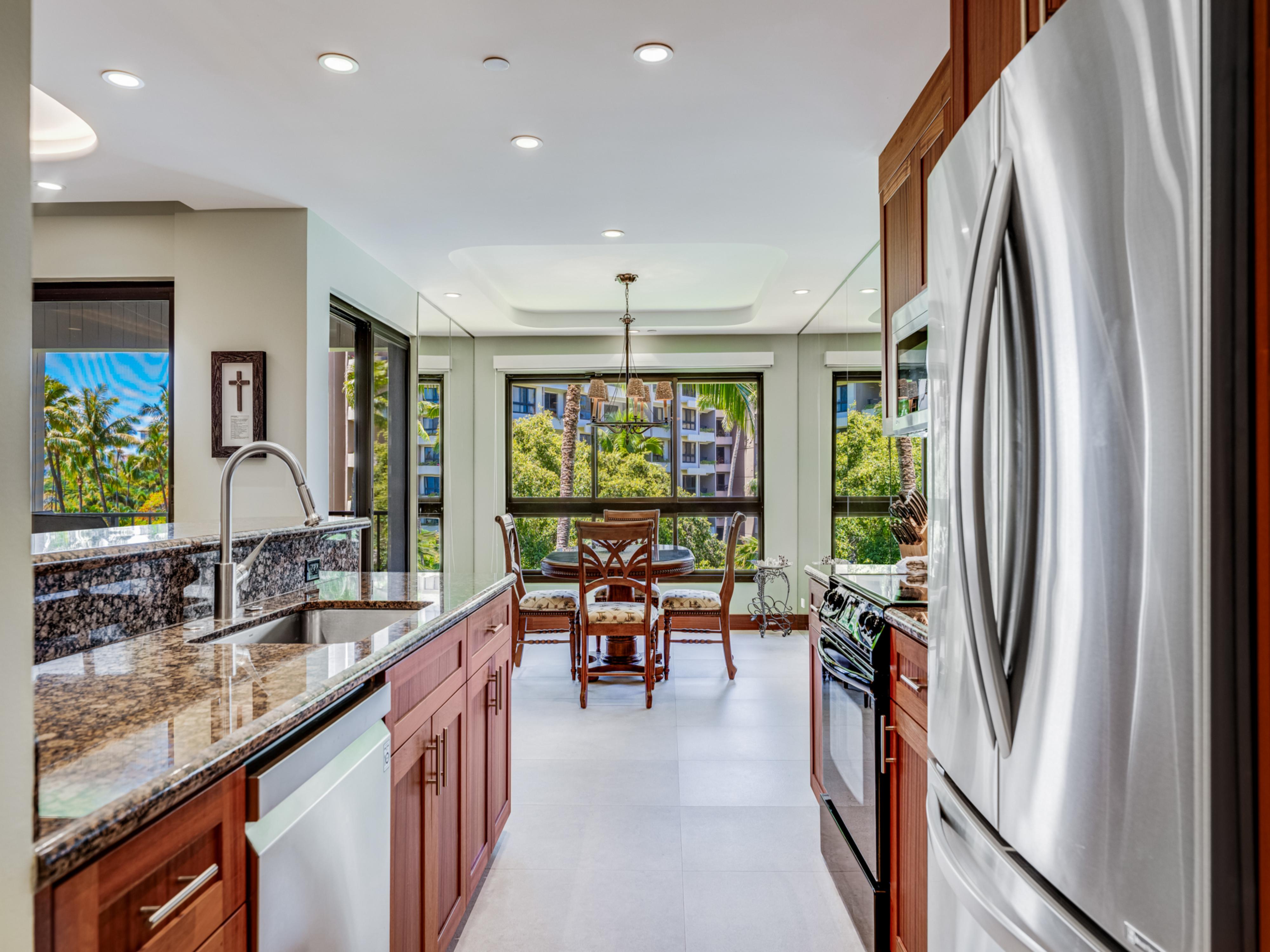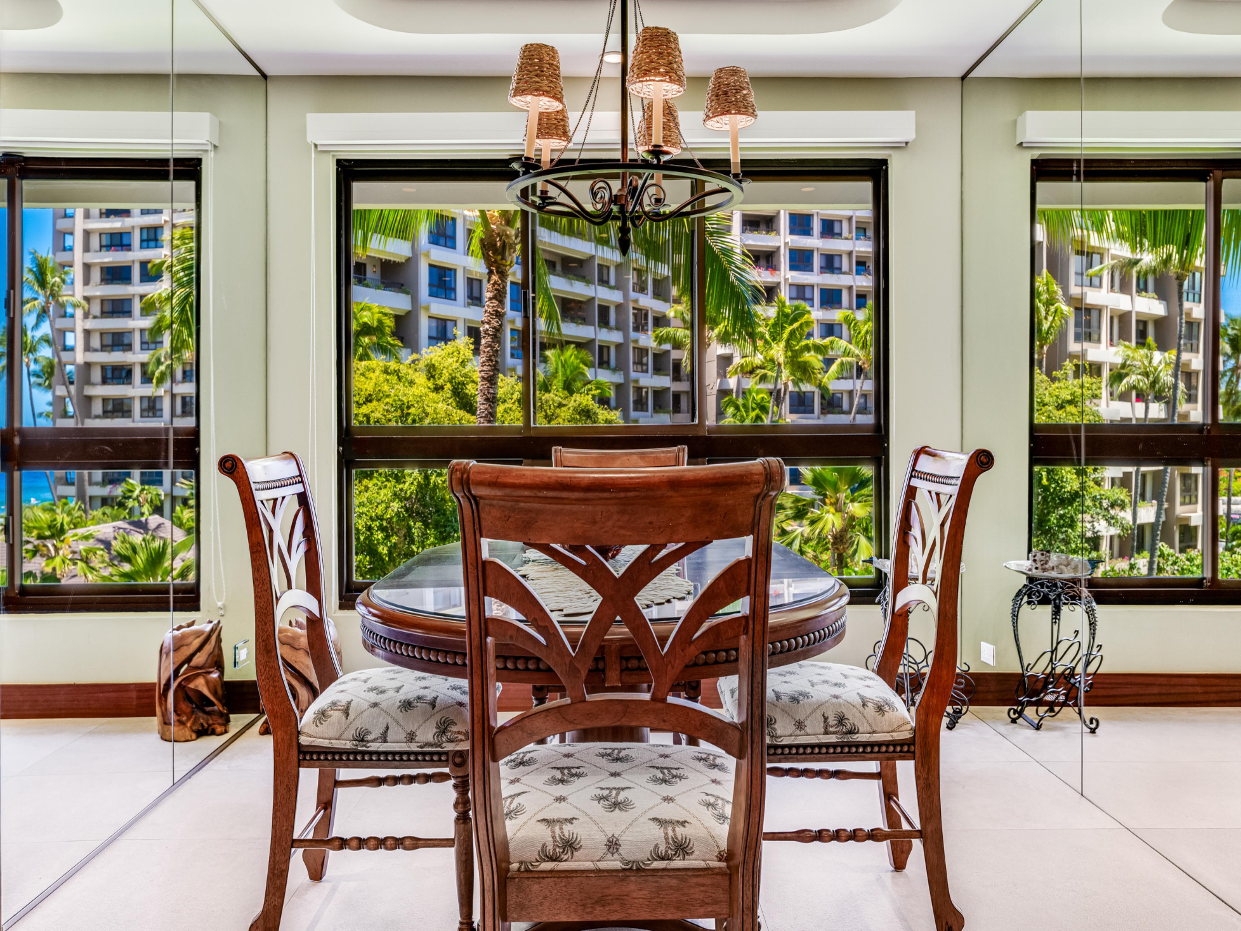 From the private lanai, take in the lush tropical grounds and sparkling white sands of Ka'anapali Beach. The open layout seamlessly connects the living, dining, and kitchen areas, creating a welcoming space to relax and enjoy island life.