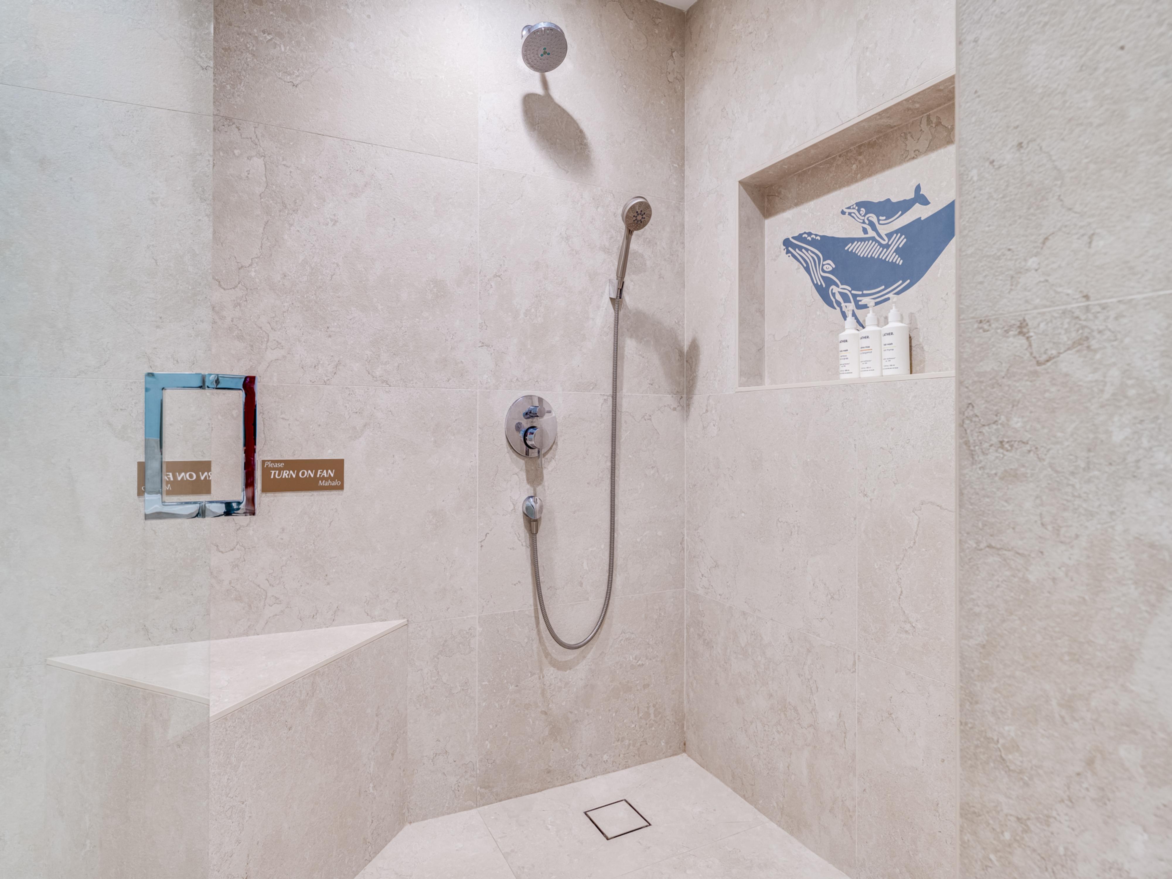 The kitchen is fully equipped with stainless steel appliances, granite countertops, and everything needed to prepare a snack, share a meal, or host a small gathering. The primary bedroom features a king bed, a cozy reading nook framed by large windows, and an en suite bathroom with a separate bathtub—perfect for bathing kids after a day at the beach. The den includes a queen bed and can be closed off with sliding doors for added privacy.