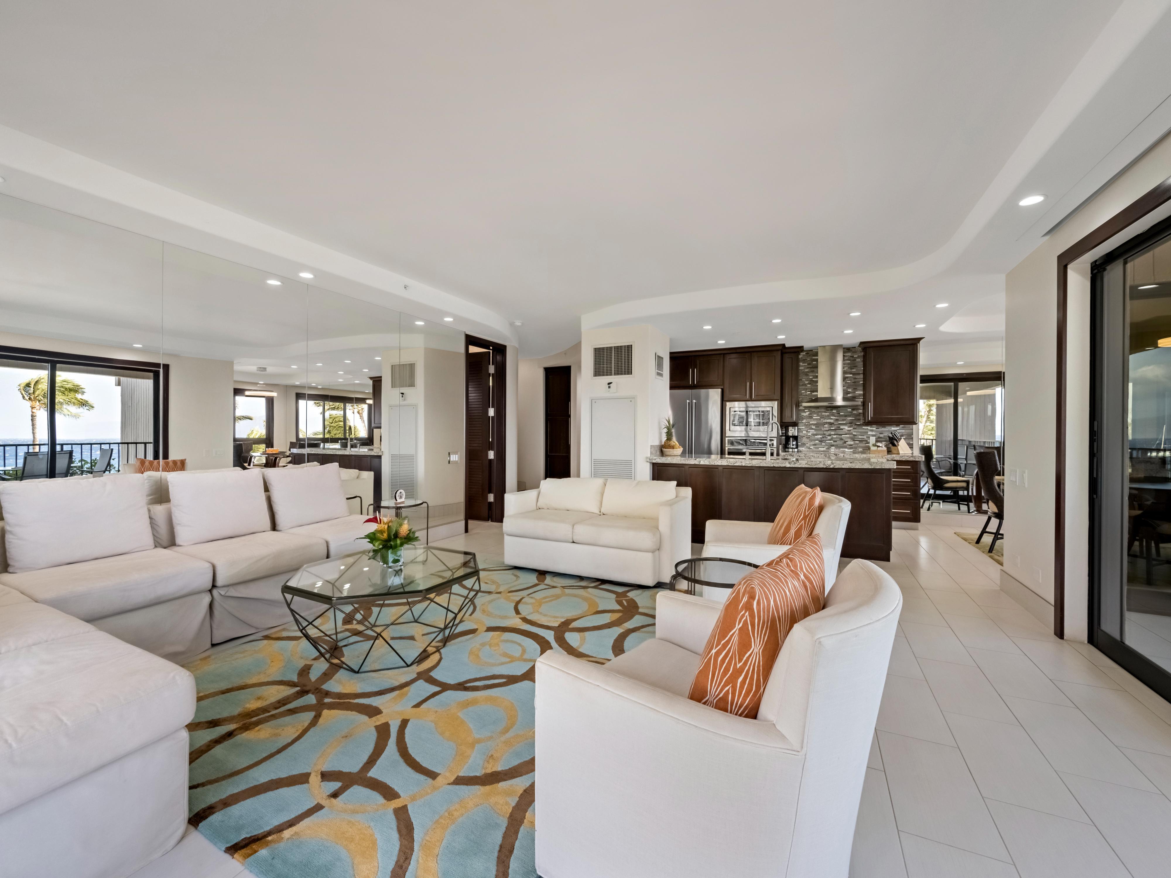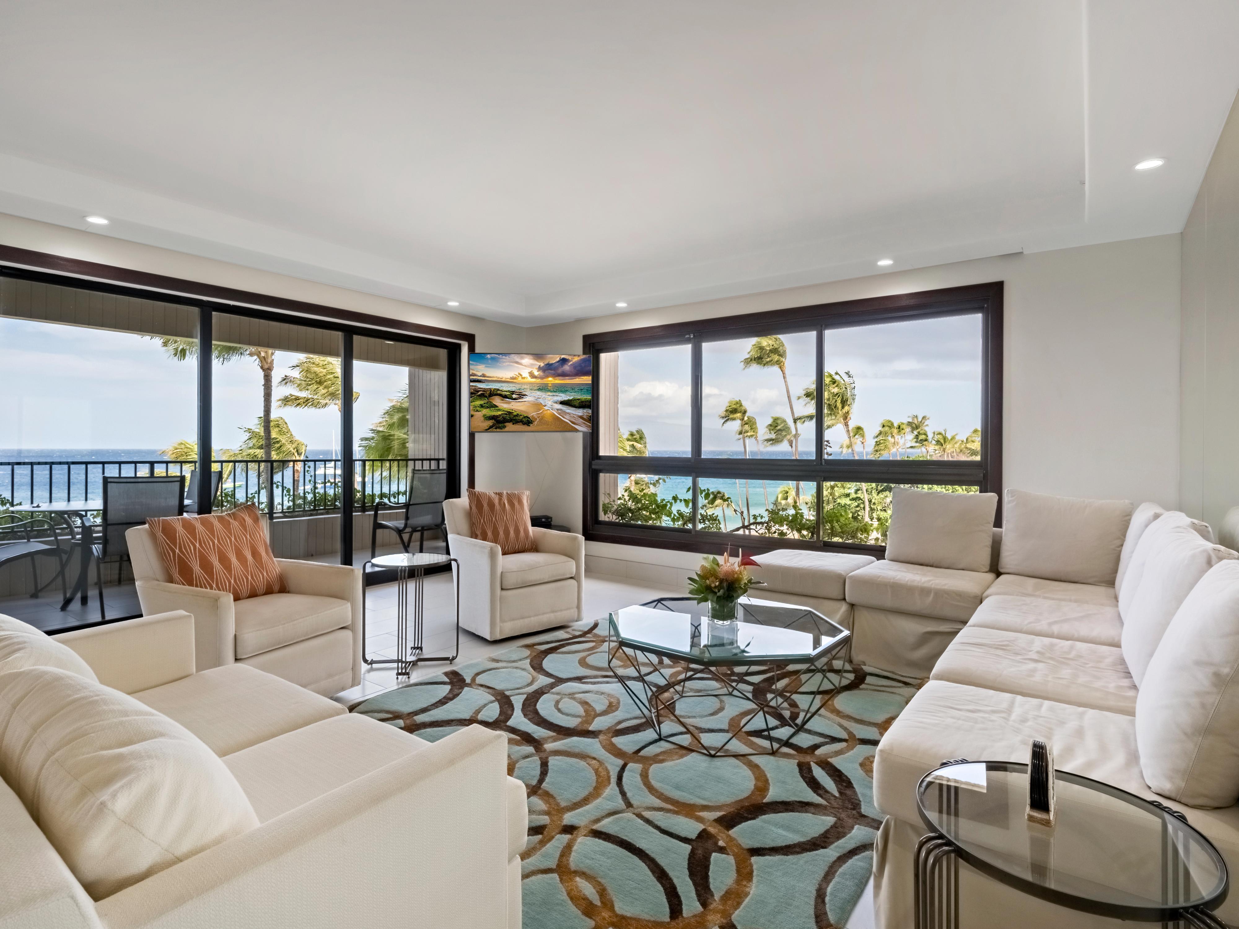 The spacious living area is designed with your comfort in mind, featuring tasteful modern decor and furnishings. Take a moment to unwind on the expansive lanai, where you can soak up the warm Hawaiian sun or enjoy a refreshing drink while listening to the soothing sounds of the waves crashing against the shore.