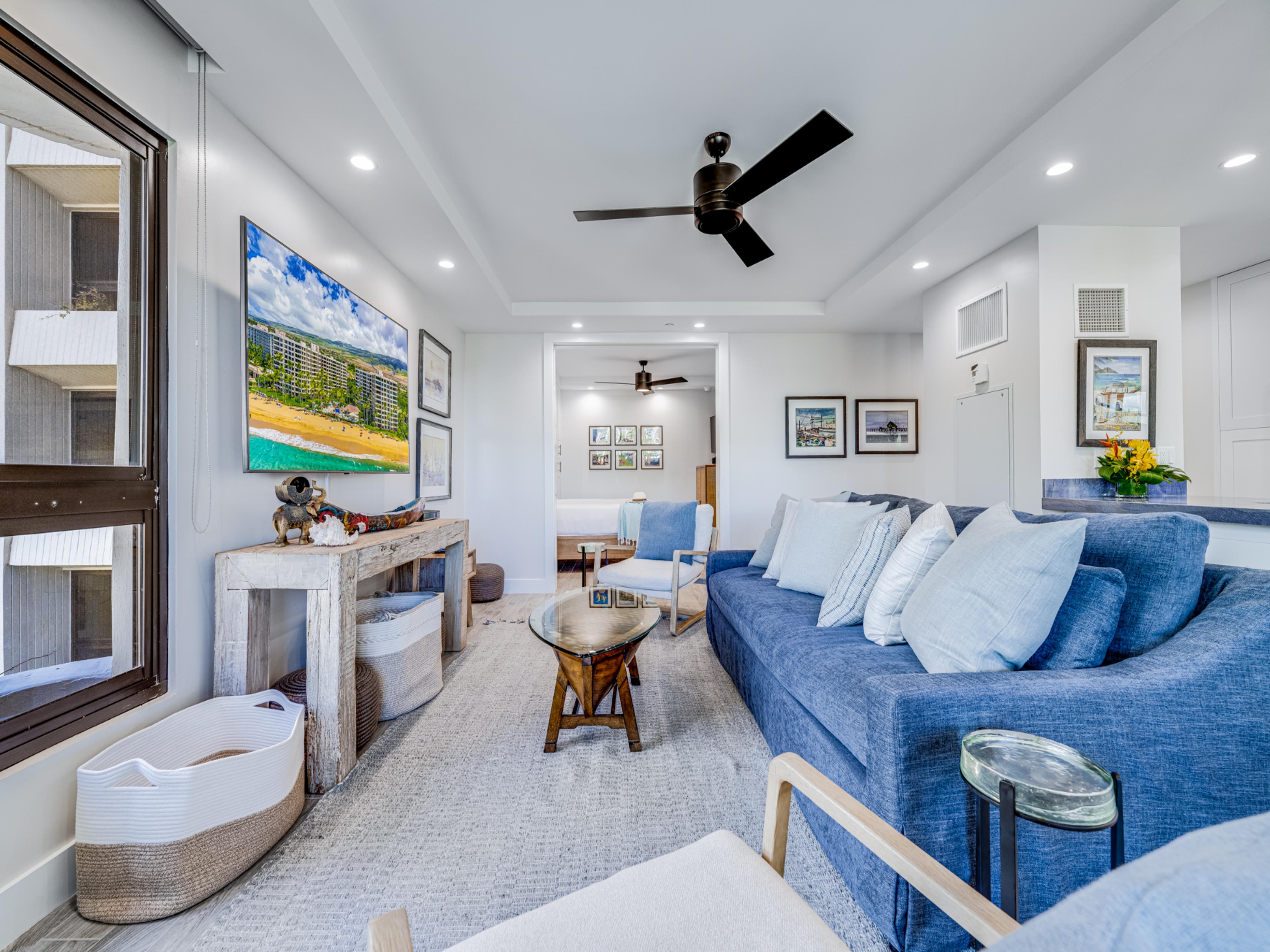 Welcome to Kaanapali Alii 171, a beautifully renovated one-bedroom partial ocean view vacation rental with a fully enclosed den that comfortably serves as a second bedroom. This stunning residence has been thoughtfully updated with light, bright, and airy finishes throughout, including a beautifully refreshed kitchen featuring blue countertops and a matching backsplash that bring a subtle touch of island-inspired color into the space. The large open floor plan is perfect for entertaining and enjoying indoor-outdoor living, with the great room seamlessly connecting the living area, dining space, and kitchen.