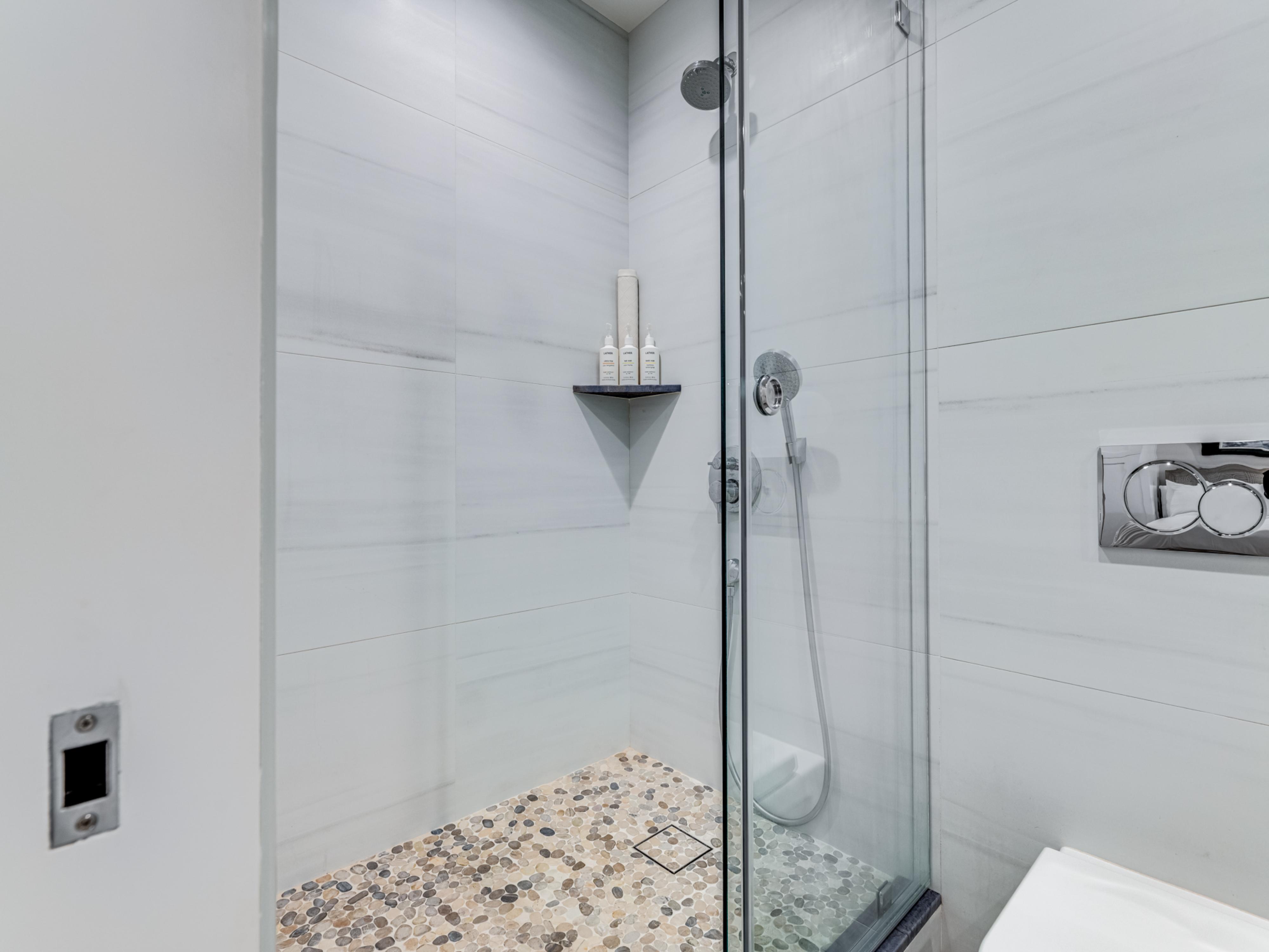 The primary bedroom is a tranquil retreat with a lounge sofa ideal for reading, along with a workstation for those needing to stay connected. The attached bathroom includes a glass-tiled walk-in shower for a luxurious touch. The fully enclosed den, located just off the living room, features sliding divider doors for privacy and its own en-suite bathroom with a private shower.