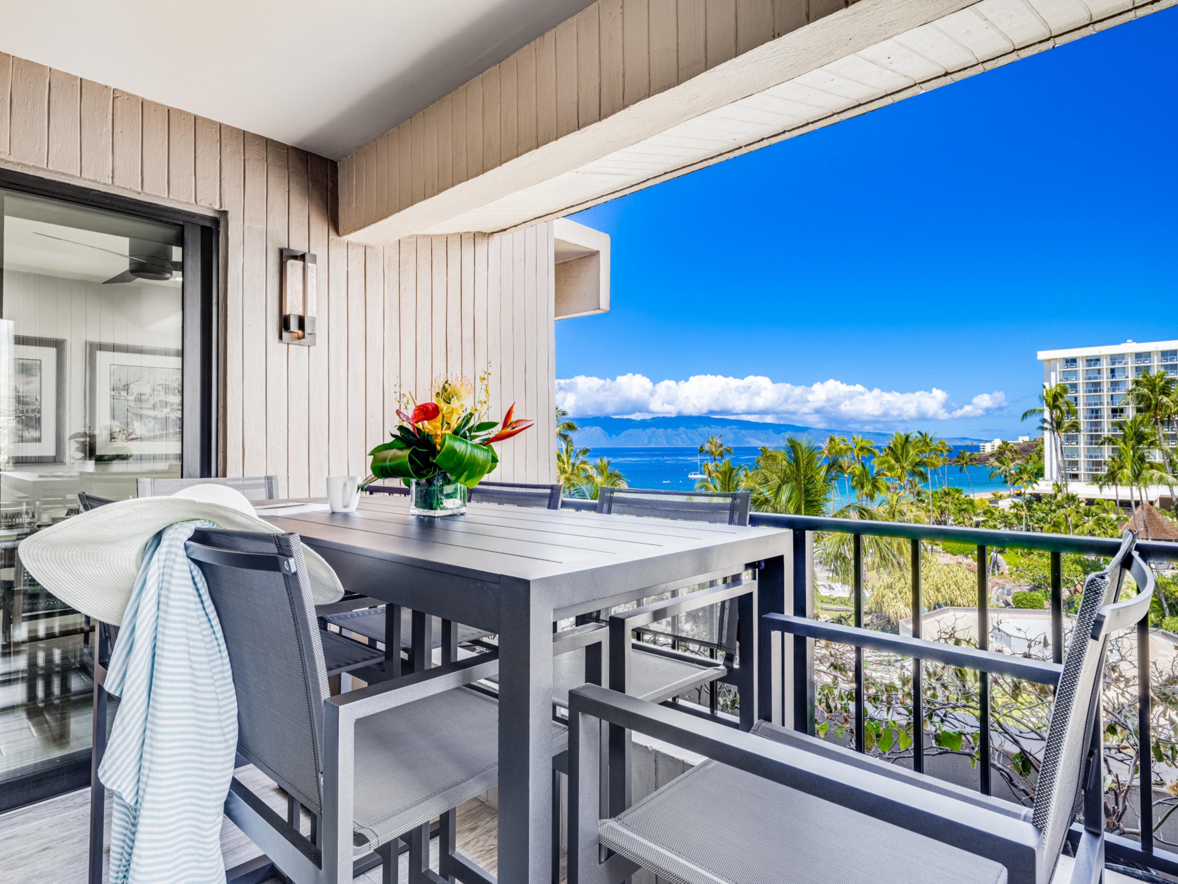 The fully equipped kitchen boasts stainless steel appliances, granite surfaces, light cabinetry, and two barstools, while the dining area comfortably seats six. The living room is furnished with a large, cozy sofa and two lounge chairs, creating an ideal space for unwinding after a day of exploring. Step outside onto the private lanai, where you can savor partial ocean views while dining at the high-top table for six.