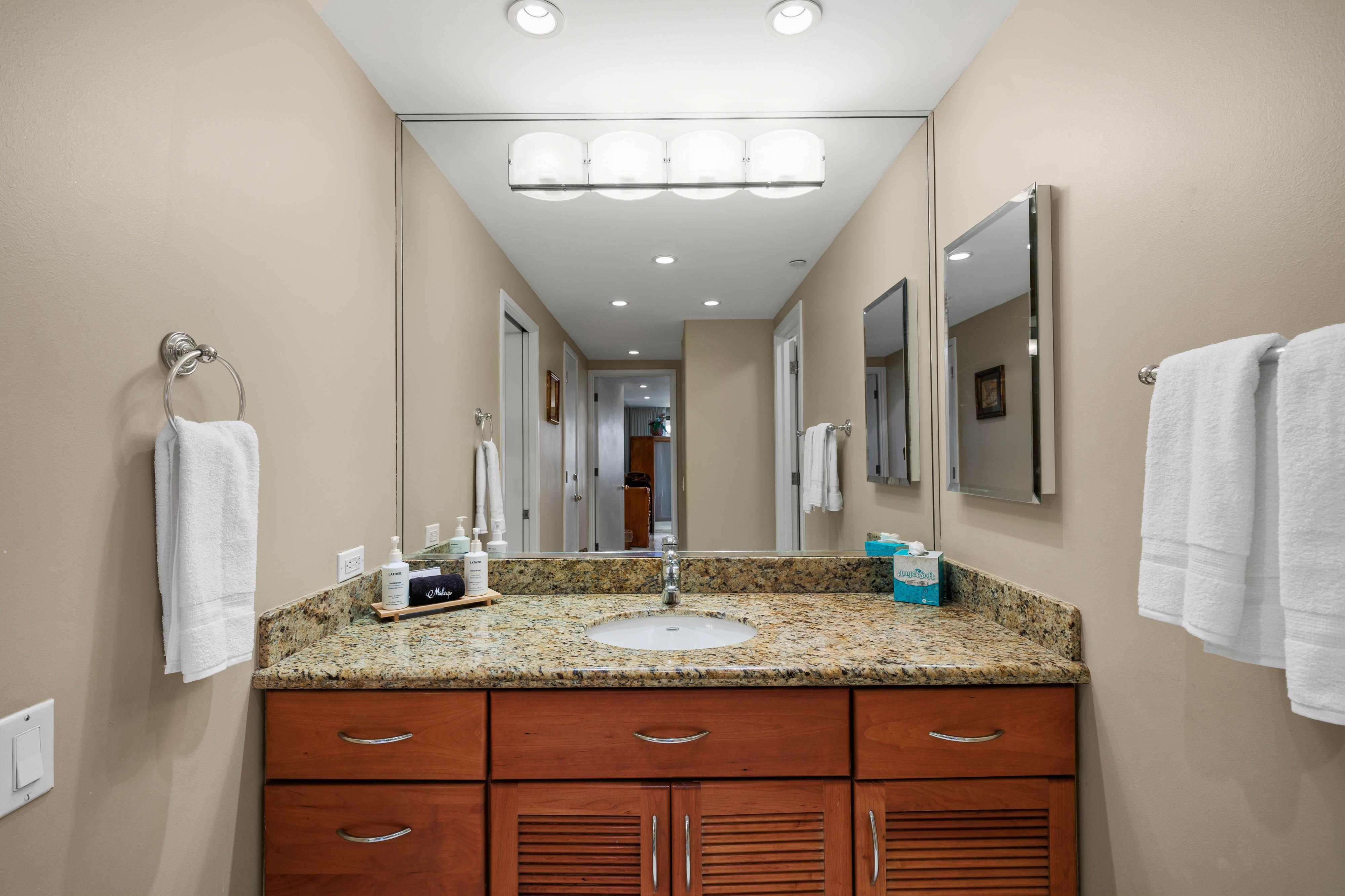 The fully equipped kitchen makes it easy to prepare meals or enjoy takeout from nearby Whaler’s Village, with seating for six between the dining table and breakfast bar. A full washer and dryer add convenience for longer stays, while TVs, central air conditioning, and complimentary Wi-Fi ensure modern comfort throughout your visit.