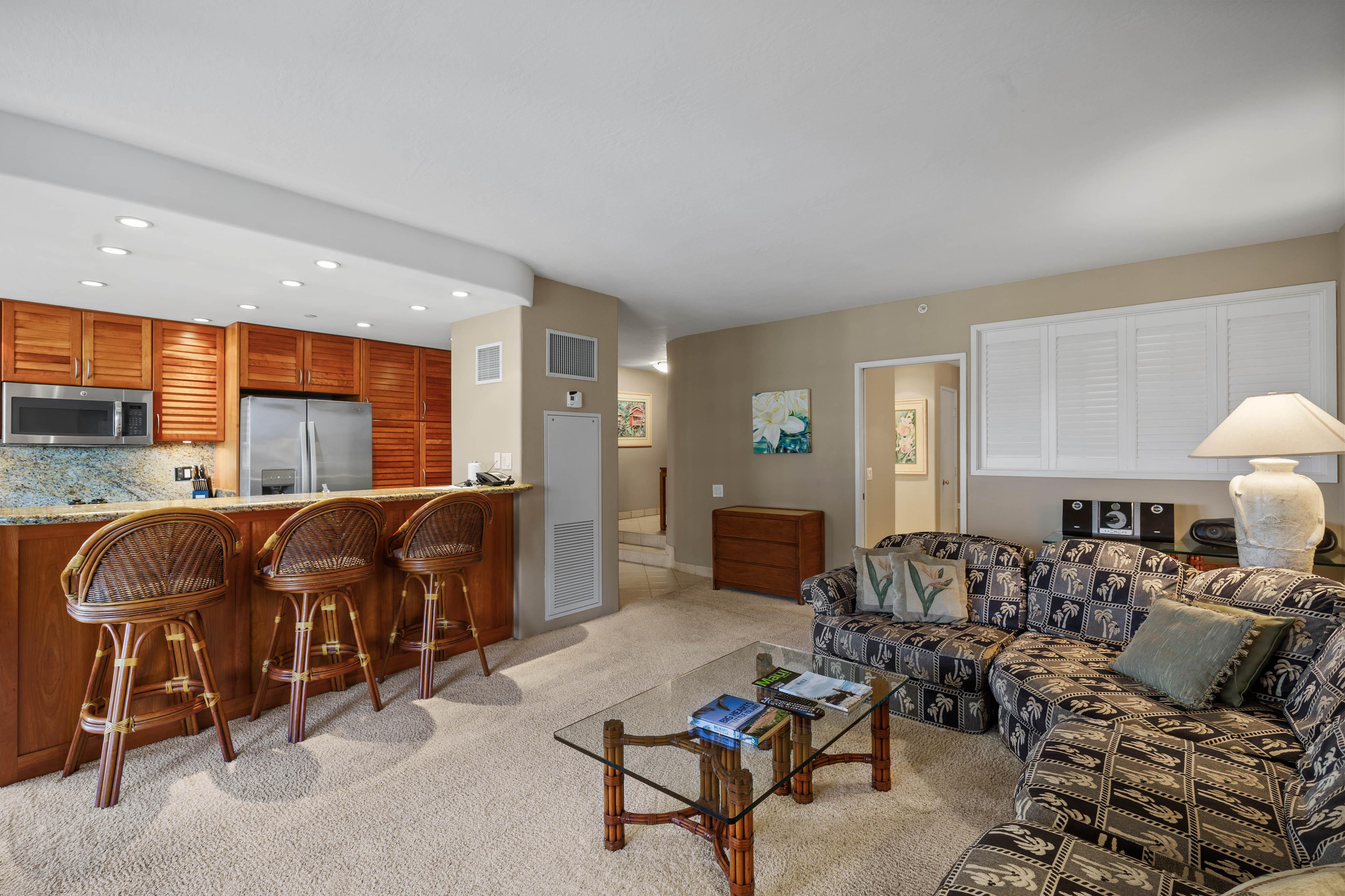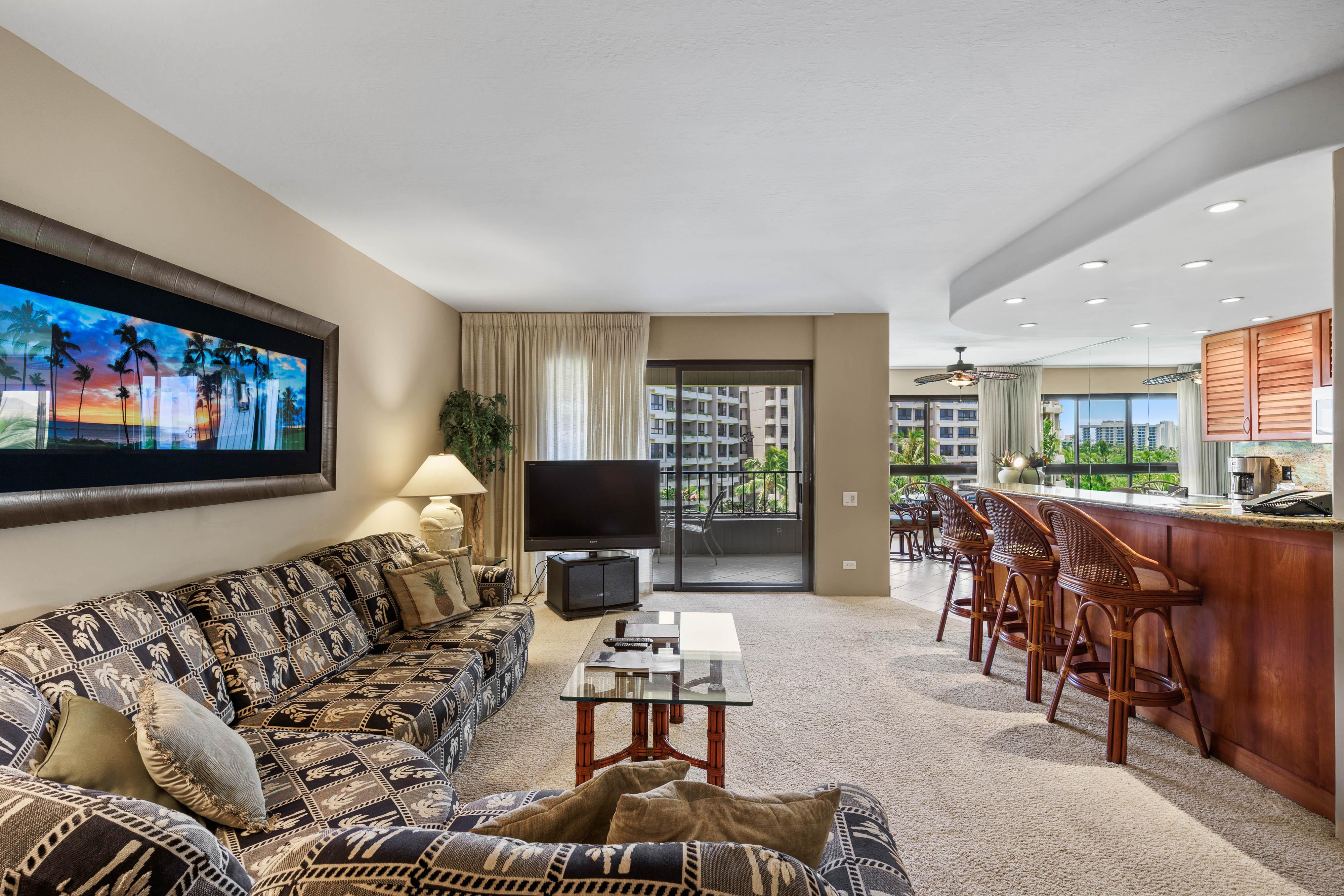 The condo features Hawaiian-inspired décor and comfortable furnishings, creating a true home-away-from-home for up to four guests. The living area is bright and inviting, with a sectional couch and thoughtful island touches that set a relaxed, welcoming tone.