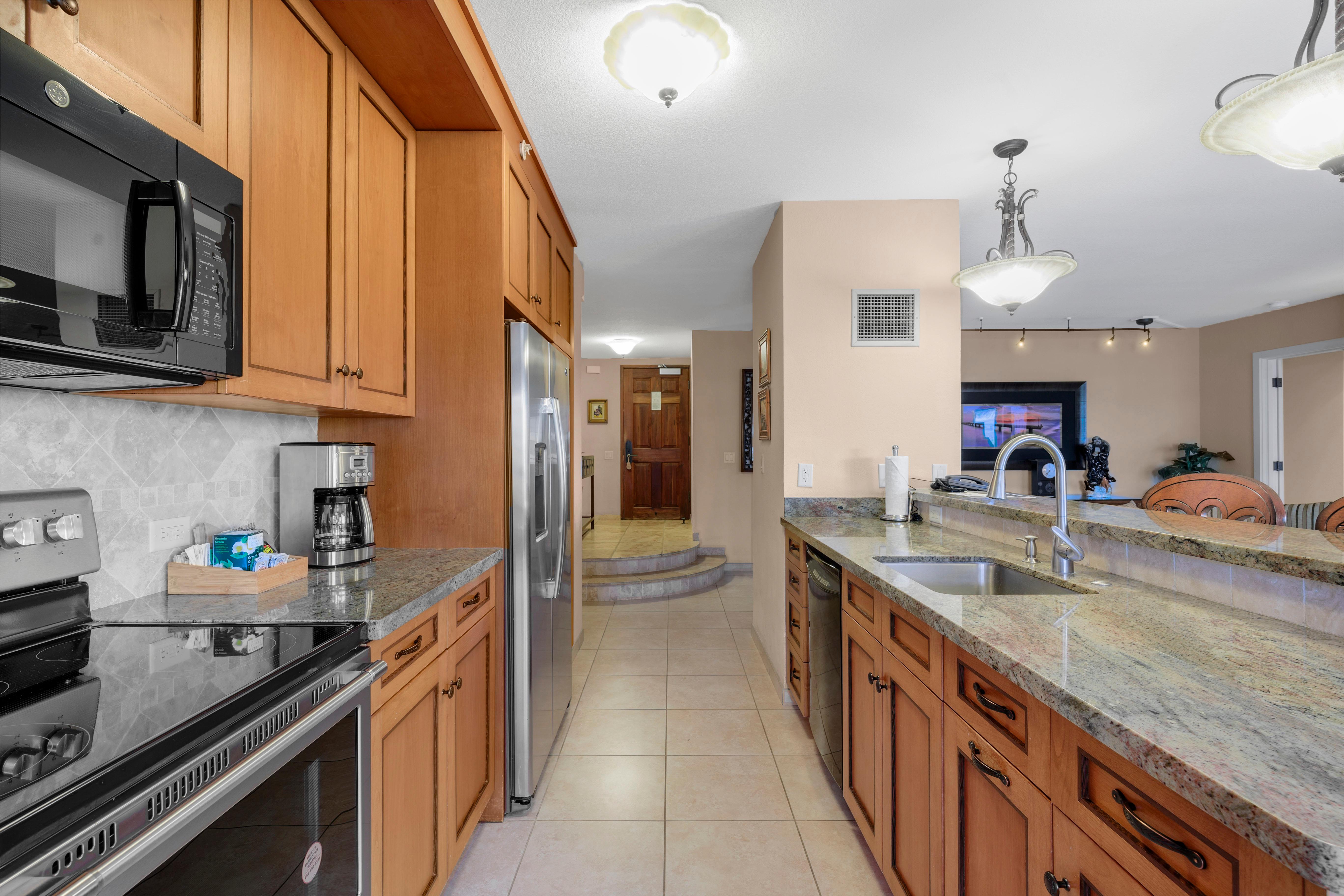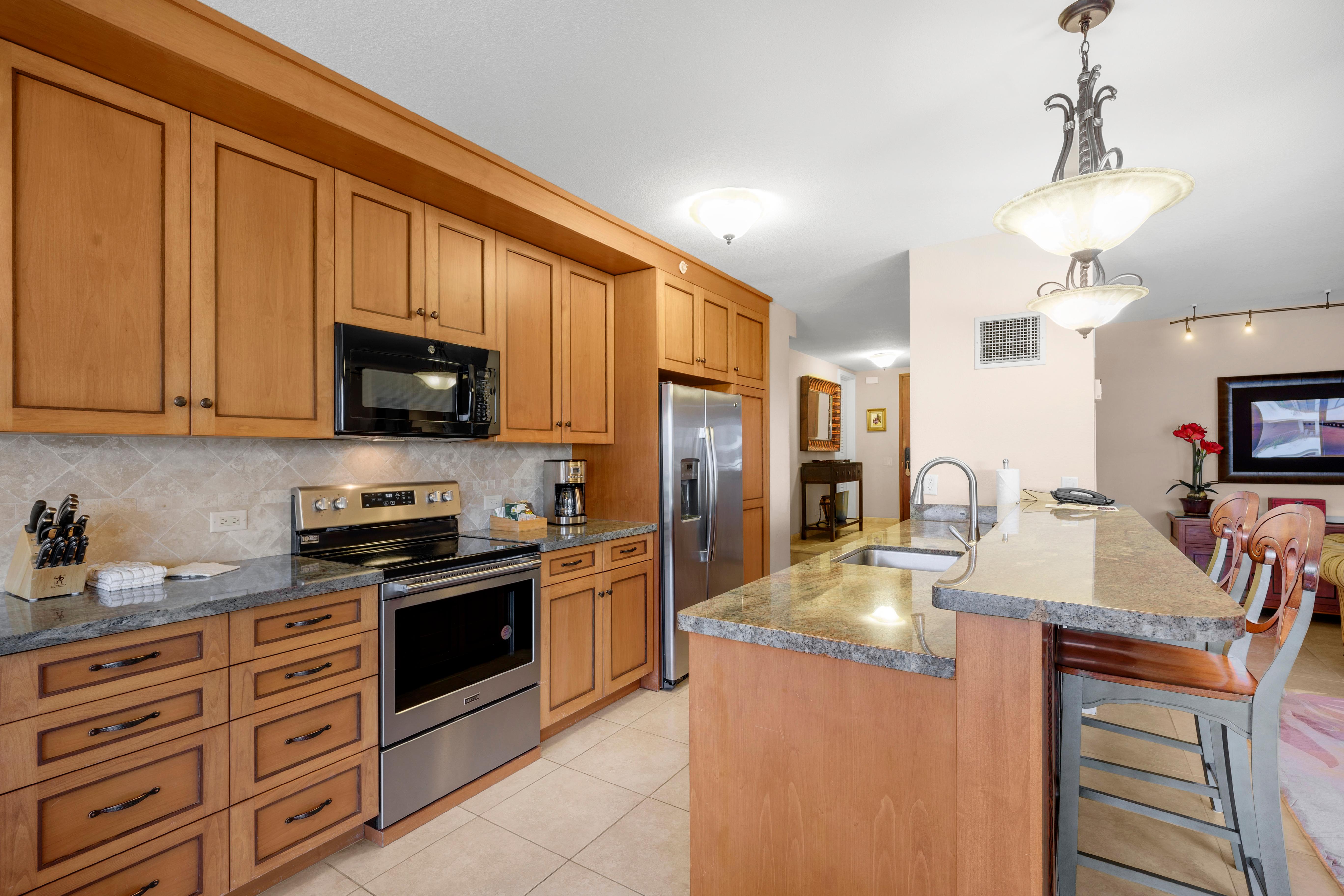 Inside, the residence features warm, island-inspired décor with a touch of vintage character, offering a cozy and relaxed atmosphere. The kitchen is complete with granite countertops, stainless steel appliances, and all the essentials for preparing your favorite meals. Dine casually at the breakfast bar, gather at the dining table, or enjoy an alfresco meal on the lanai as you soak in Maui’s gentle breezes.