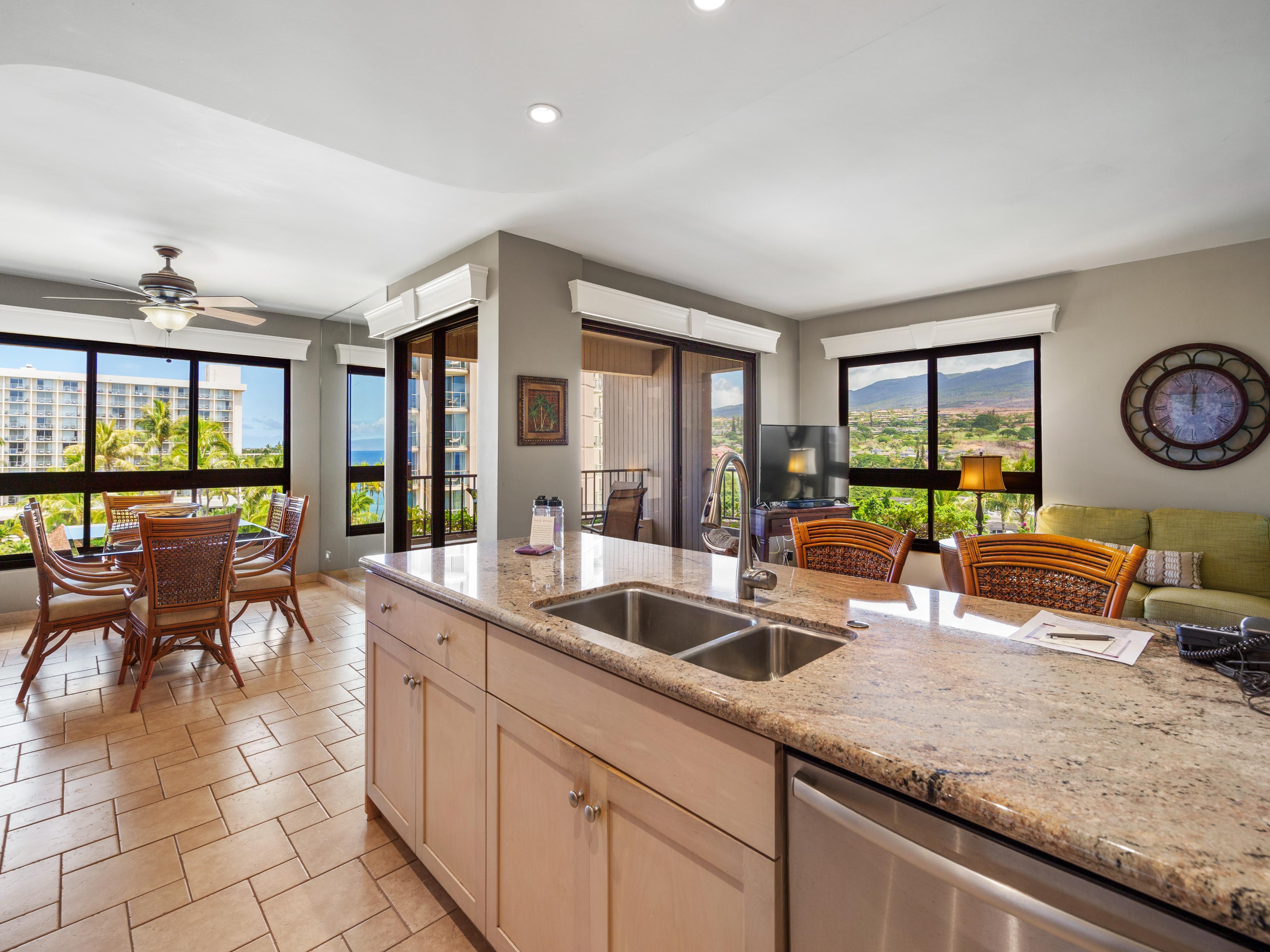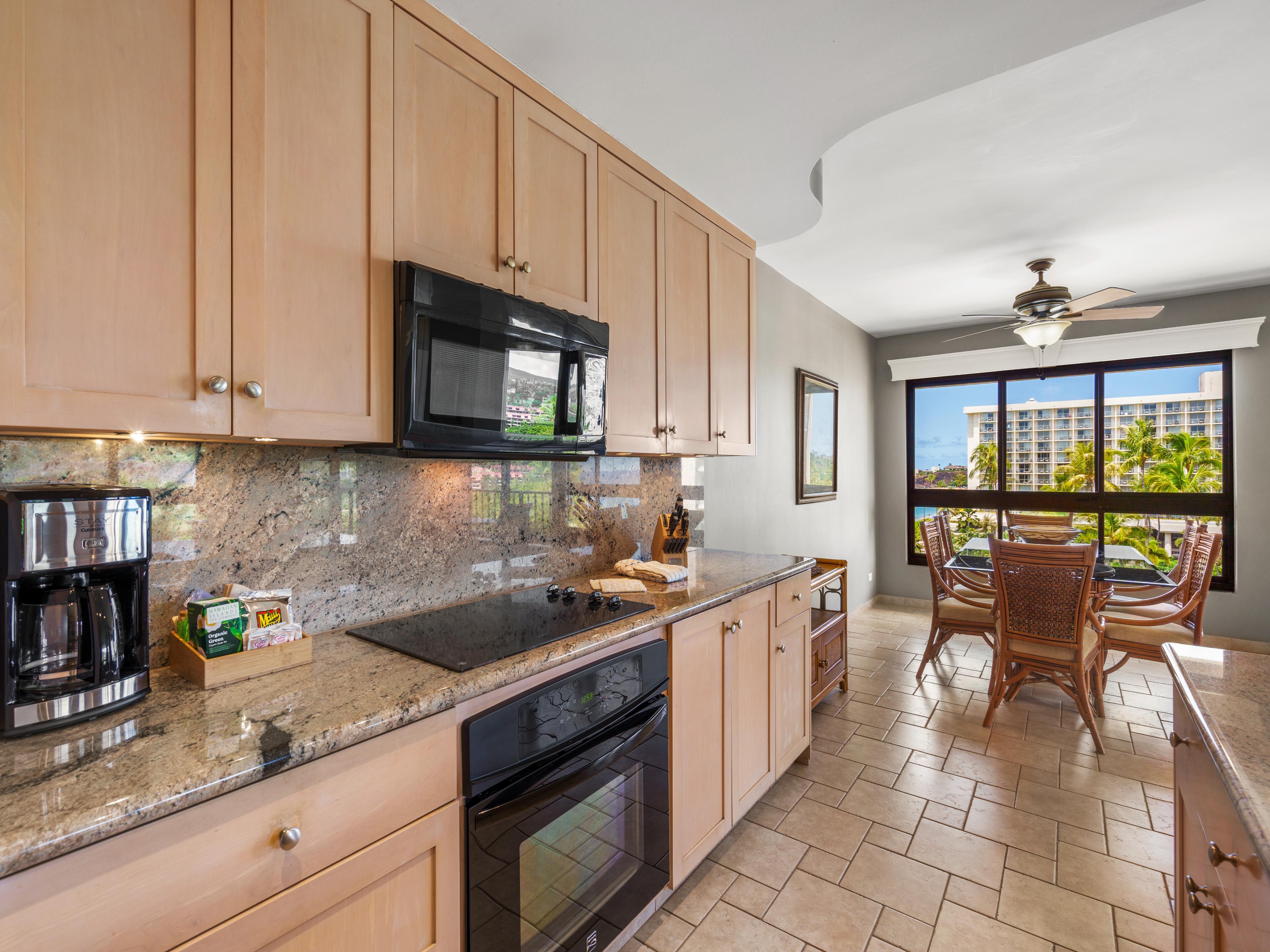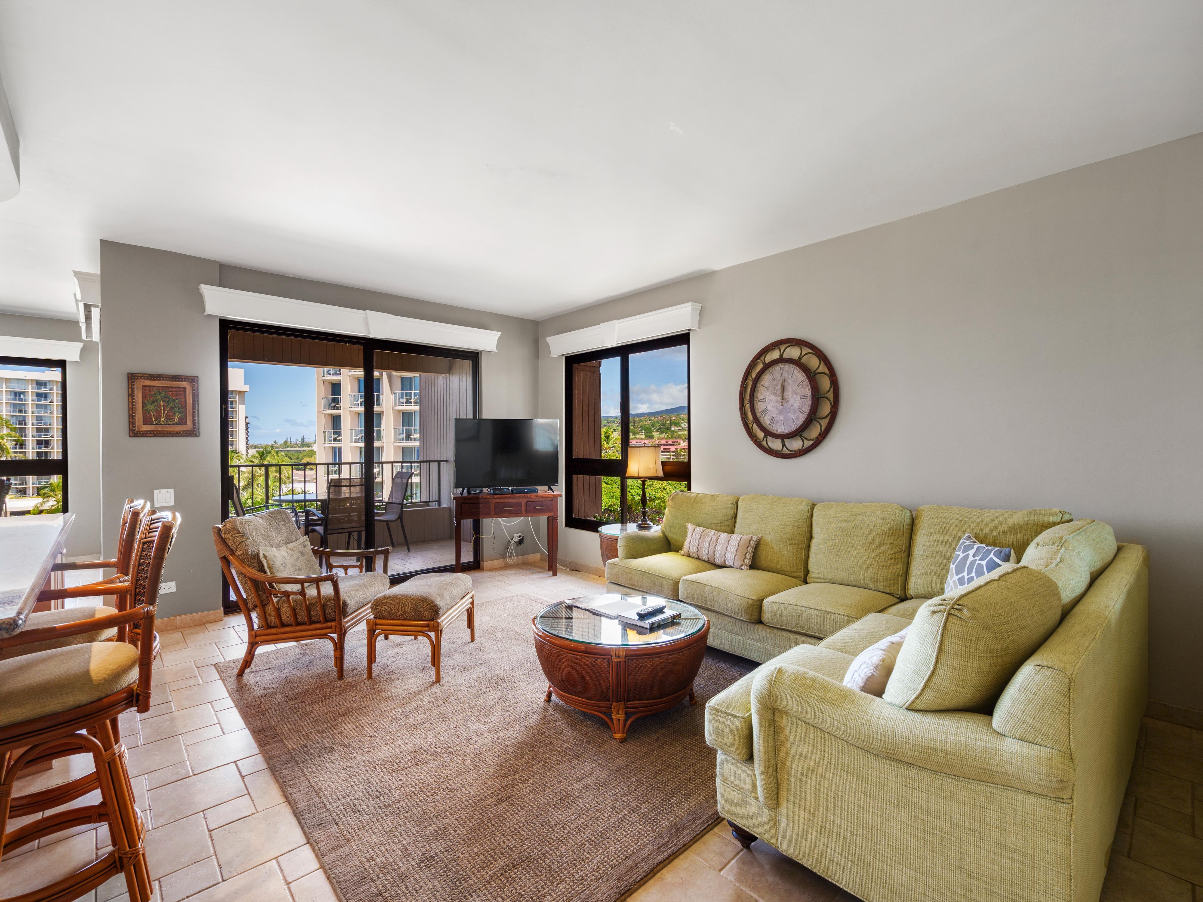 This 1,544 sq. ft. residence offers bright and airy interiors with light wood accents and thoughtfully designed living spaces, perfect for relaxing after a day on Ka'anapali Beach. The living area and bedroom are open and comfortable, creating a serene retreat where guests can unwind while taking in the ocean views.