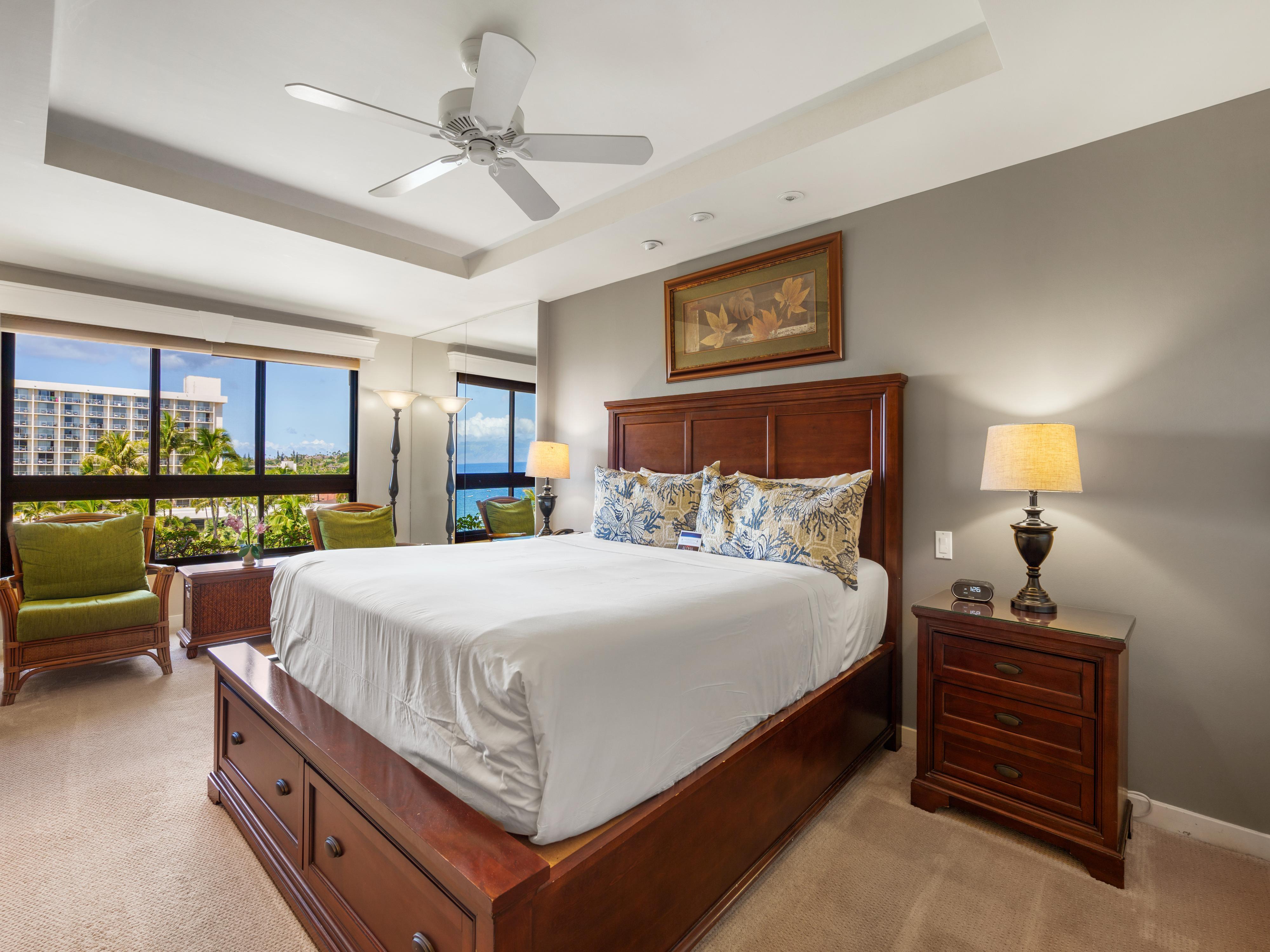 Welcome to Kaanapali Alii 181, located at Maui's exclusive Kaanapali Alii Resort. This is a gorgeous one-bedroom ocean-view condo with a fully enclosed den that comfortably serves as a second bedroom. From the spacious private lanai, enjoy breathtaking views of the Pacific Ocean framed by swaying palm trees and the resort’s lush, manicured grounds. Large windows throughout the condo fill the space with natural light, inviting the beauty of the islands inside.