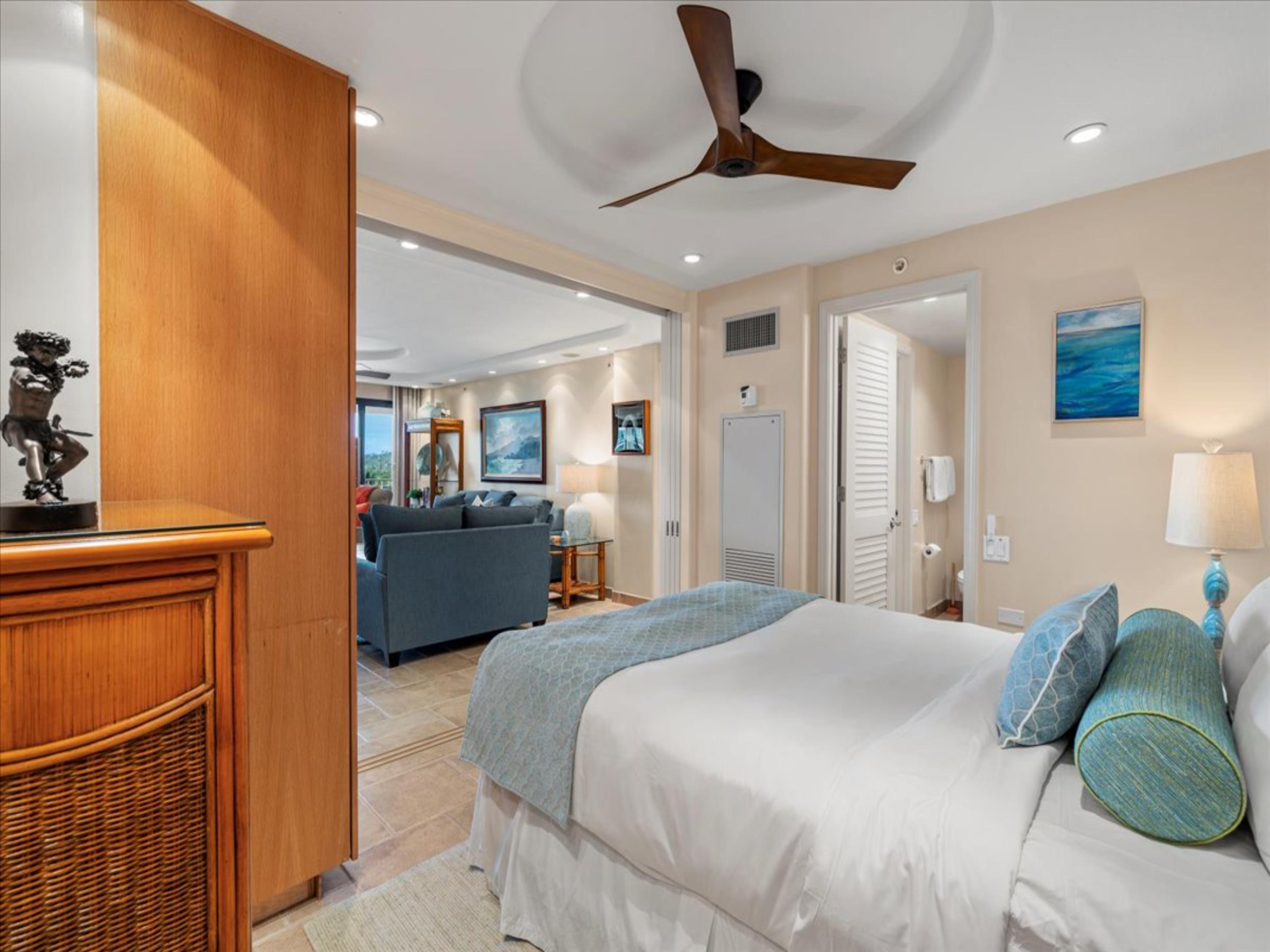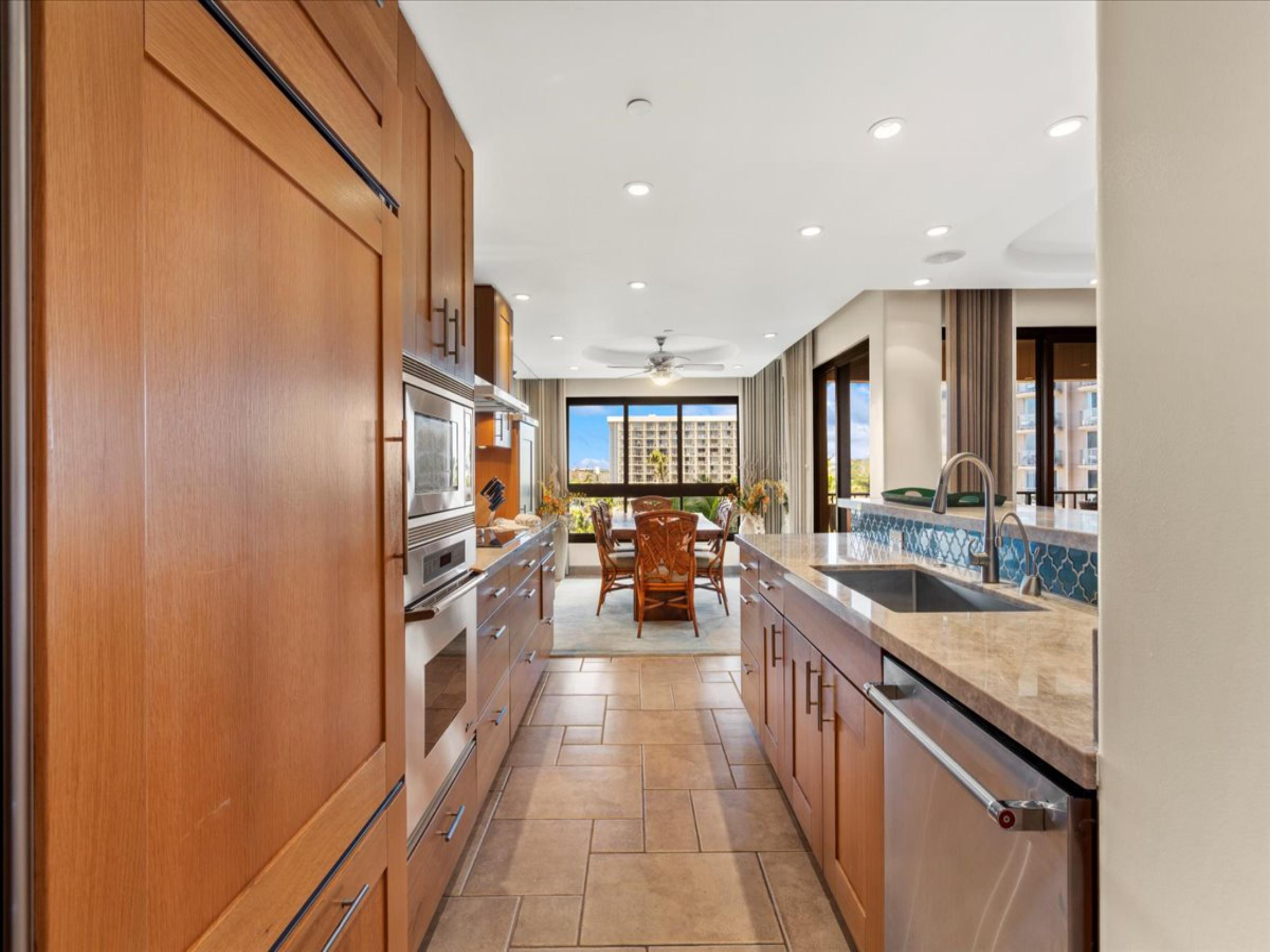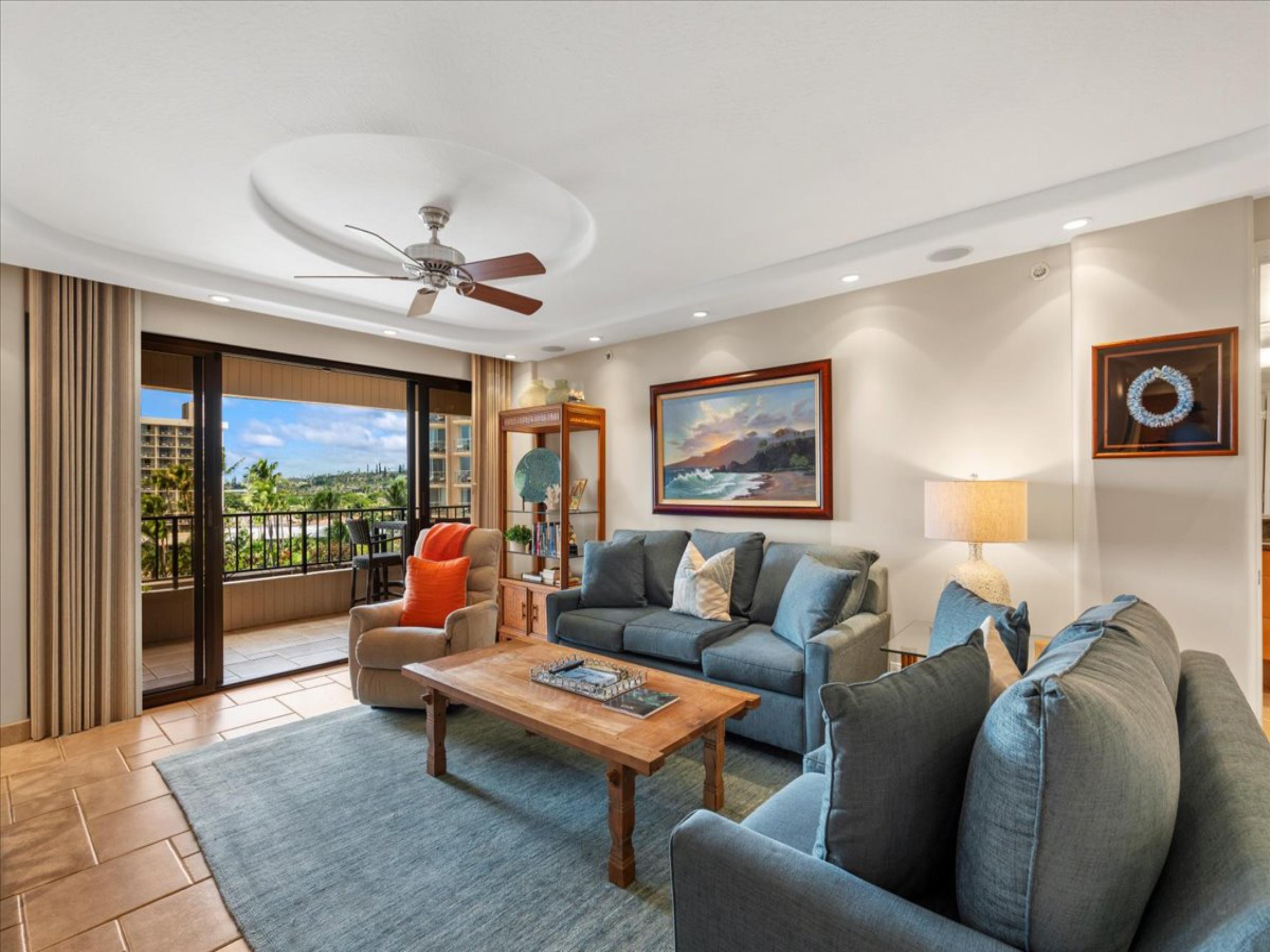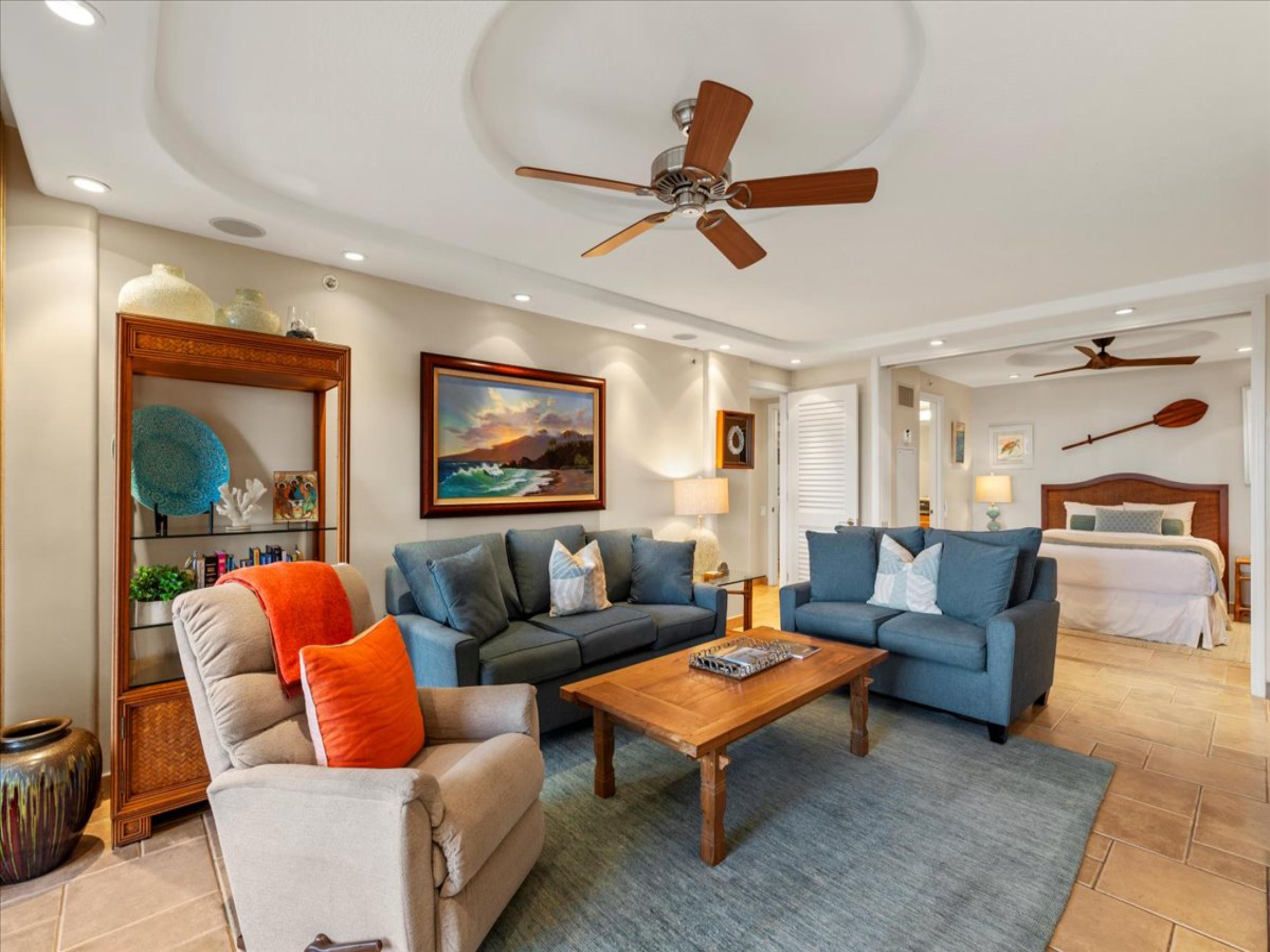 The interior of this well-appointed condo features tasteful coastal decor, comfortable furnishings, and a fully equipped updated gourmet kitchen. The open floor plan creates a seamless flow between the living, dining, and kitchen areas, perfect for entertaining or relaxing with family and friends. Large sliding glass doors open onto a private lanai, where guests can enjoy stunning sunsets and whale watching during the winter months.
