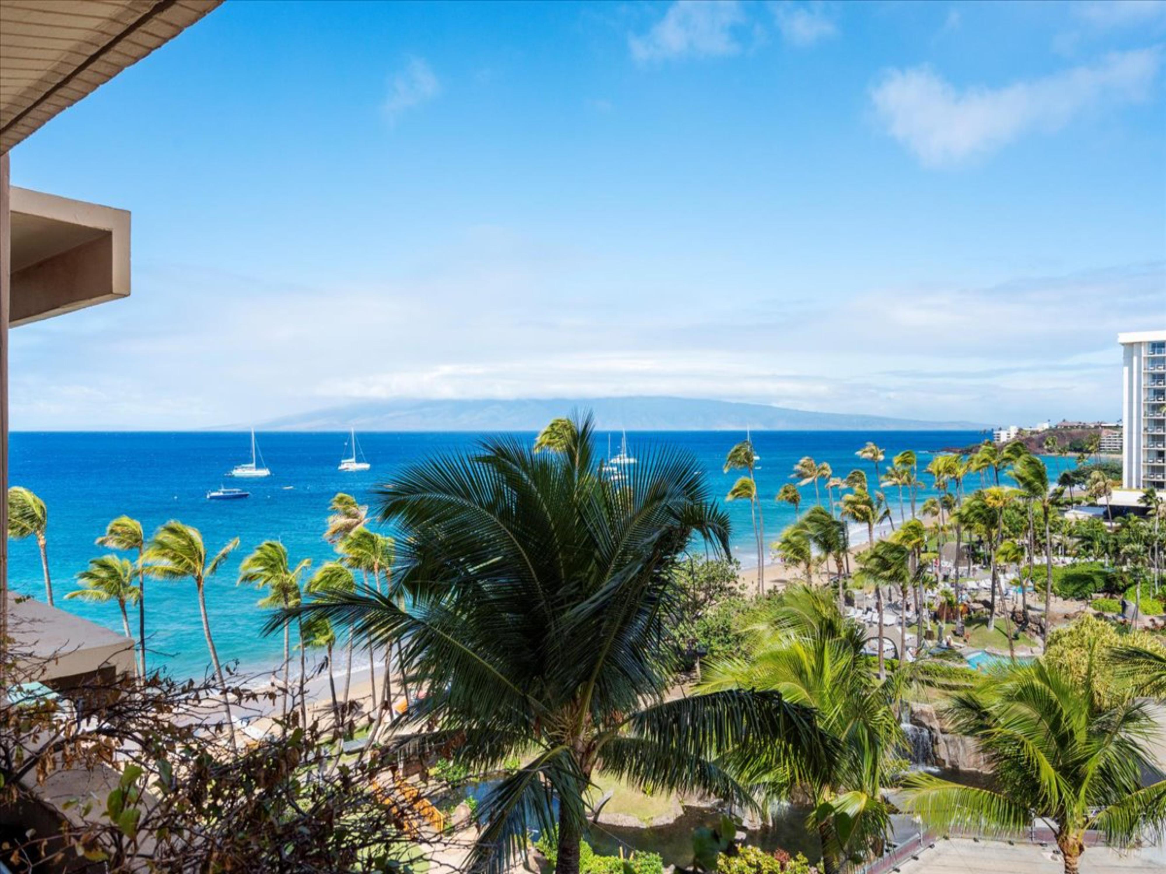 This spacious 1,843 square foot residence on the eighth floor offers spectacular views of the Pacific Ocean from every room. You can also see the islands of Lanai and Molokai, and the pristine golden sands of Kaanapali Beach and manicured tropical gardens that surround the property.