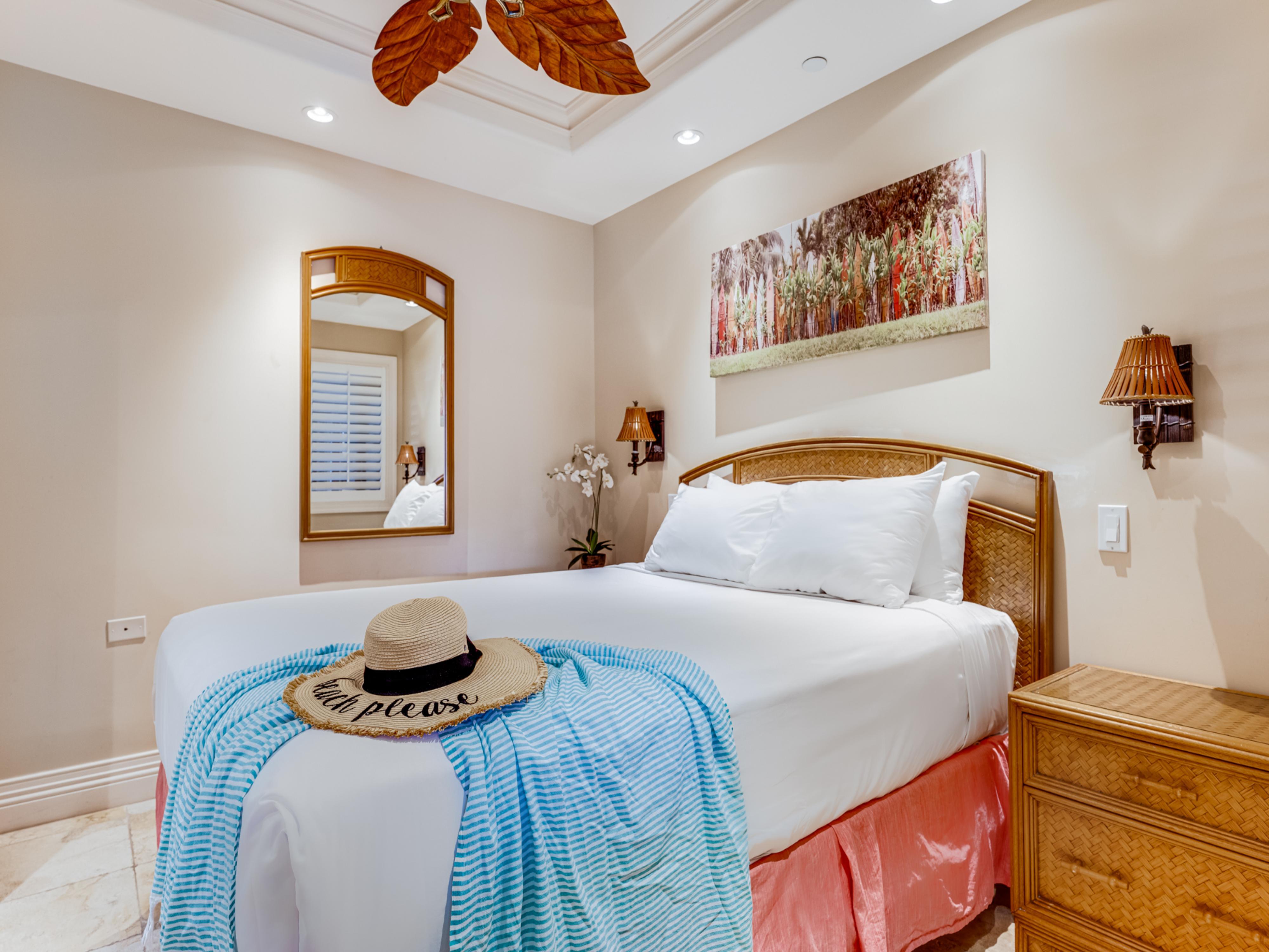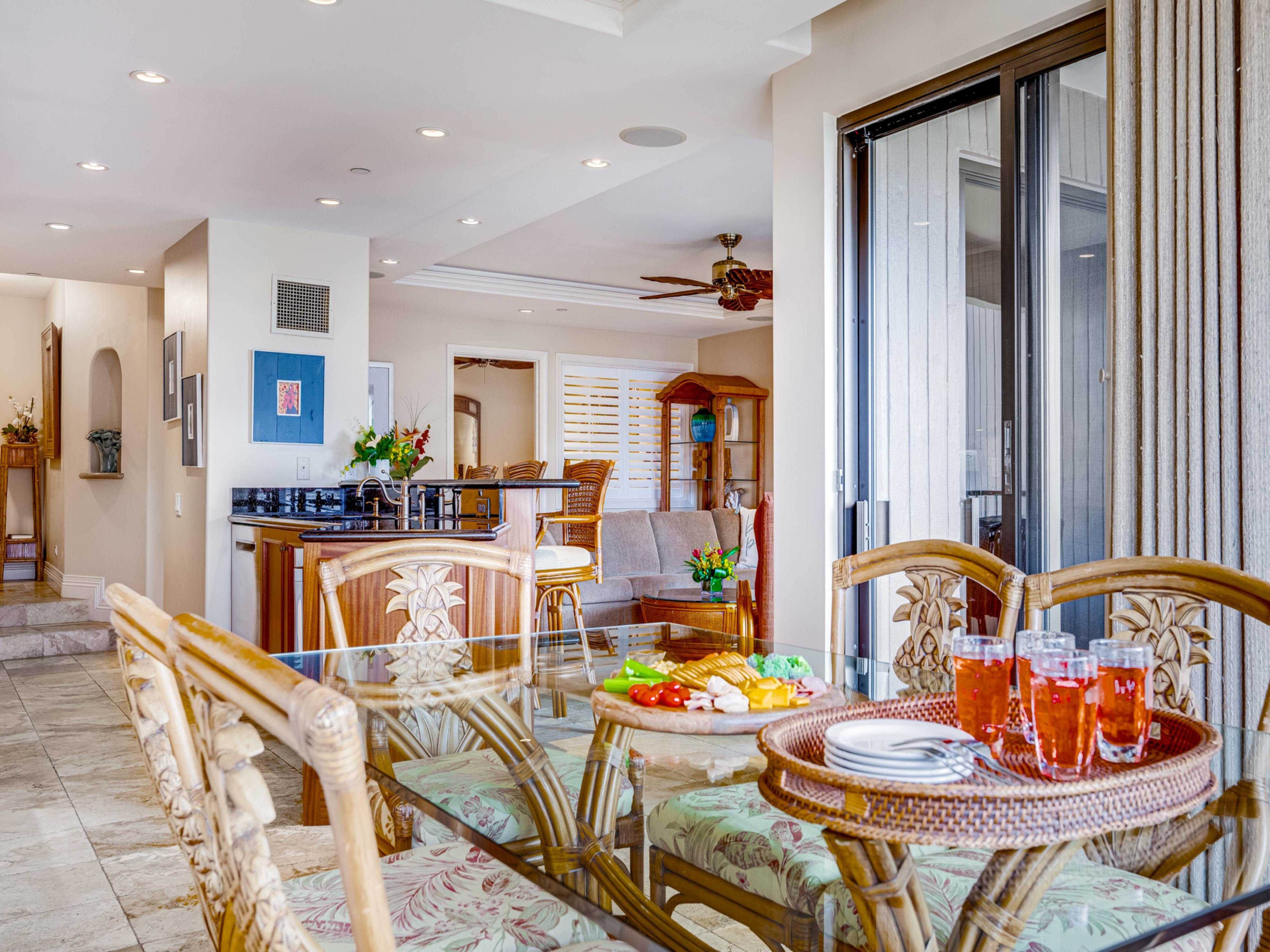 The living area is spacious and filled with natural light, offering a comfortable sectional sofa and a queen sofa bed for additional guests. The fully equipped kitchen includes granite countertops, modern stainless-steel appliances, and a breakfast bar, while a dedicated wine refrigerator keeps your favorite bottles perfectly chilled. The dining table seats six, creating an ideal setting for shared meals after a day in the sun.
