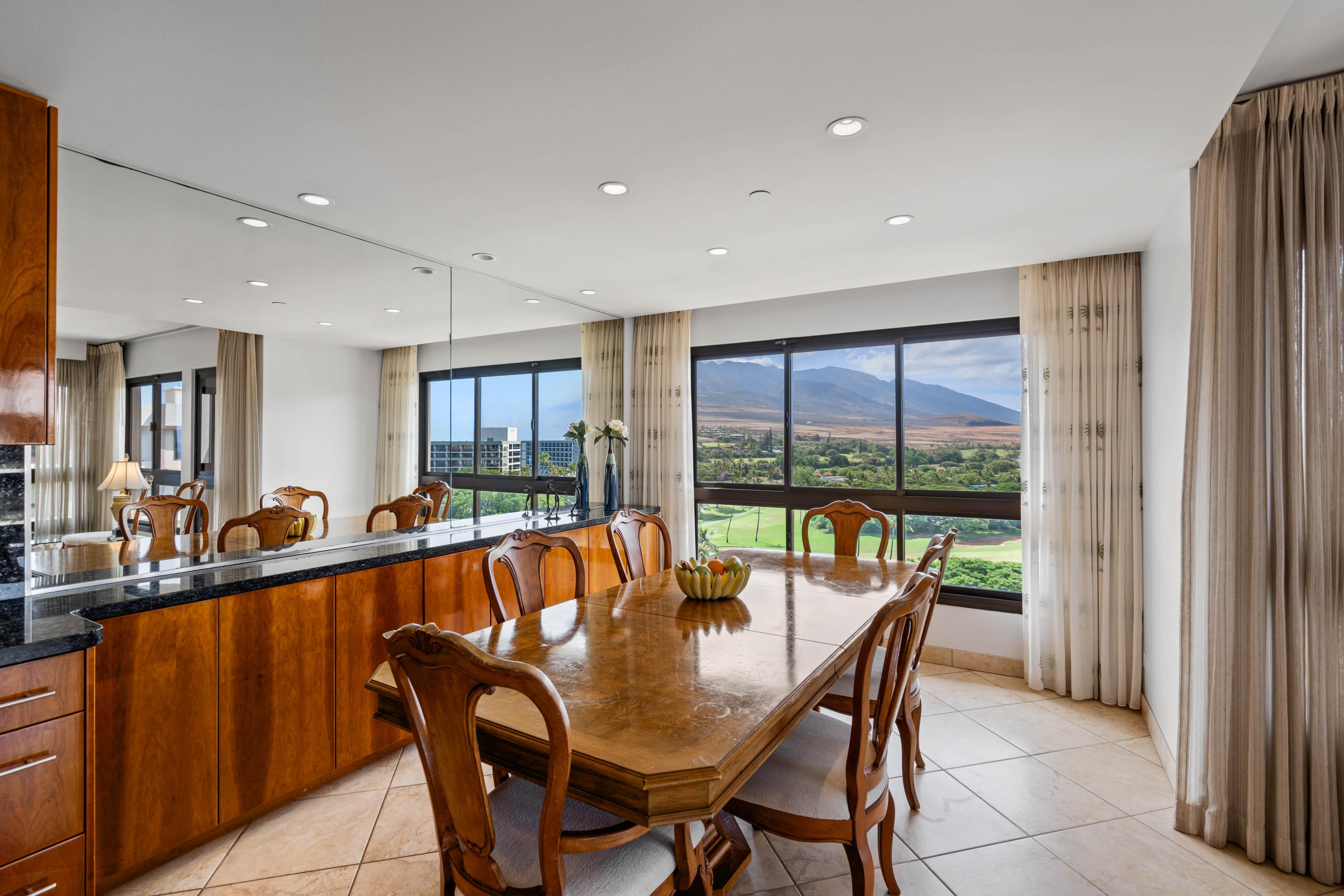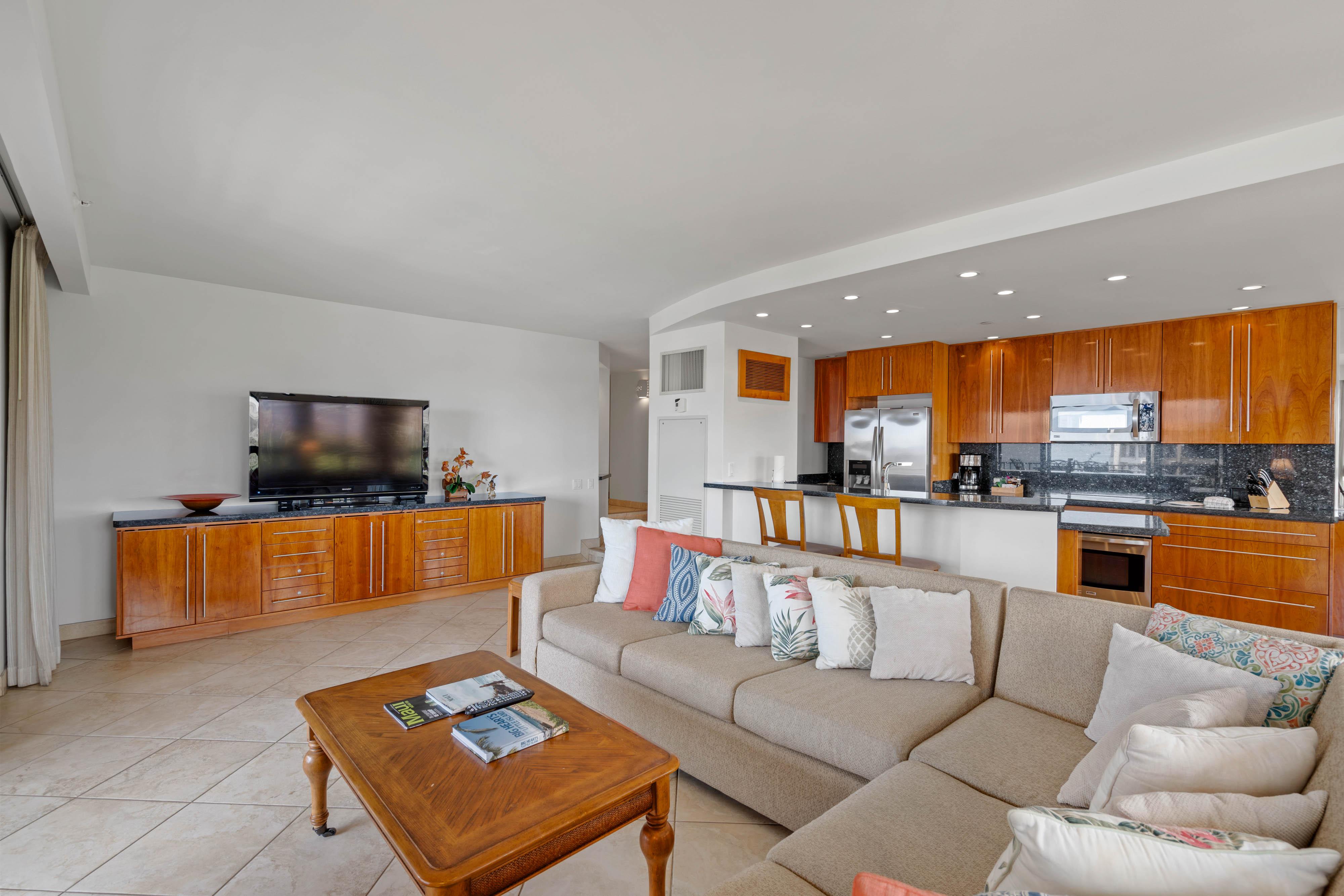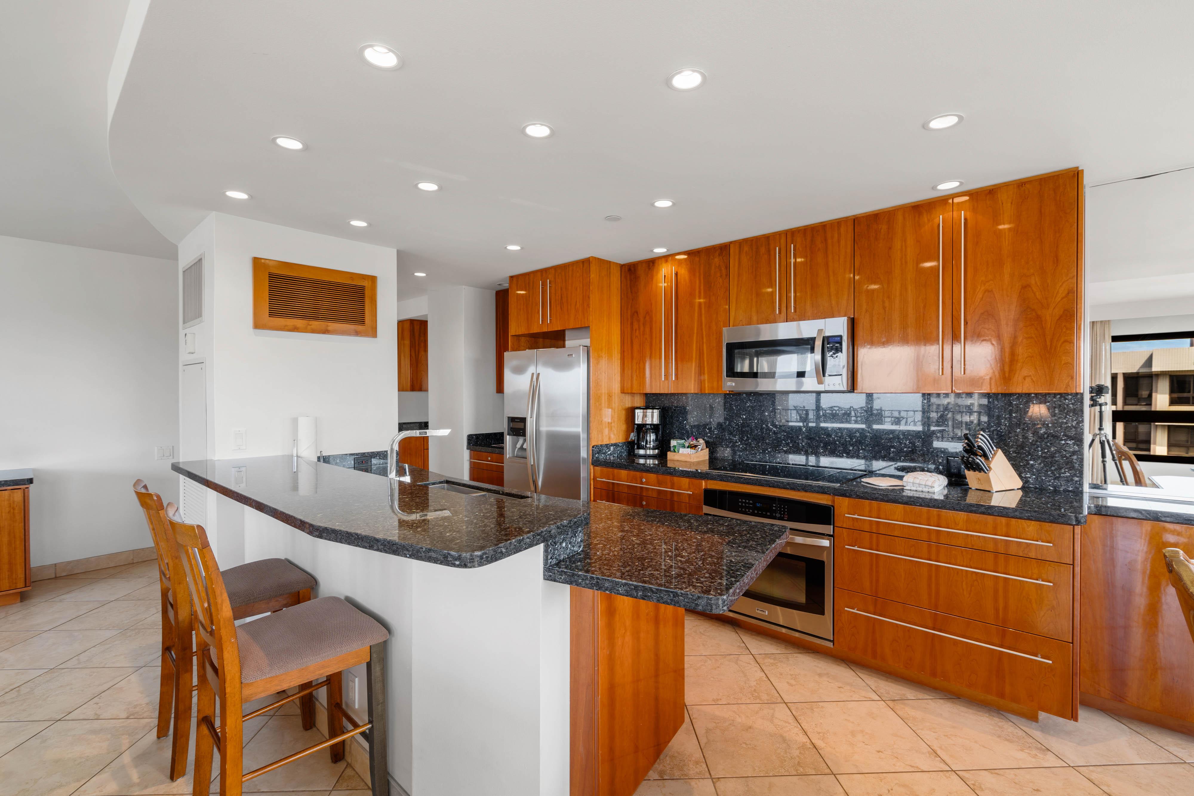 The kitchen is designed for connection, with an extended granite countertop and comfortable bar seating that invites conversation while cooking. Modern appliances and thoughtful touches make it easy to prepare and share meals with family and friends. Step out to the private lanai to enjoy the ocean breeze, the sounds of the waves, and views of both the mountains and the Pacific.