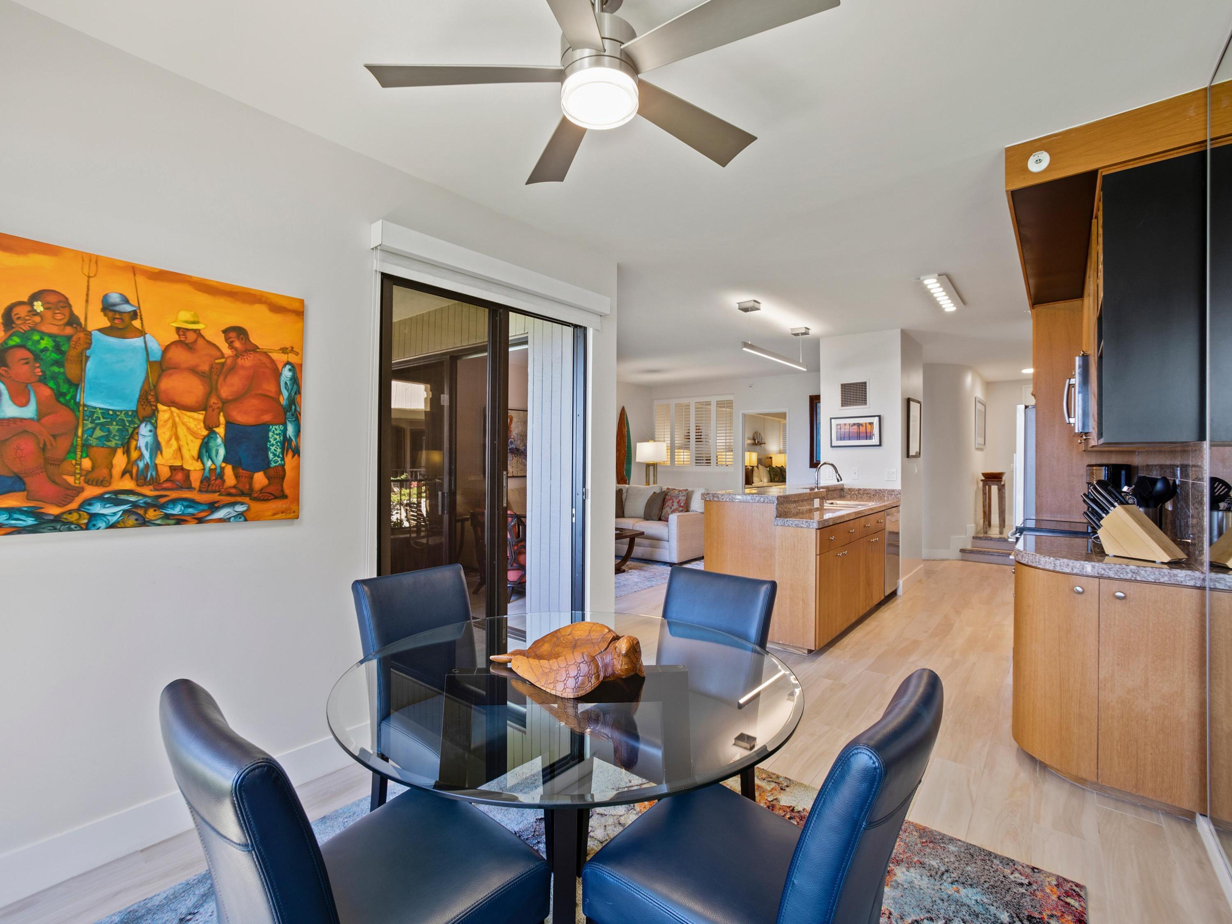 Adjacent to the kitchen, the living room provides a comfortable space for relaxation and entertainment. A separate dining area seats four, perfect for enjoying meals together. For those who prefer al fresco dining, the private lanai also accommodates four, offering breathtaking ocean views.