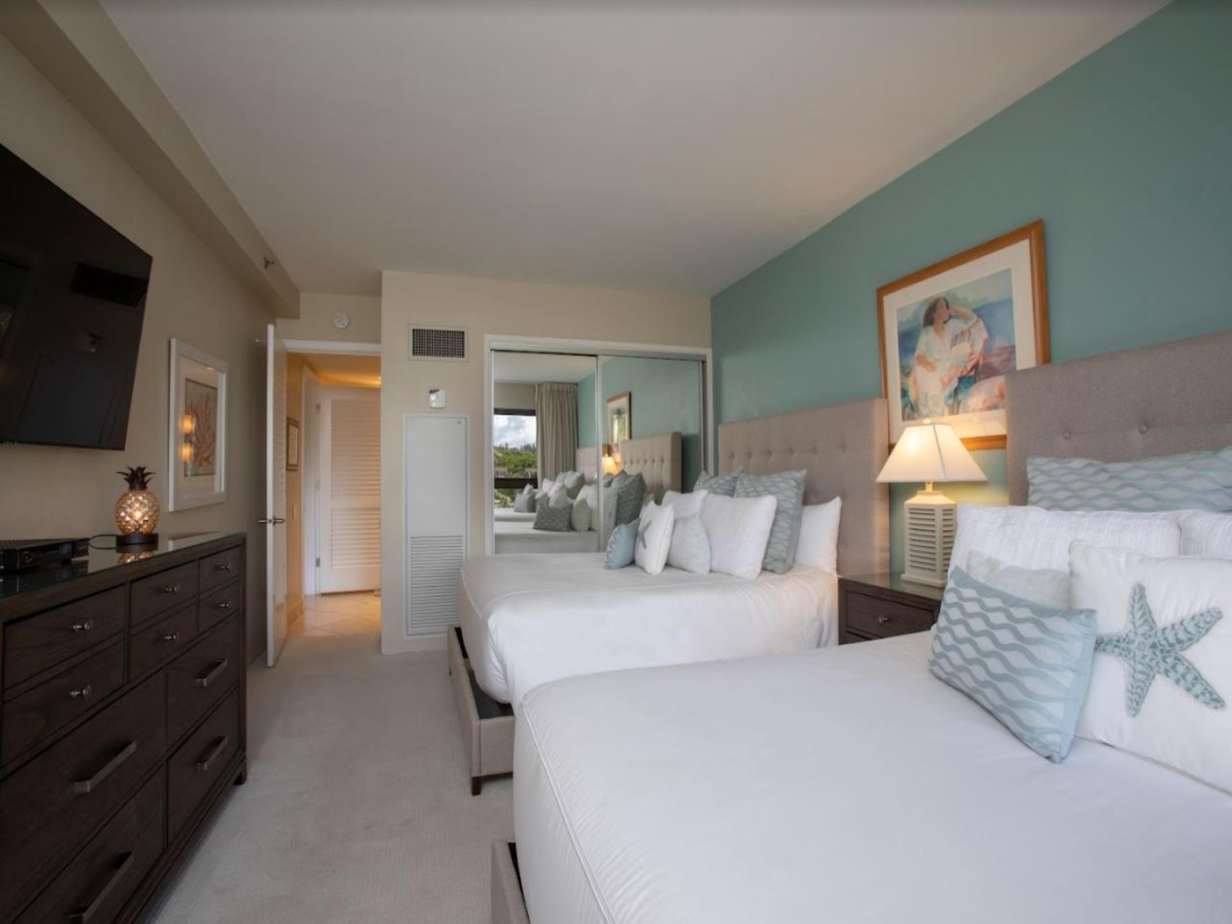 The primary bedroom has a king bed, a flat-screen TV with cable, and a spacious reading nook complete with two stylish armchairs. The large en suite bathroom has a walk-in shower and a separate vanity area. The second bedroom has two double beds and an additional flat screen TV for private viewing. The bathroom off the guest bedroom has a walk-in shower.