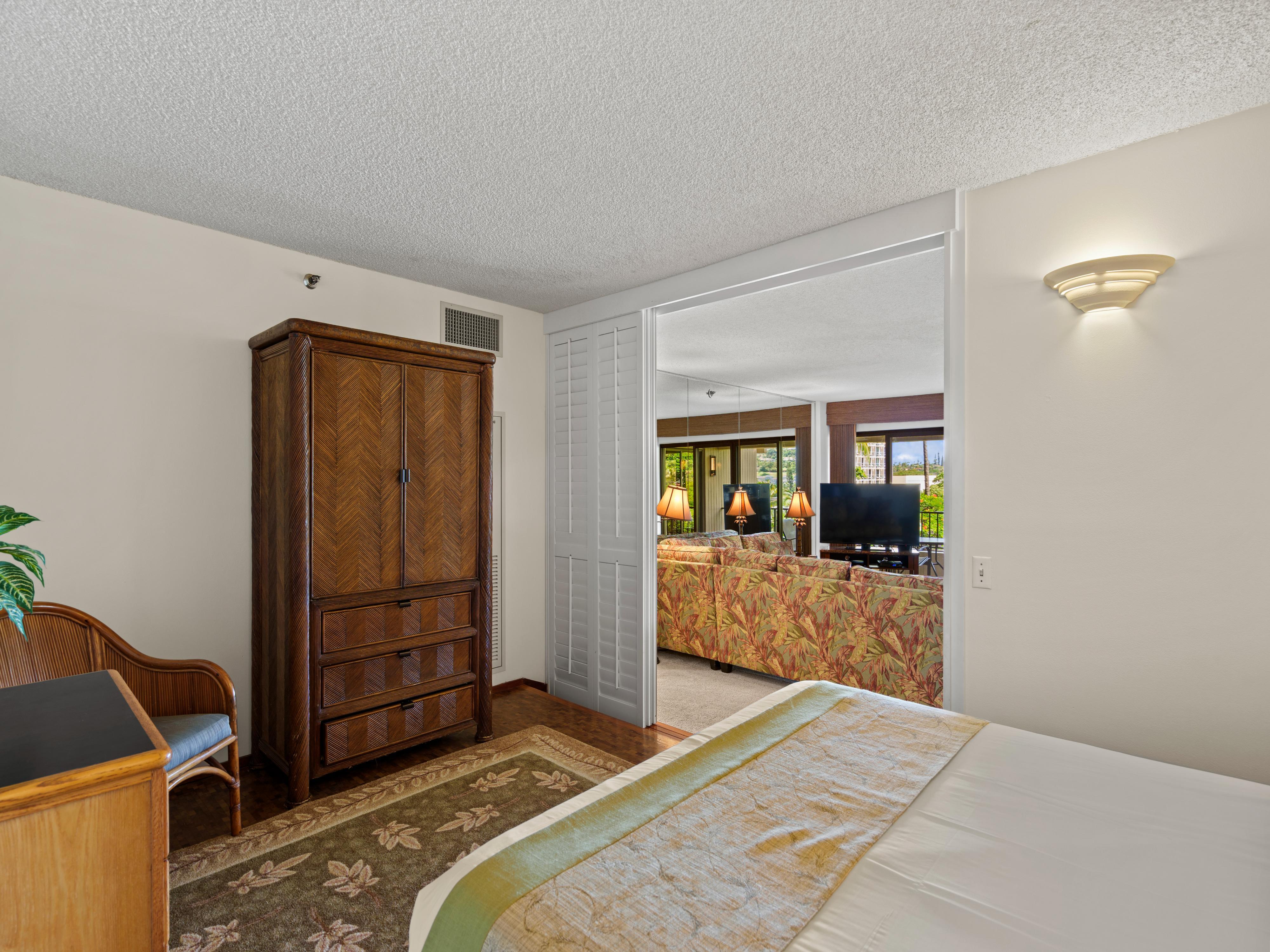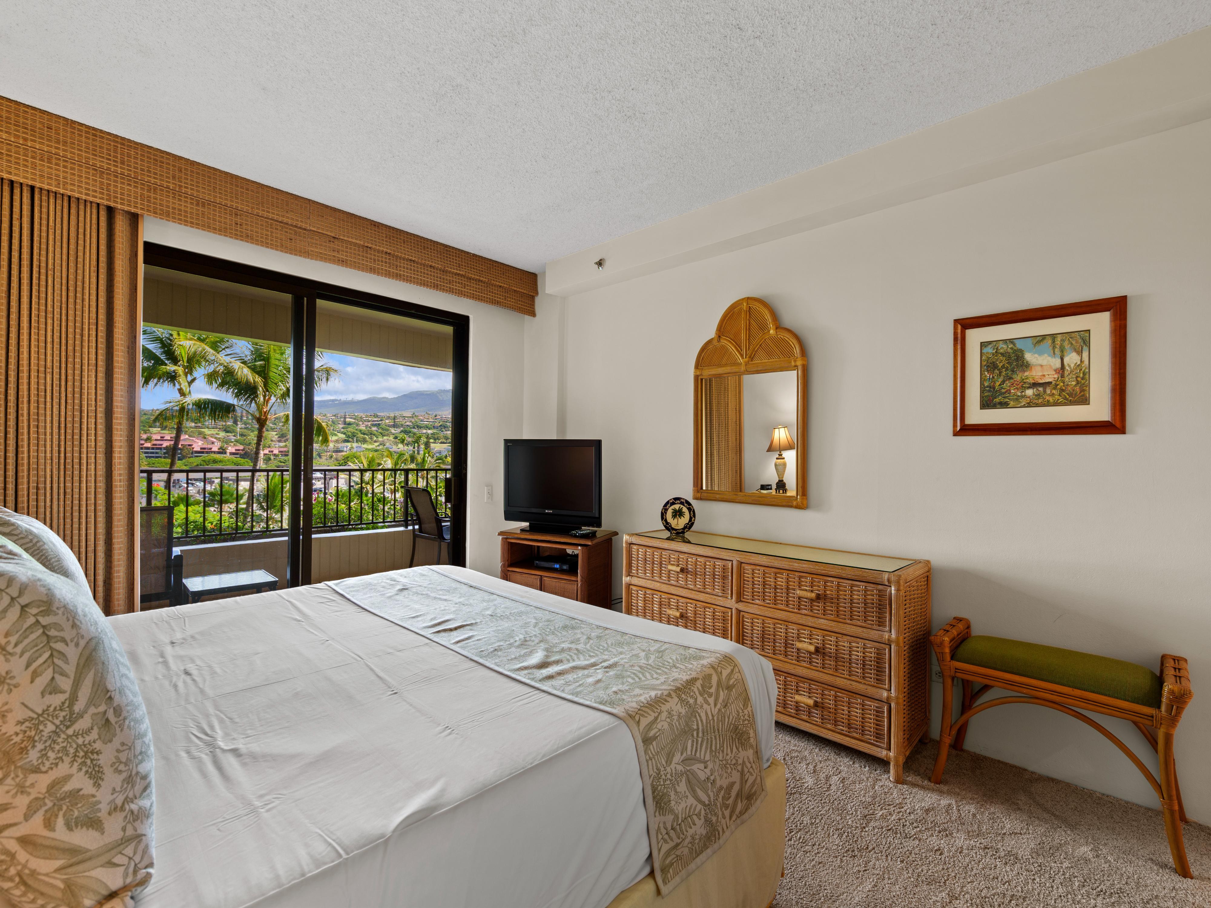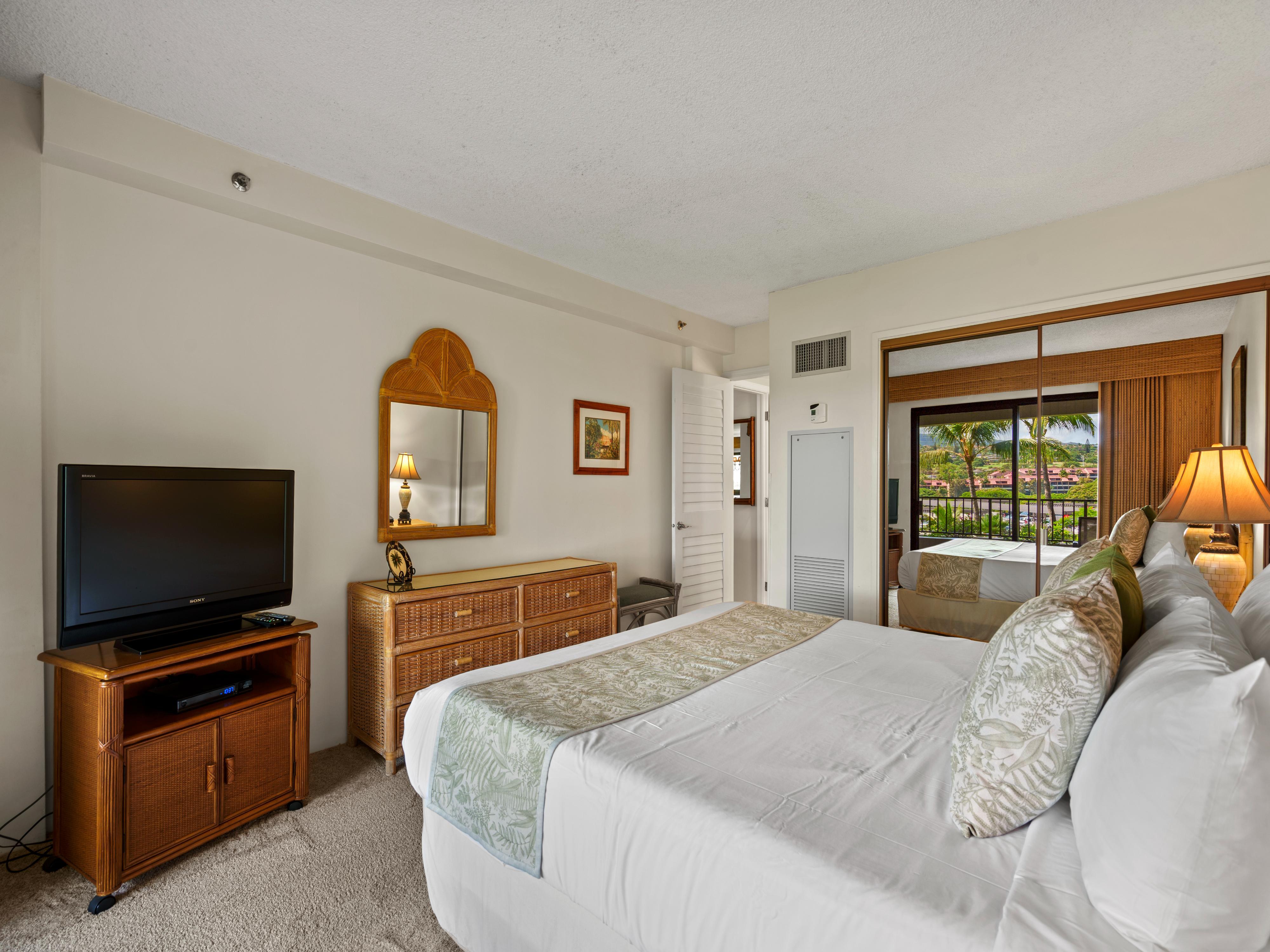 The primary bedroom features a California king bed with views out over the West Maui Mountains. Wake up each morning to the glow of the sun rising over the mountain tops! The enclosed den off the living room is equipped with a queen bed that will sleep 2 comfortably.