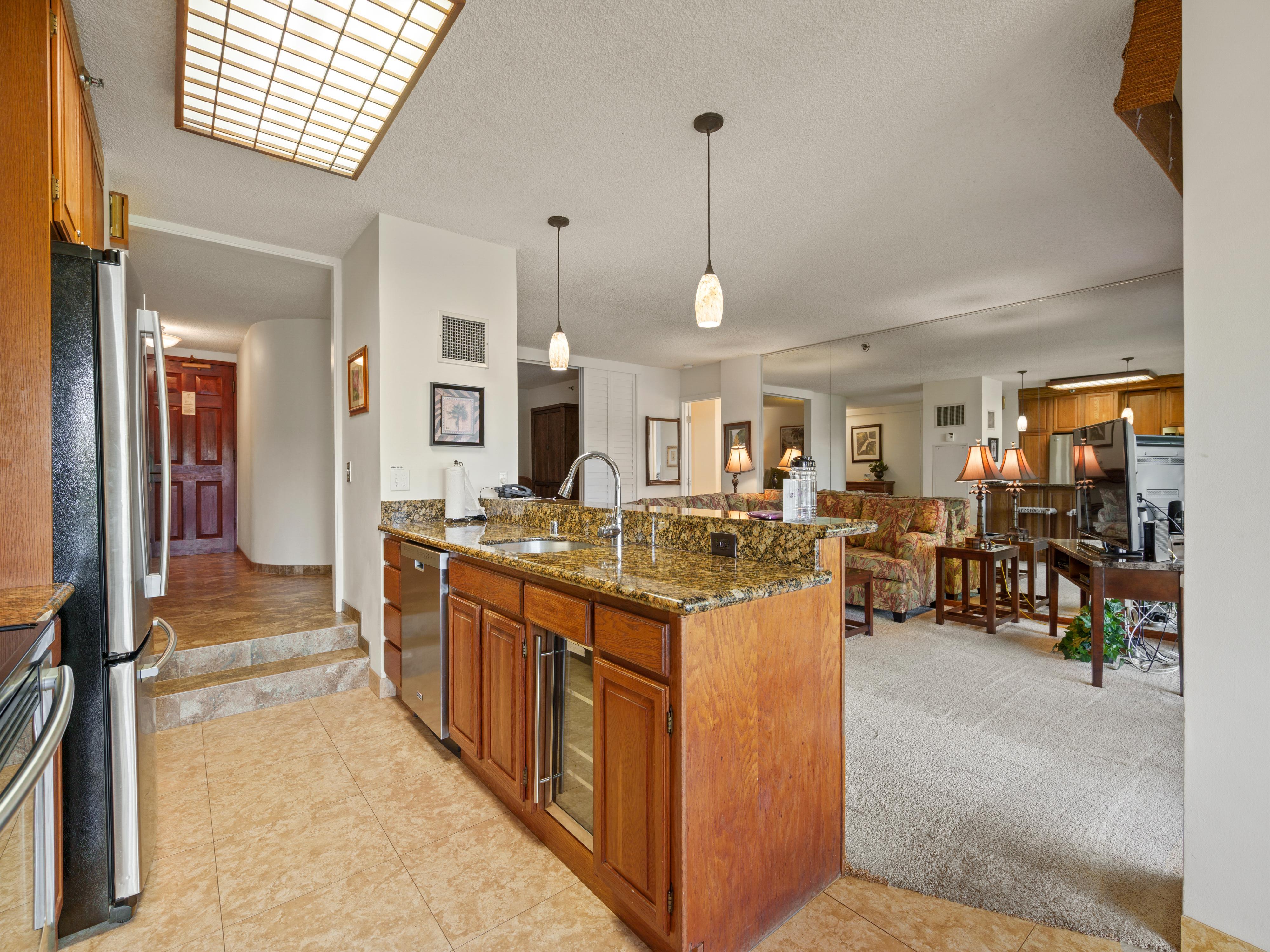 Experience island living in this stunning 1,513 sq. ft. vacation rental with an open floorplan combining the living room, dining area, and kitchen into one great room. With refined interiors and spacious rooms, guests can enjoy the best of Maui while relaxing in comfort and style.