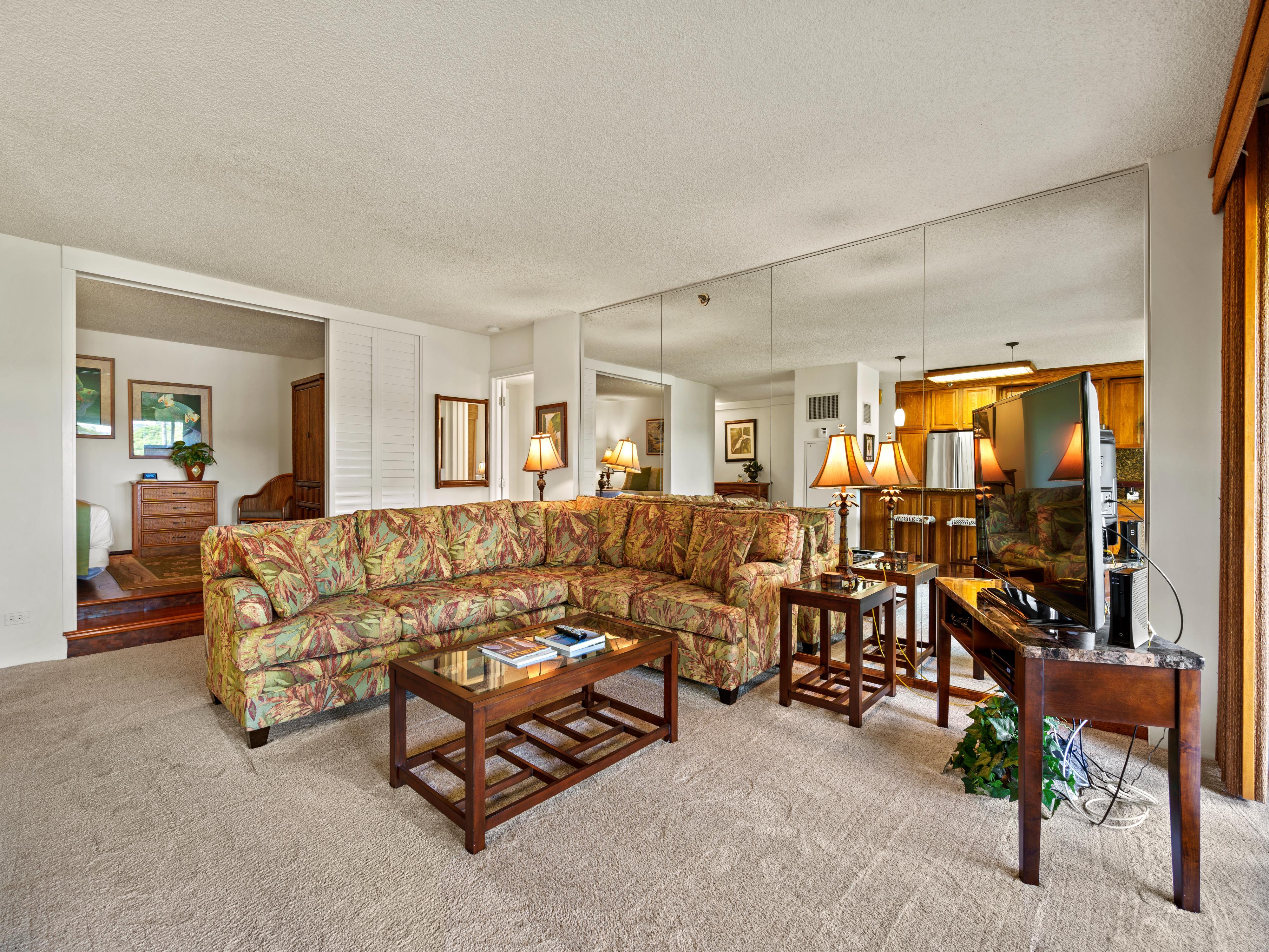 The primary bedroom features a California king bed with views out over the West Maui Mountains. Wake up each morning to the glow of the sun rising over the mountain tops! The enclosed den off the living room is equipped with a queen bed and a sofa sleeper in the living room provides additional bedding options to accommodate up to six guests comfortably.
