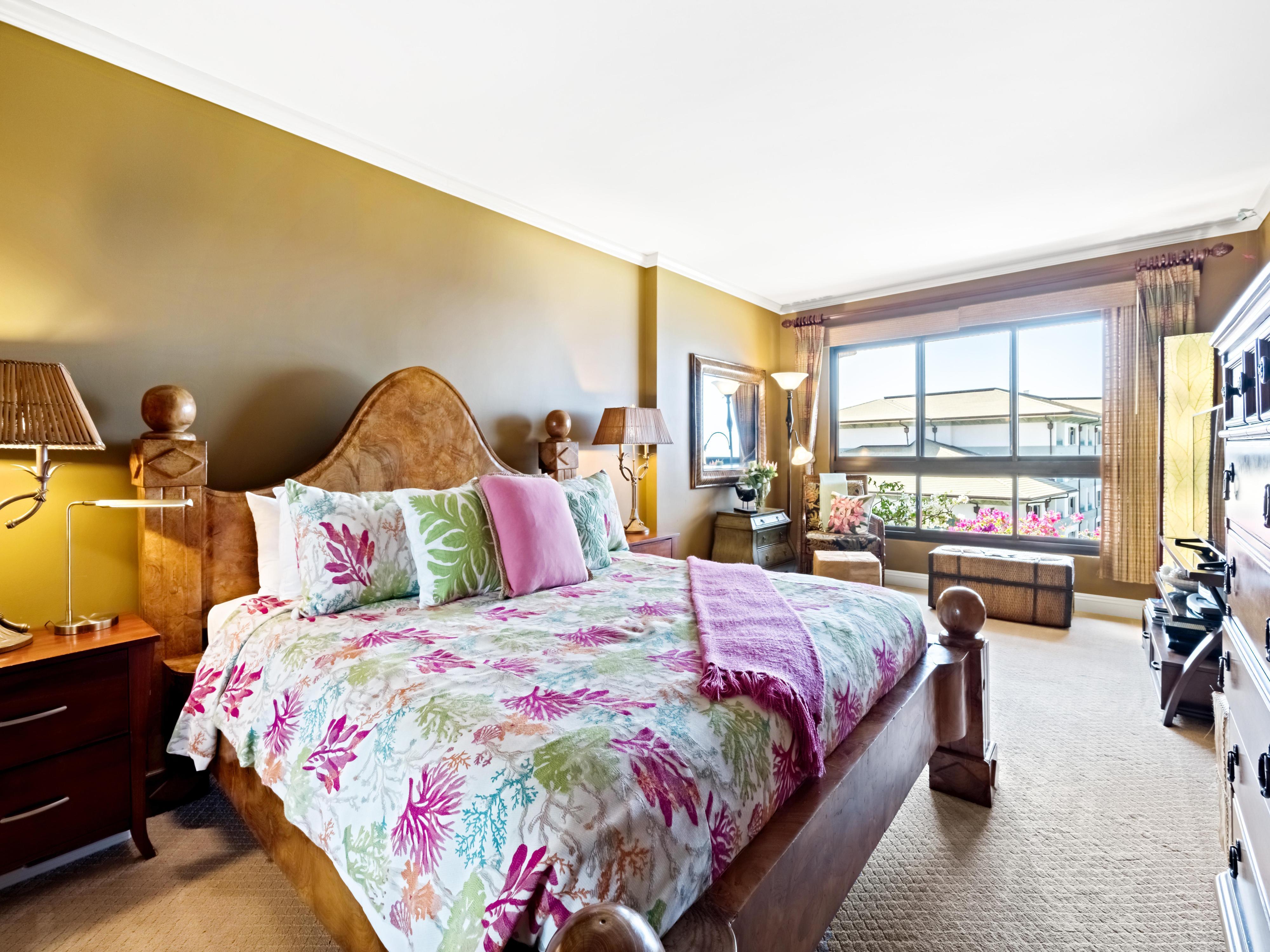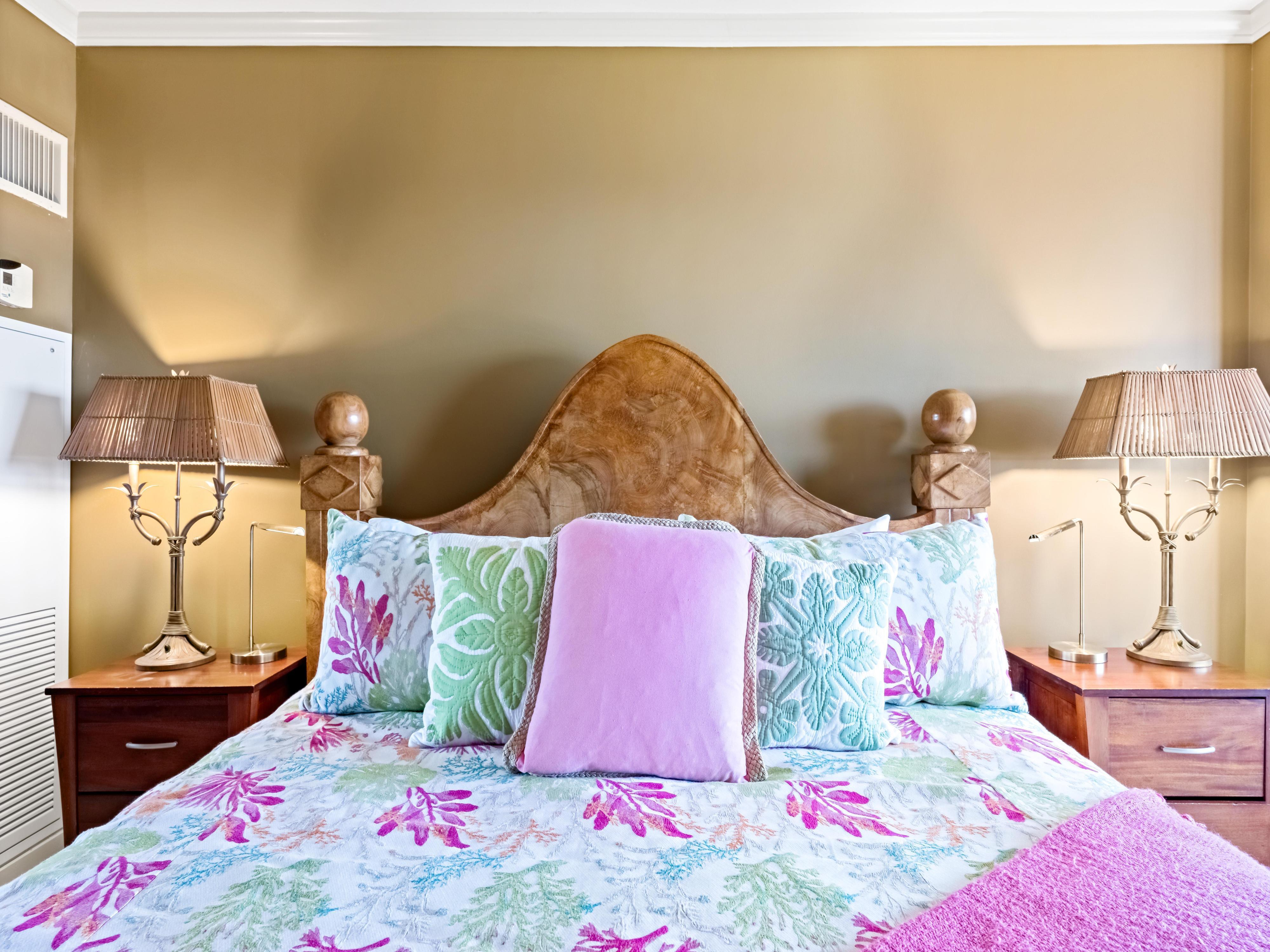 Kaanapali Alii 3112 is a platinum-rated one-bedroom condo with a fully enclosed den that comfortably serves as a second bedroom. Unique furnishings and bold artwork create a relaxed Hawaiian ambiance, with accents of rattan, tropical fabrics, and rich dark wood throughout.