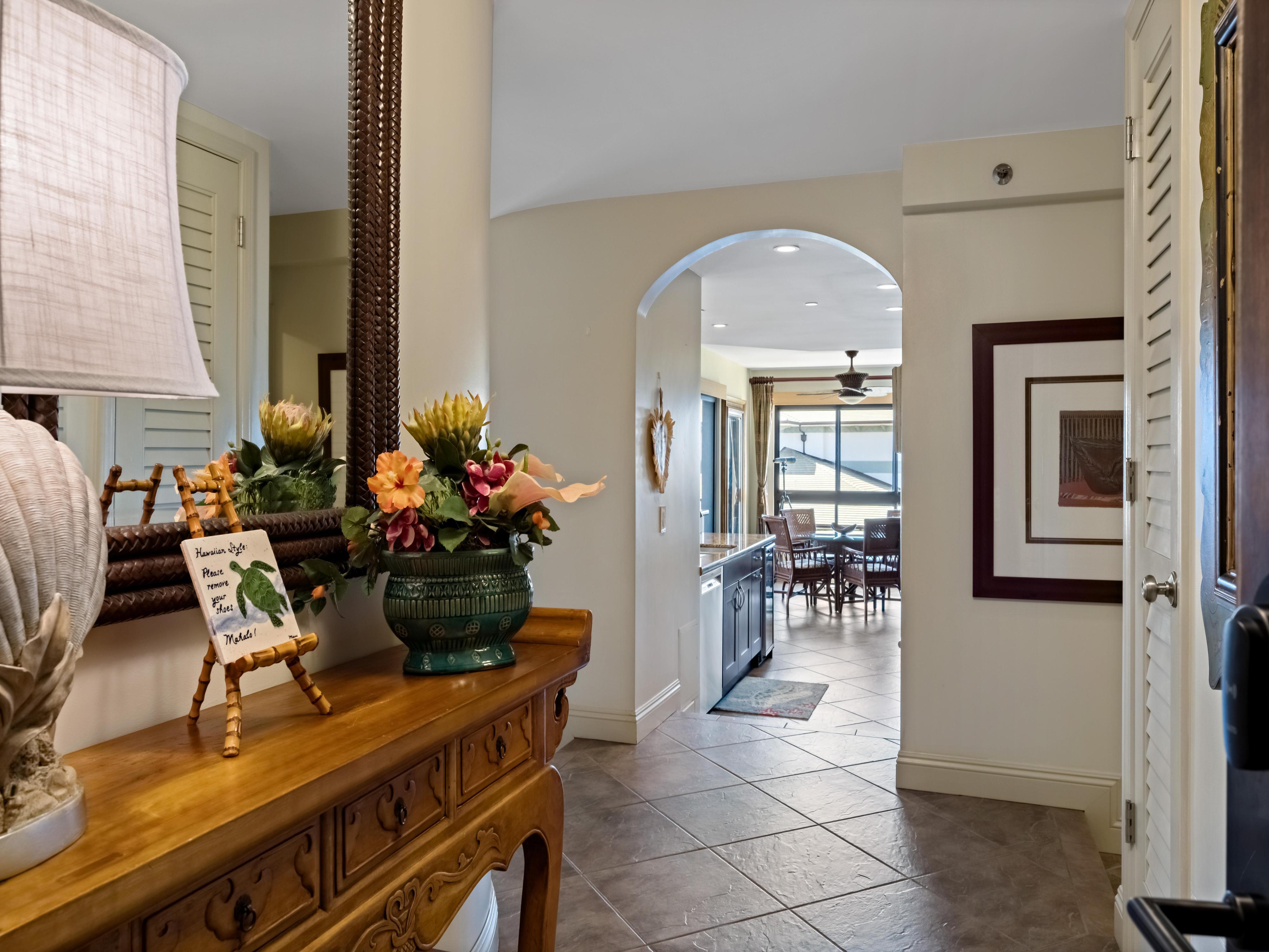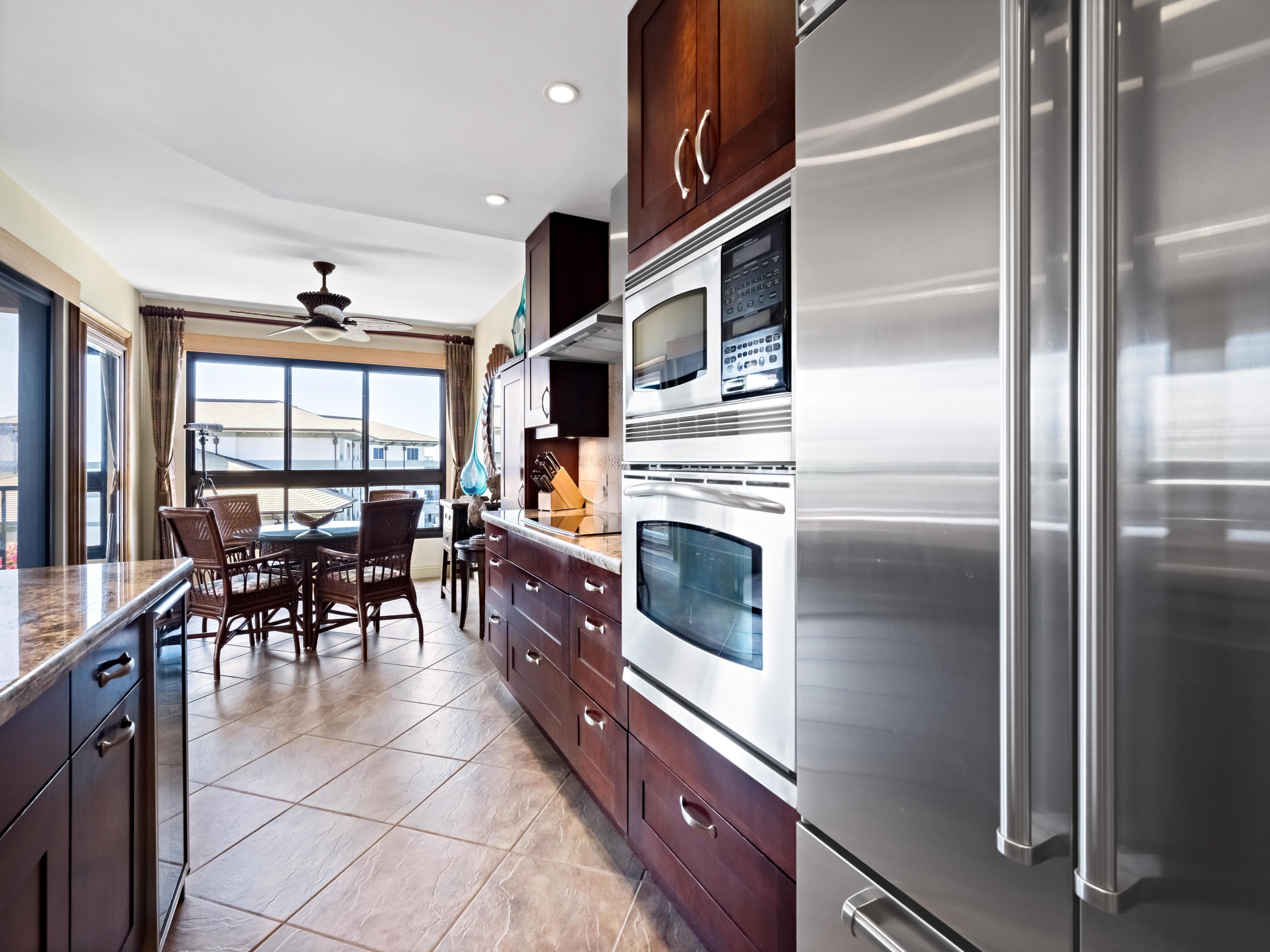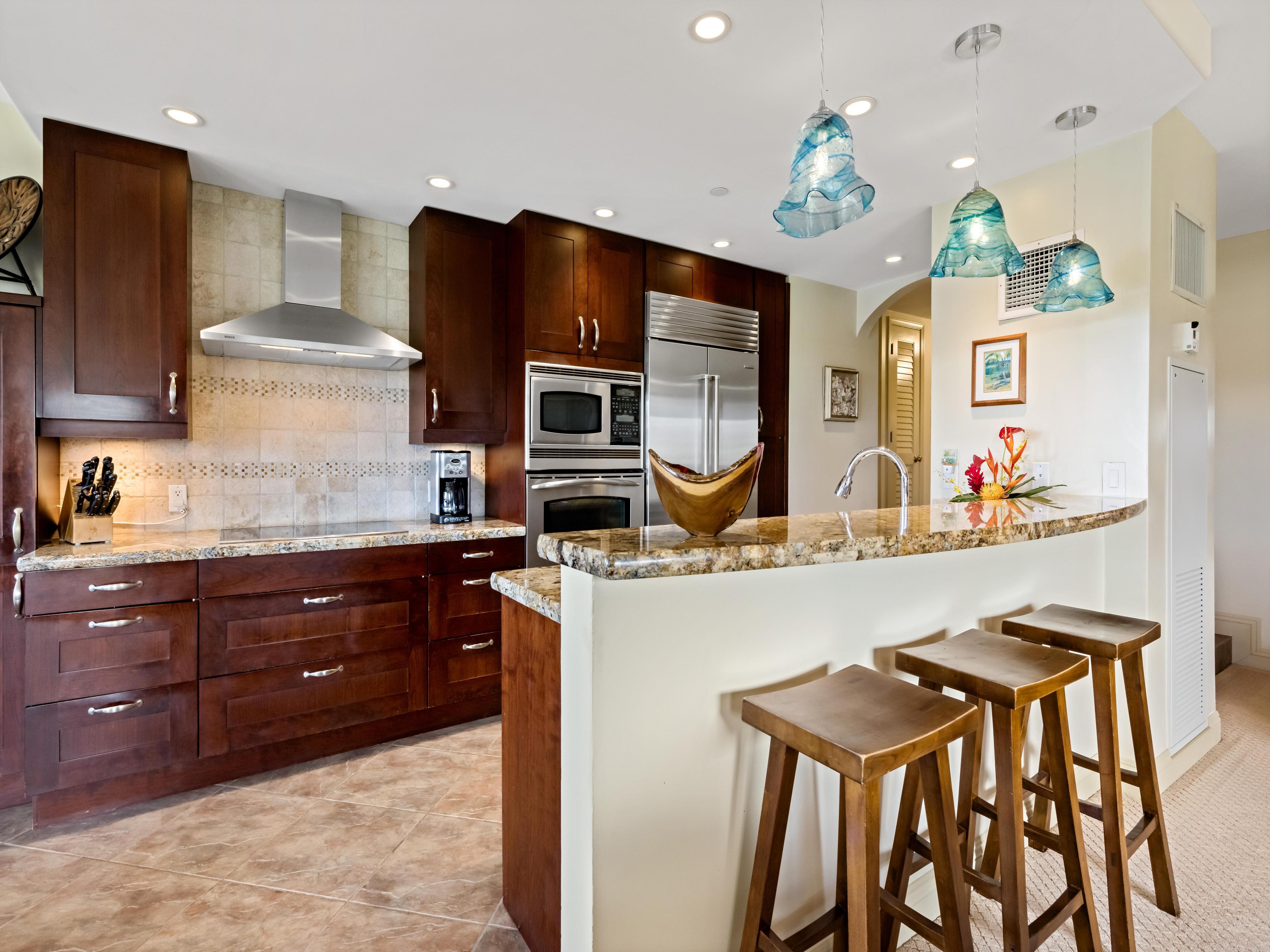Dining options include the mountain-view lanai or the ocean-view dining room. The updated kitchen features contemporary appliances, marble countertops, light cabinetry, and a Sub-Zero refrigerator. Bar stool seating at the counter provides a welcoming place for a quick bite.
