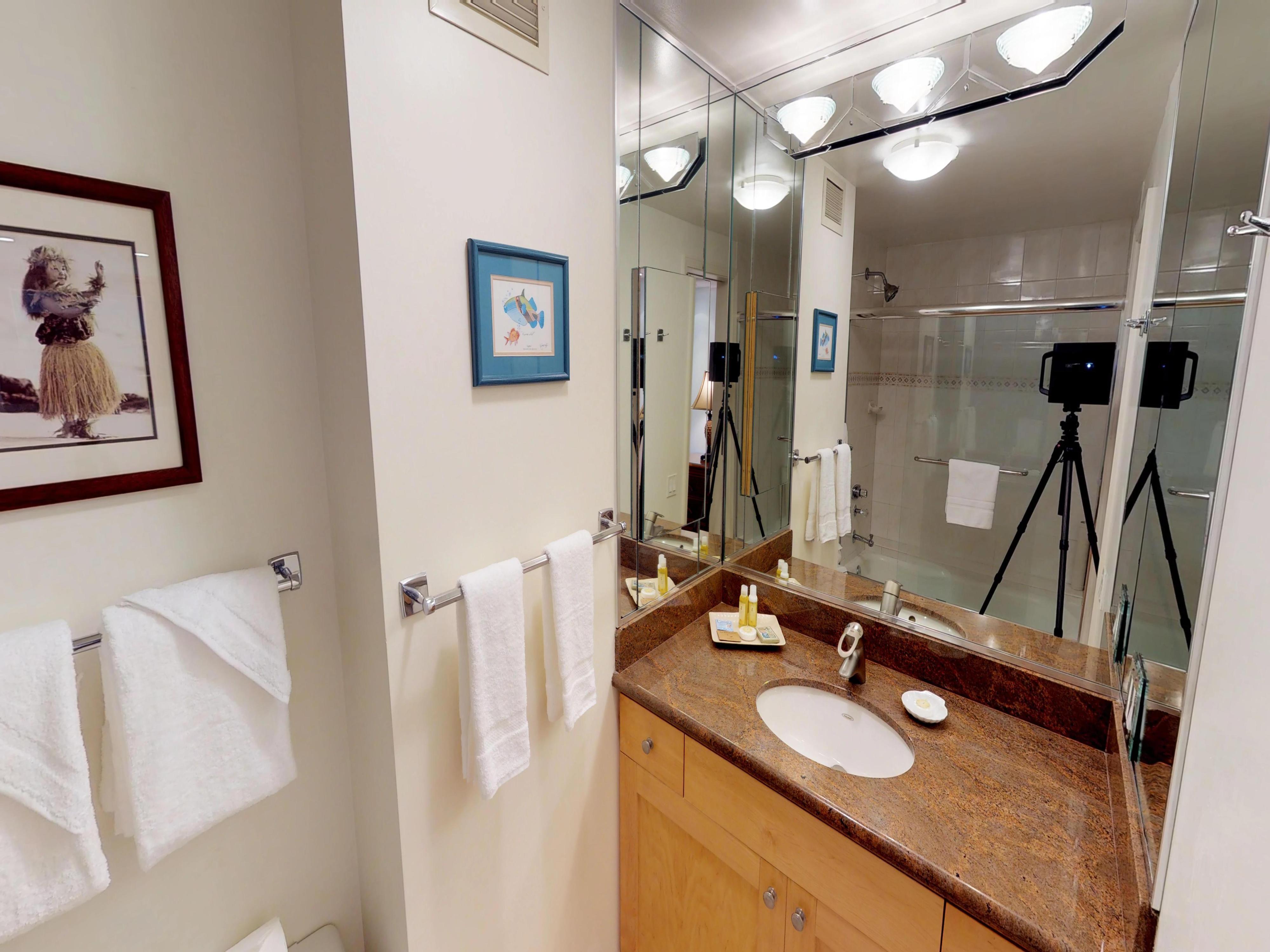 The primary bedroom provides a serene retreat with ocean views, a comfortable king bed, and an additional seating area that’s ideal for reading or relaxing. The enclosed den serves as a private second bedroom, offering flexibility and comfort for your stay.