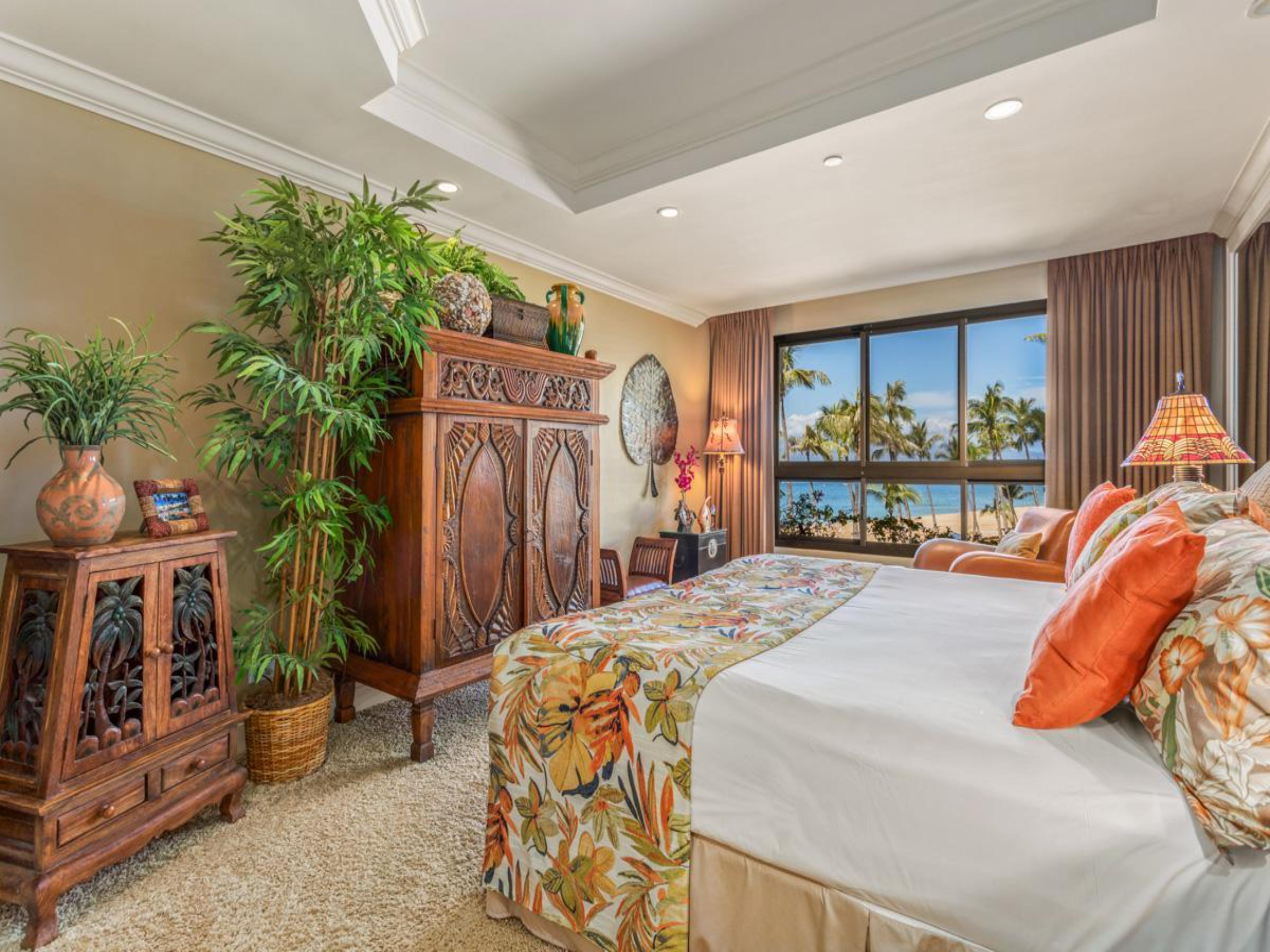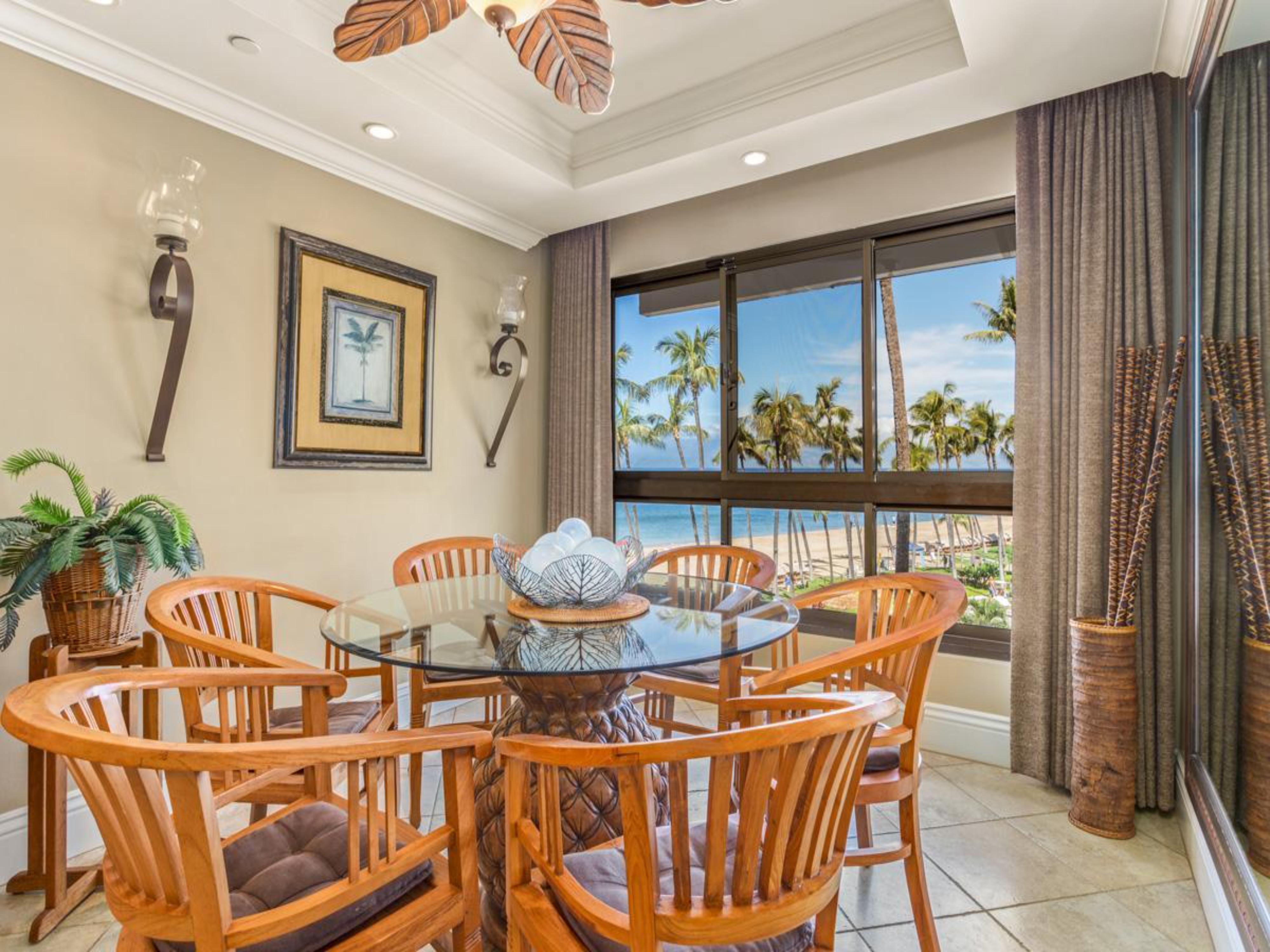 Welcome to Kaanapali Alii 343, a beautifully designed platinum-rated condo that invites you to gather and soak in stunning ocean views framed by swaying palms. This spacious retreat is perfect for families or groups, comfortably accommodating up to six guests.