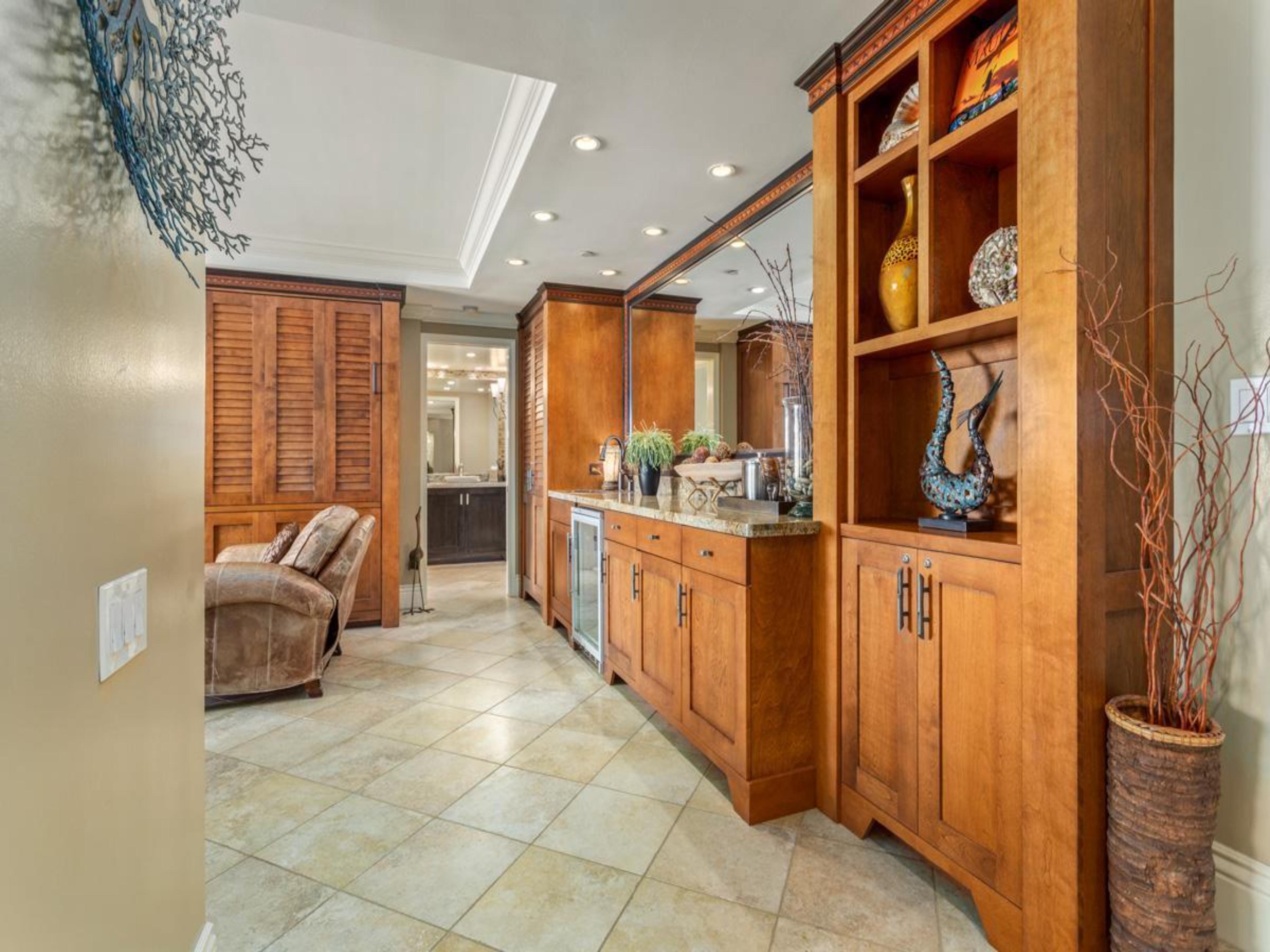 The gourmet kitchen is a chef's dream, featuring warm wood cabinetry, contemporary appliances, and elegant marble countertops. Adjacent to the kitchen, a separate dining room provides additional seating for six and spectacular ocean views, creating a memorable dining experience.