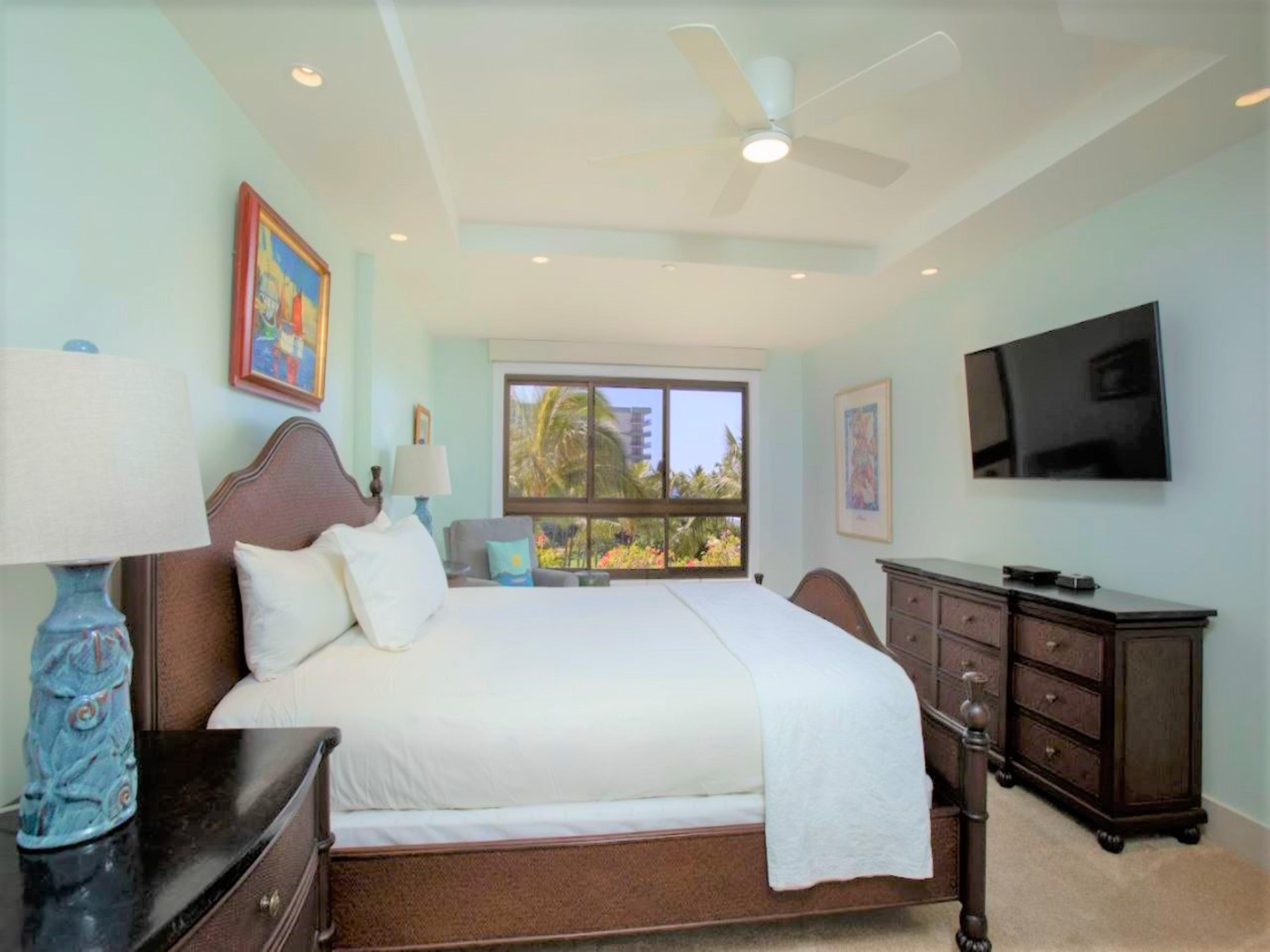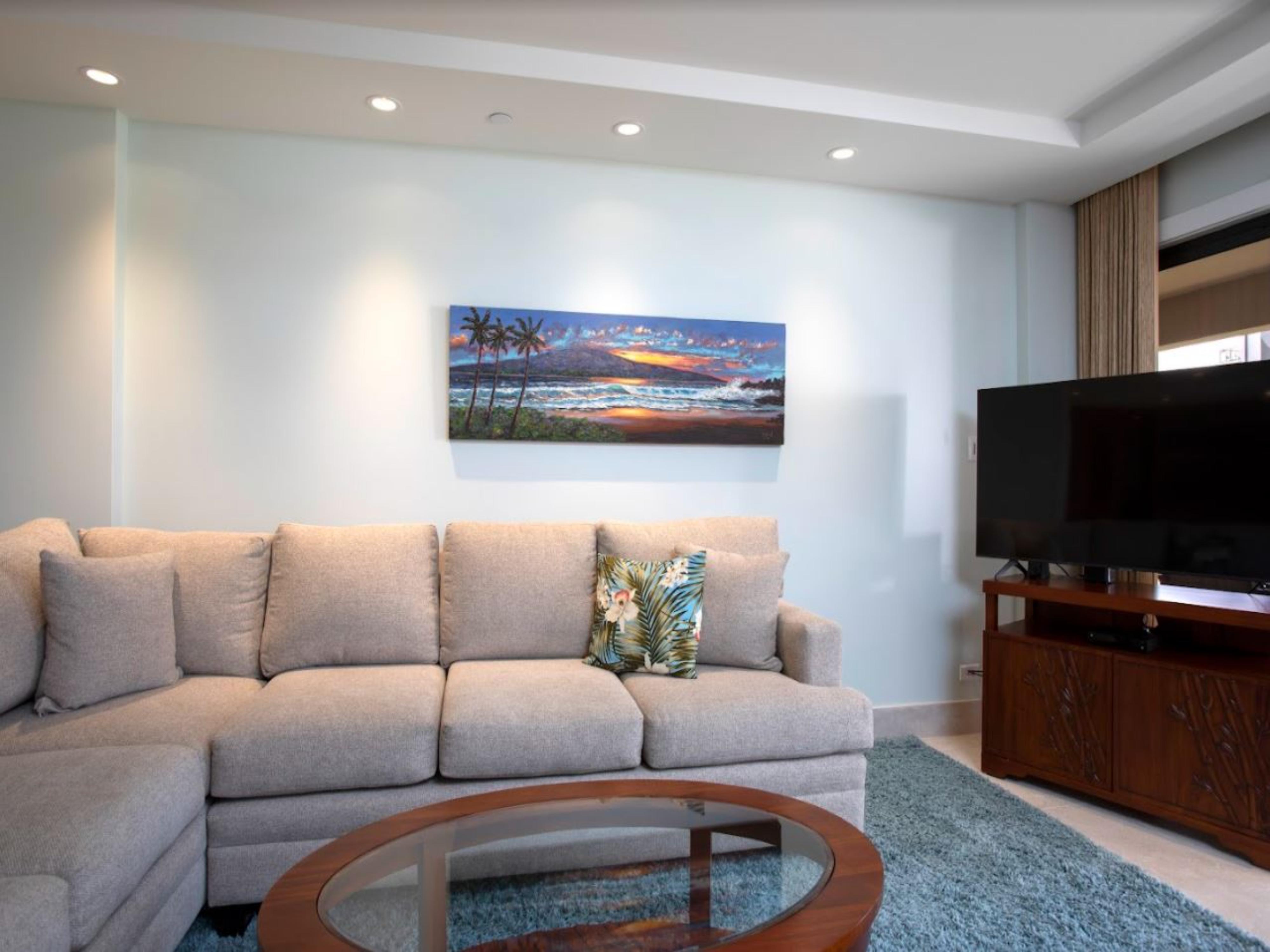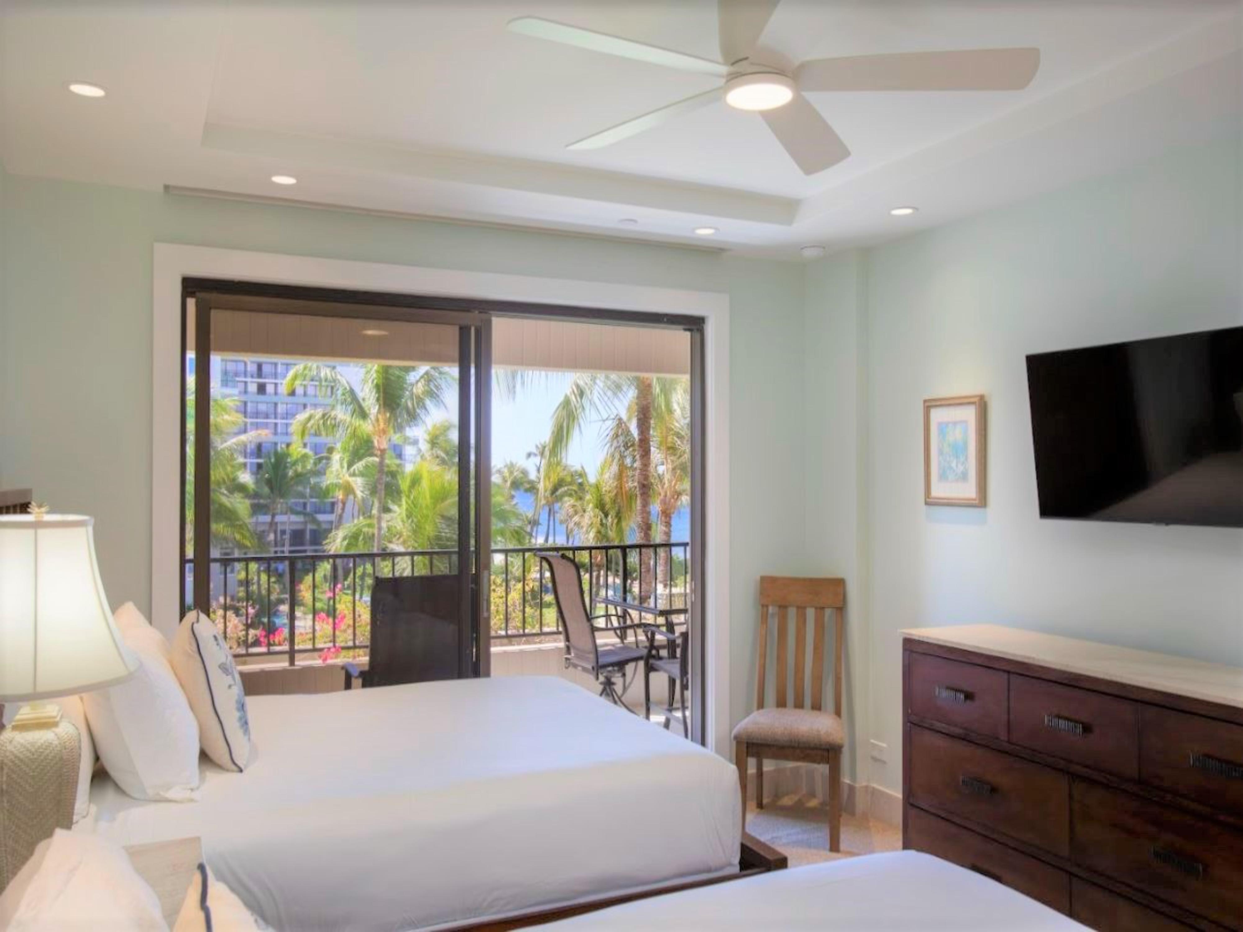 Forget fussing with an uncomfortable sofa bed and enjoy a sense a privacy! Sliding doors can be portioned shut to create private sleeping quarters complete with a wall-mounted TV and direct access to a full bathroom. The primary bedroom features a king size bed along with an en-suite bathroom showcasing a custom walk-in rain shower. The second bedroom has two full size beds and private access out to the main lanai. Wake up with views of the ocean!