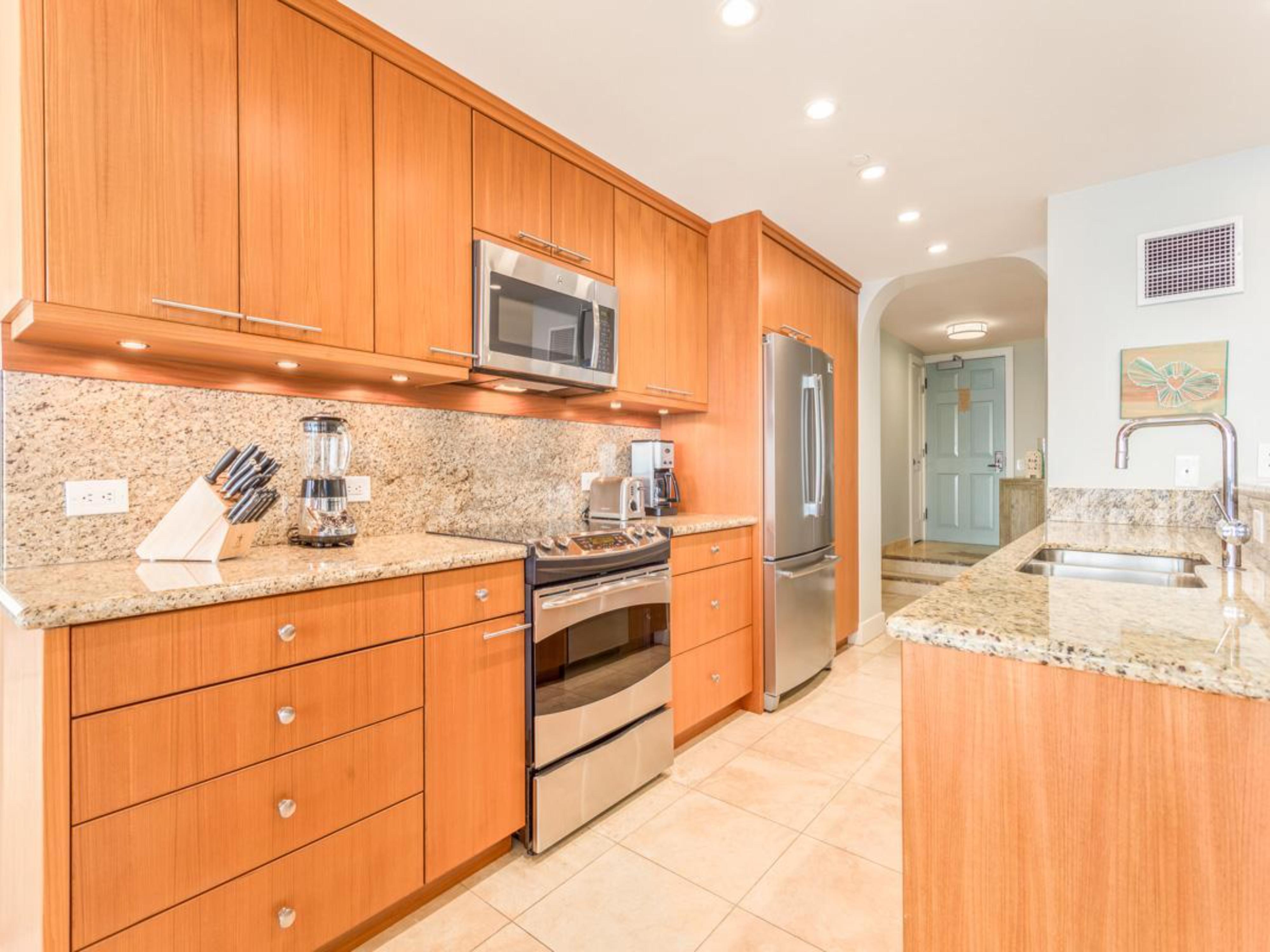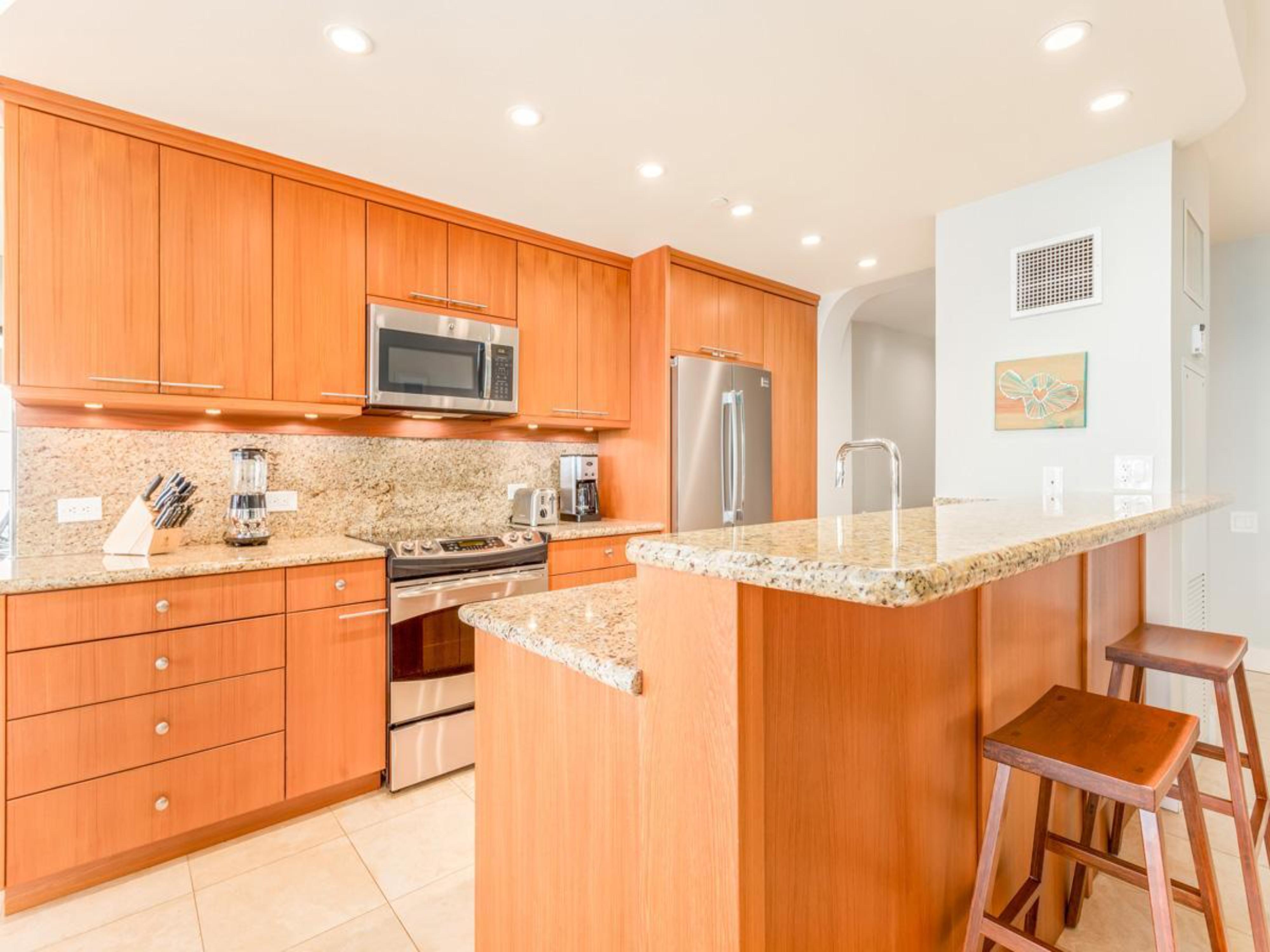 Spanning over 1,544 square feet, this luxurious retreat features upgraded finishes, beautiful furnishings, and contemporary island-inspired décor. The open-concept living area is designed with high-end details including tile floors, granite countertops, and custom cabinetry. Expansive windows and sliding glass doors fill the space with natural light and showcase panoramic views of the Pacific Ocean and neighboring islands.
