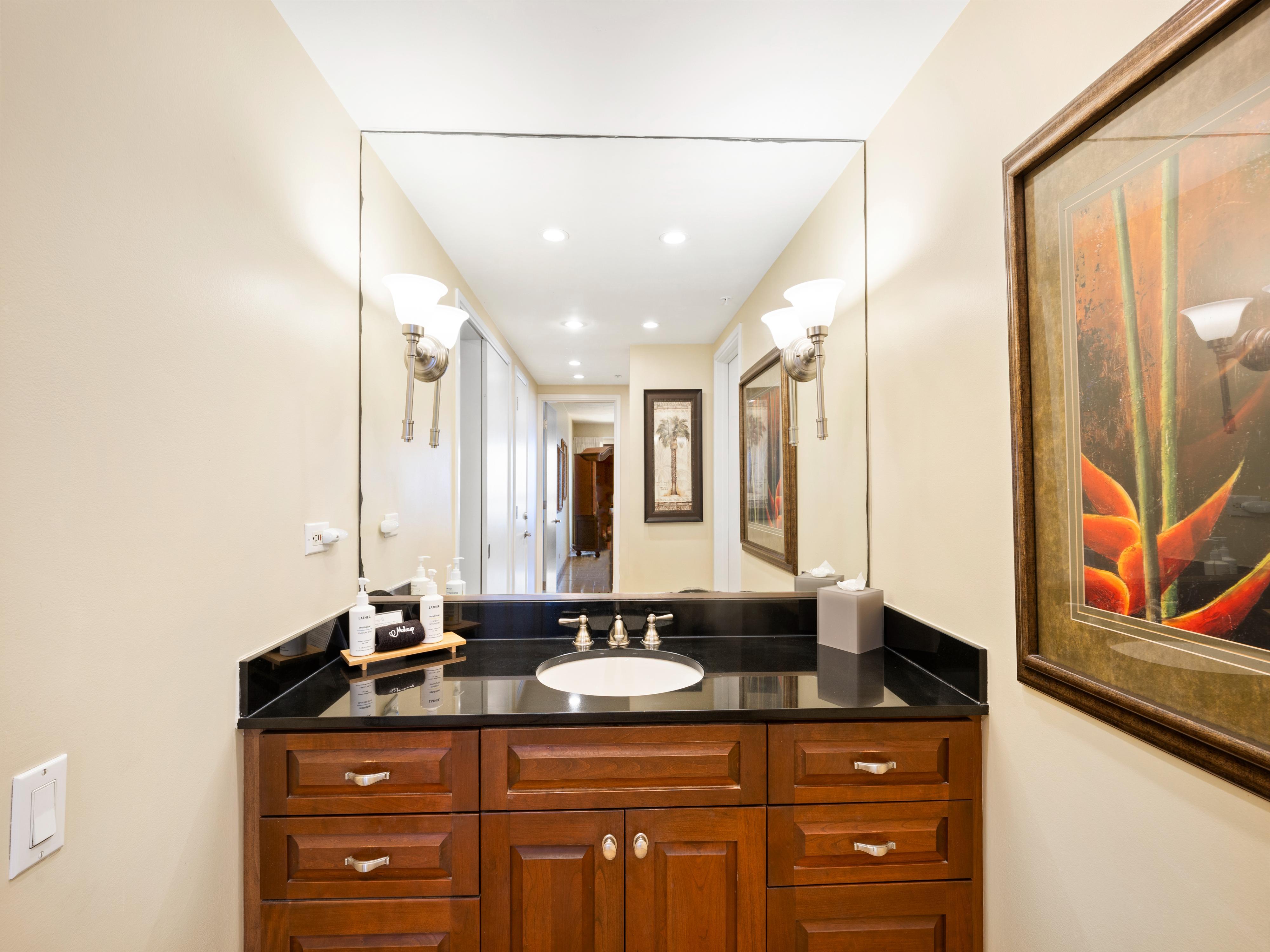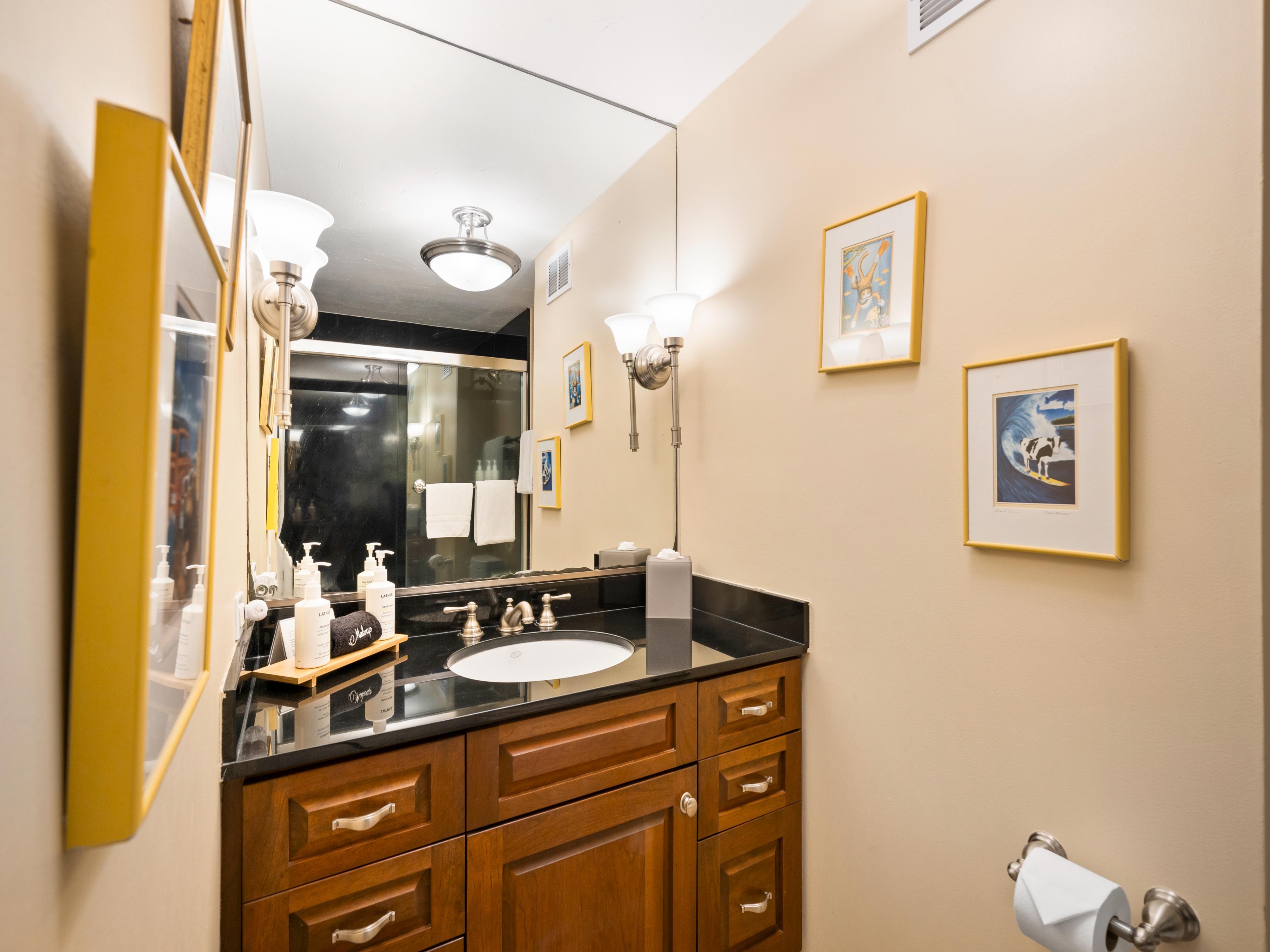 Inside, the condo blends bohemian island charm with refined comfort. The kitchen features beautiful wood cabinetry, granite countertops, and modern appliances. Perfect for preparing casual breakfasts or elegant dinners. Guests can dine indoors beside floor-to-ceiling windows that frame the endless ocean views, or step out onto the lanai to enjoy meals in the open air with the sound of the surf as their soundtrack.