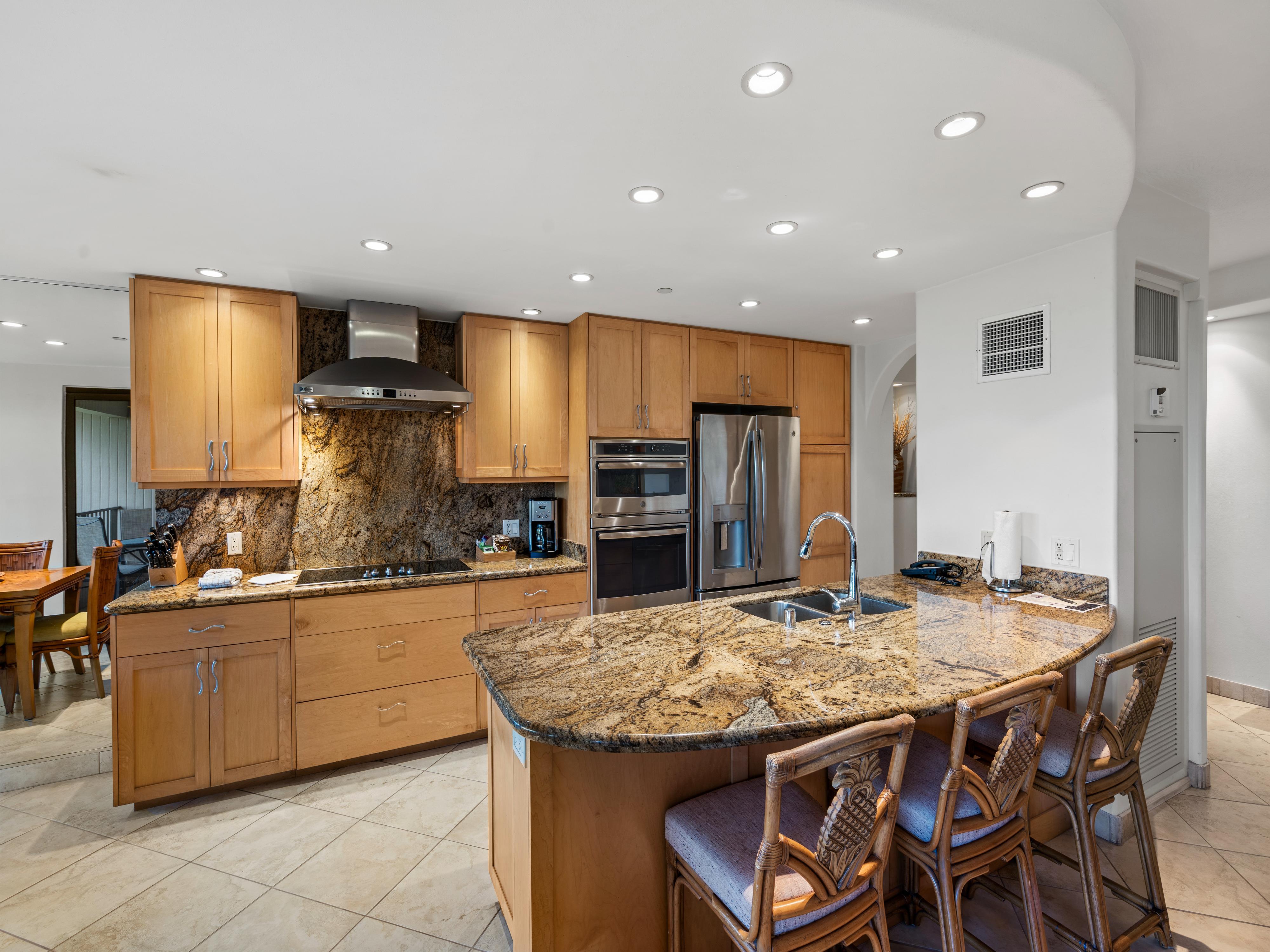 Inside, the residence has been tastefully updated with Hawaiian décor and light wood cabinetry that enhances the warm, inviting atmosphere. The fully equipped kitchen features stainless steel appliances, granite countertops, and bar seating for three, making it an easy and enjoyable space for preparing meals or sharing casual bites.
