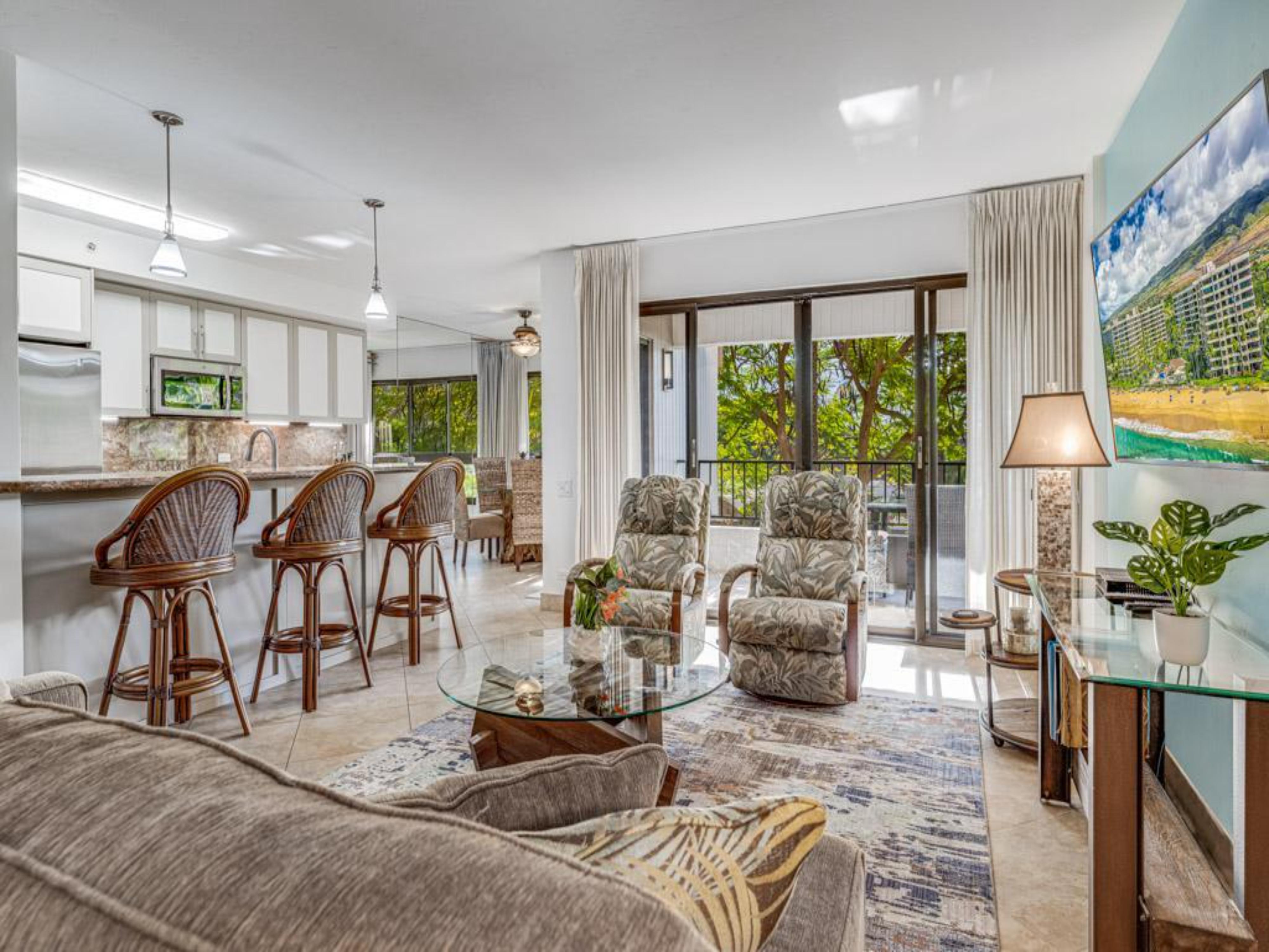 Kaanapali Alii 433 is beautiful one-bedroom garden view condo with a fully enclosed den that comfortably serves as a second bedroom. Spanning an impressive 1,513 square feet, this spacious condo offers plenty of room for guests to settle in and feel at home. The abundance of windows and large private lanai allow for constant views of the vibrant greenery around the resort, reminding you that you’re in paradise.