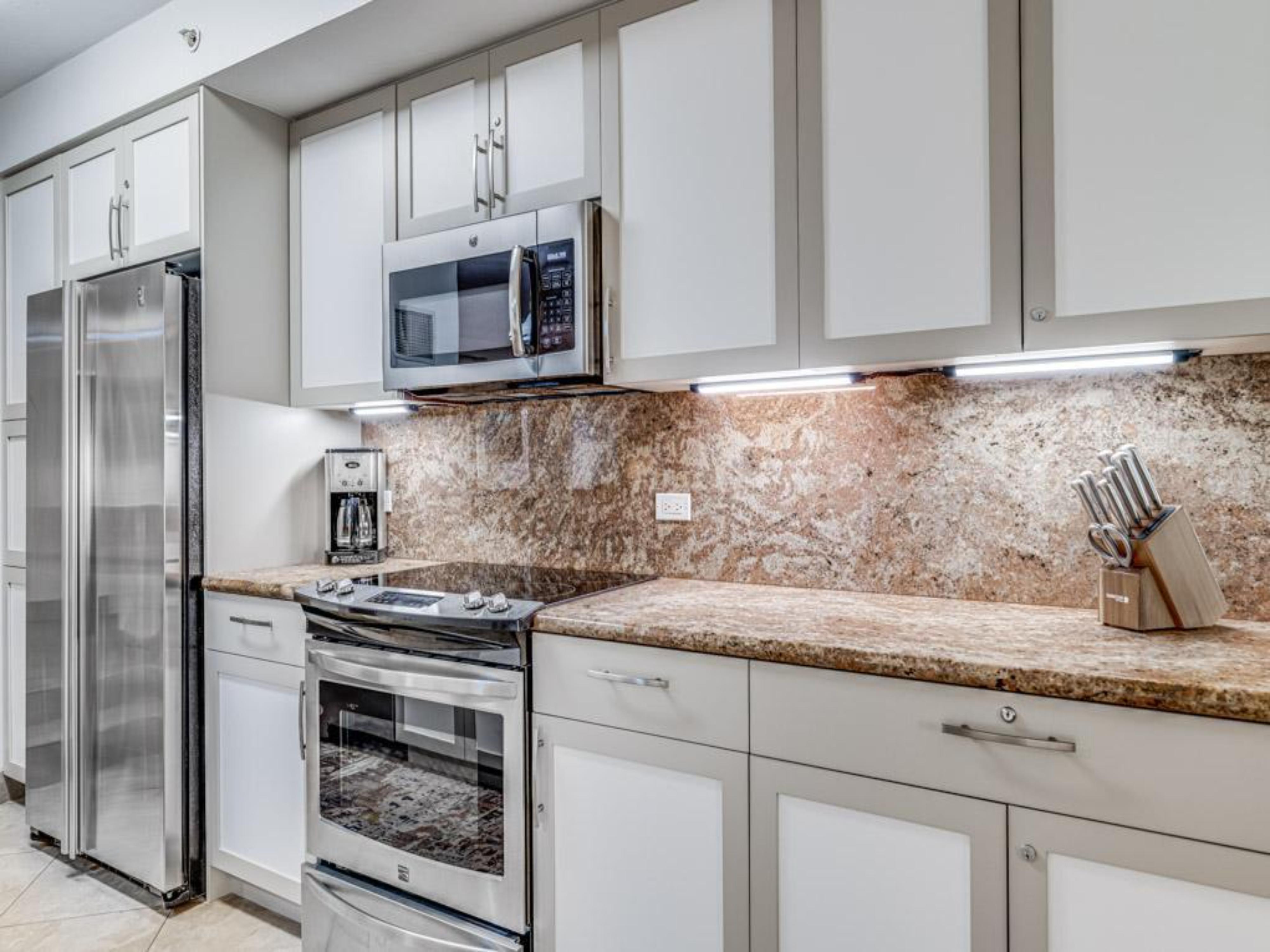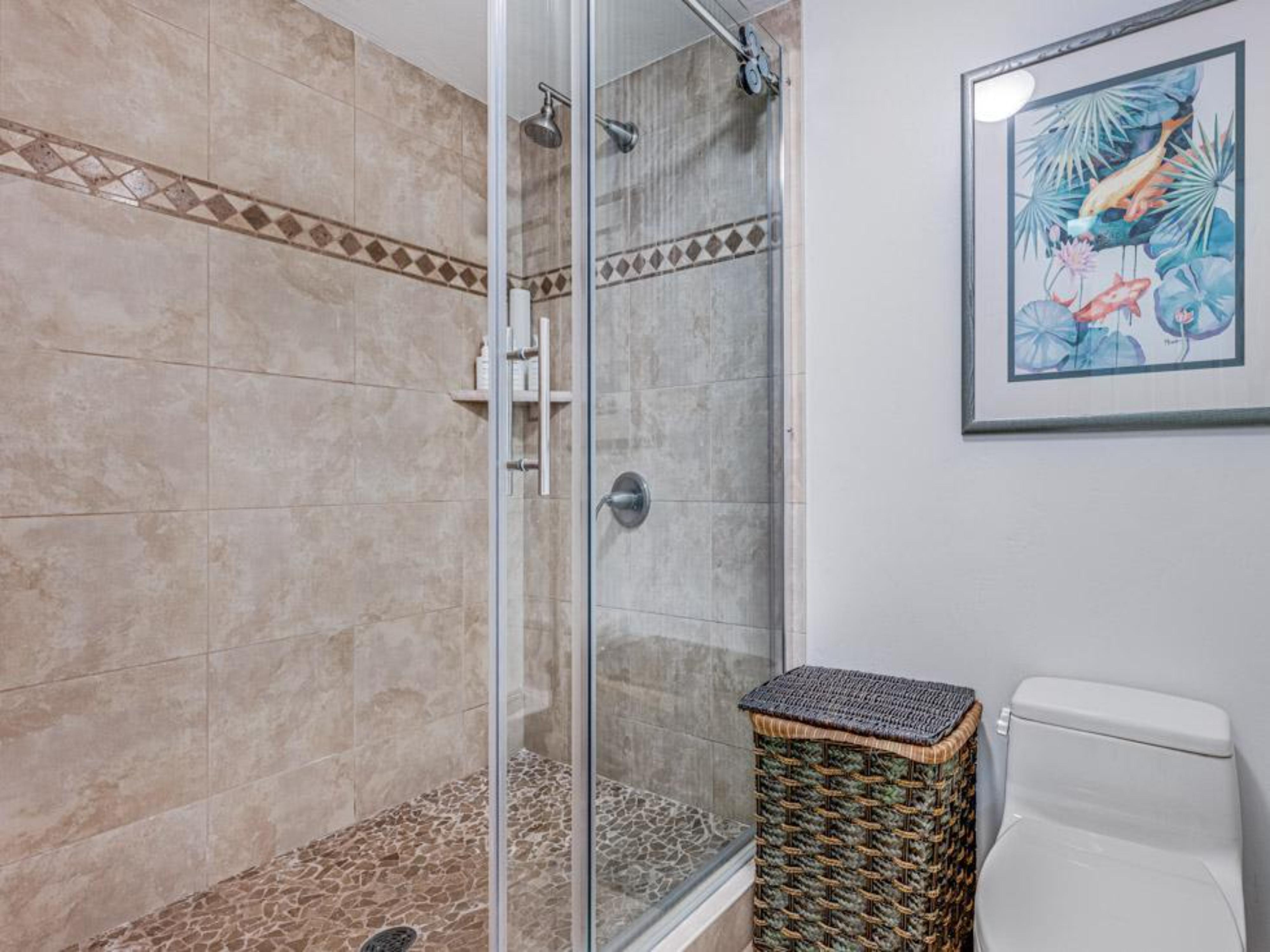 The primary bedroom has a California king bed while the enclosed den off the living room has a queen bed. A sleeper sofa brings the maximum occupancy to six guests.