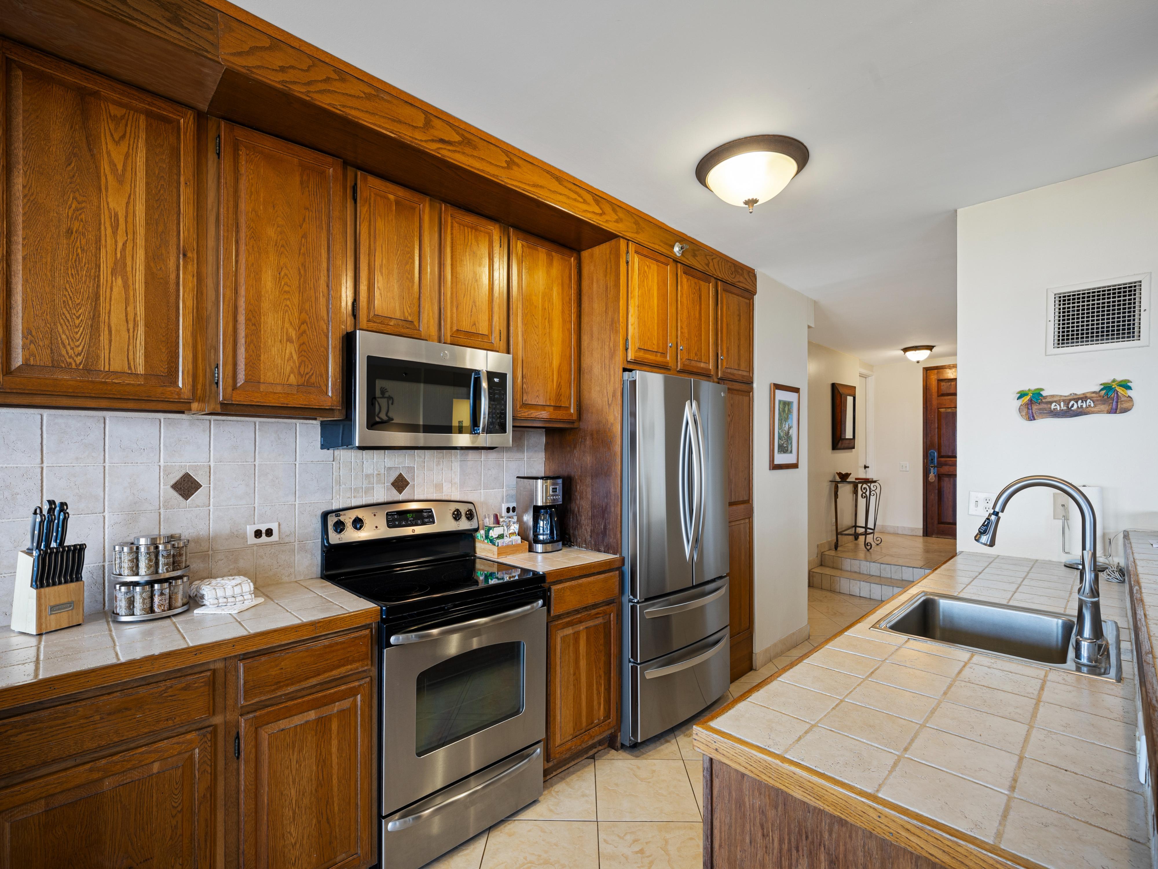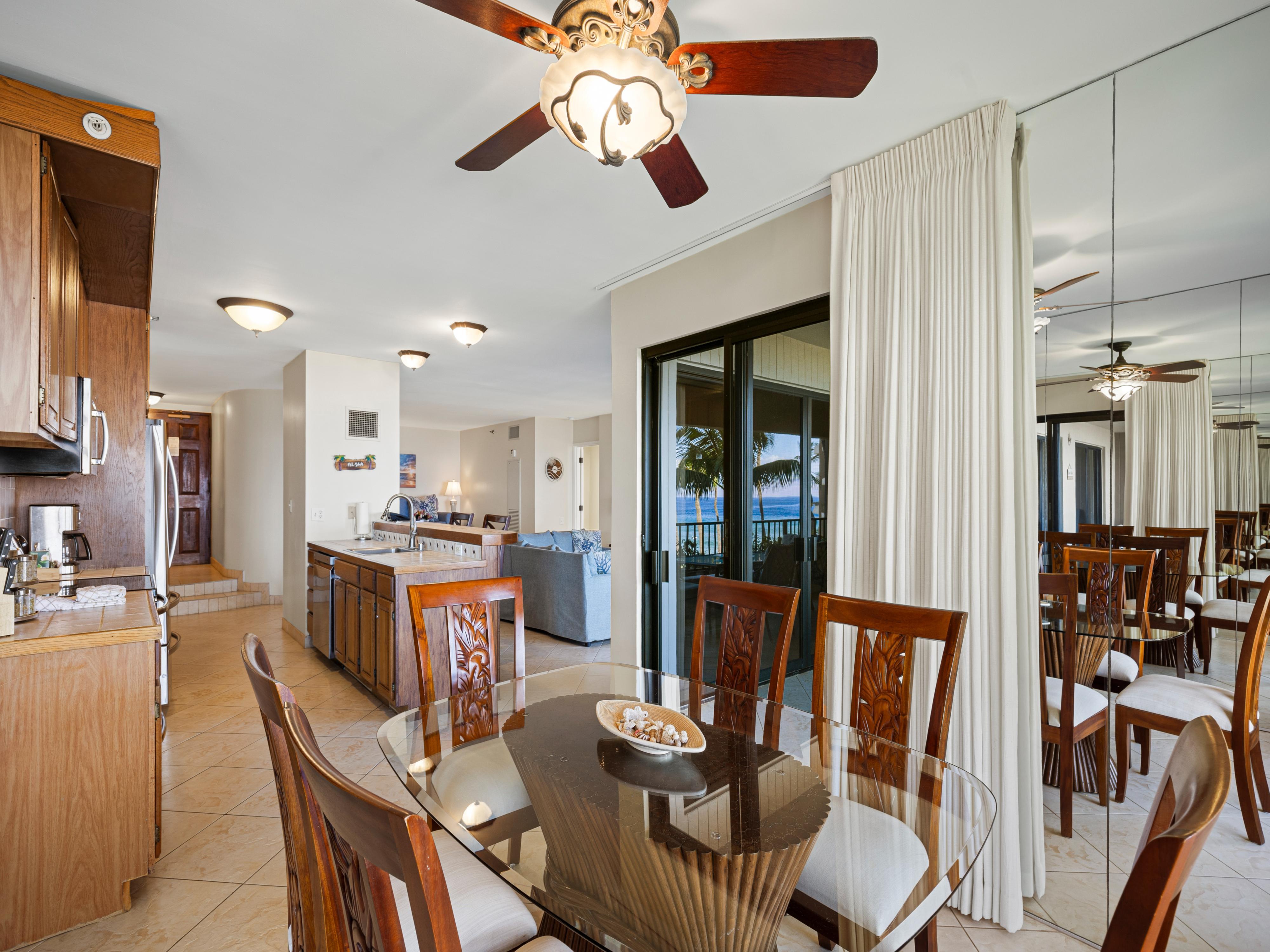 Inside, rustic island charm meets comfort and style, enhanced by Hawaiian décor that brings the spirit of Maui into every room. The residence offers plenty of seating, from the cozy leather couch to additional lounge areas that encourage gathering and relaxation. The dining table seats six, and the kitchen features three bar stools for casual meals or late-night snacks.
