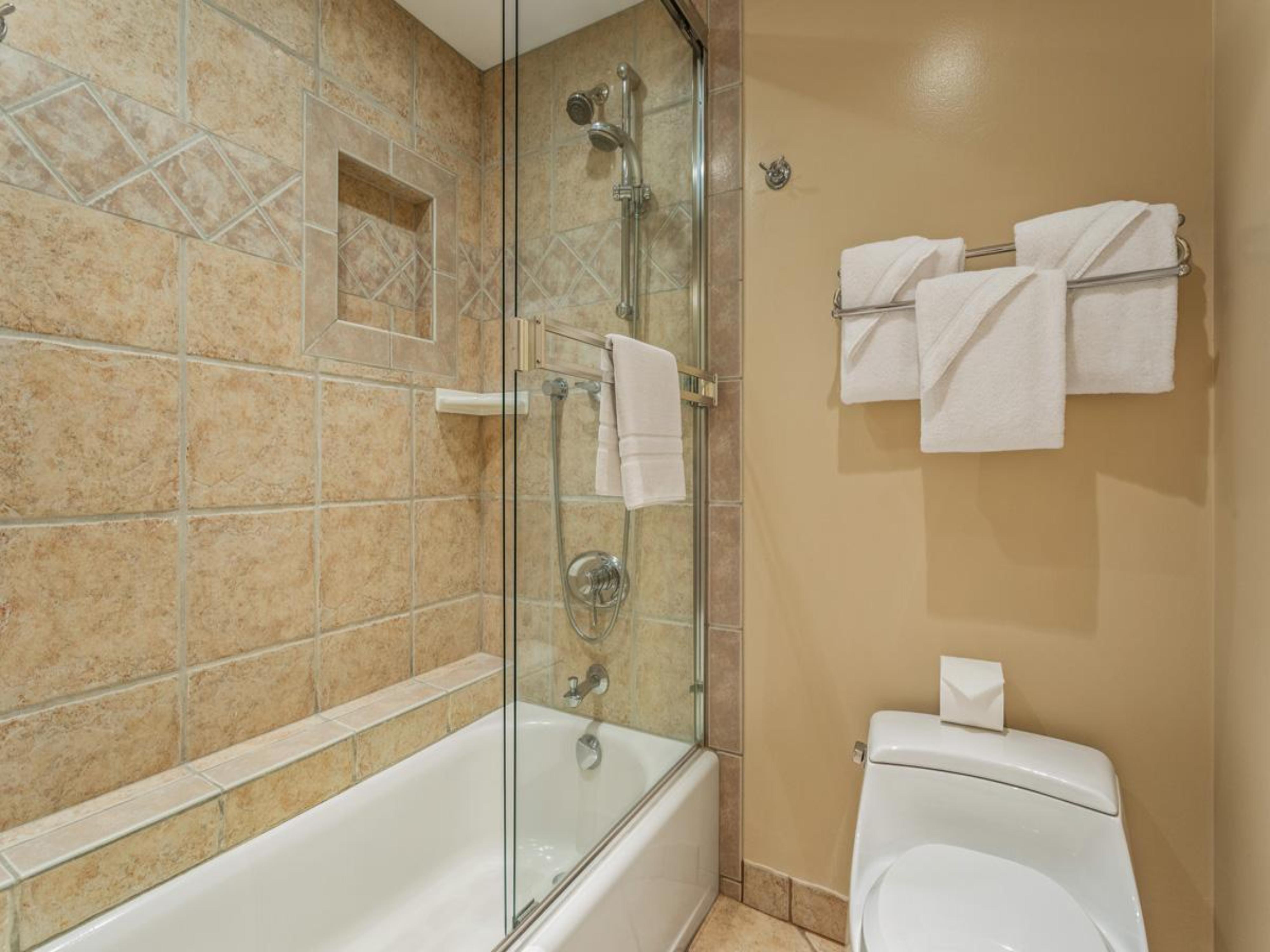 The second bedroom offers versatility with two queen beds, ideal for families or friends traveling together, and is paired with a bathroom that includes a vanity and a glass shower-tub combo.