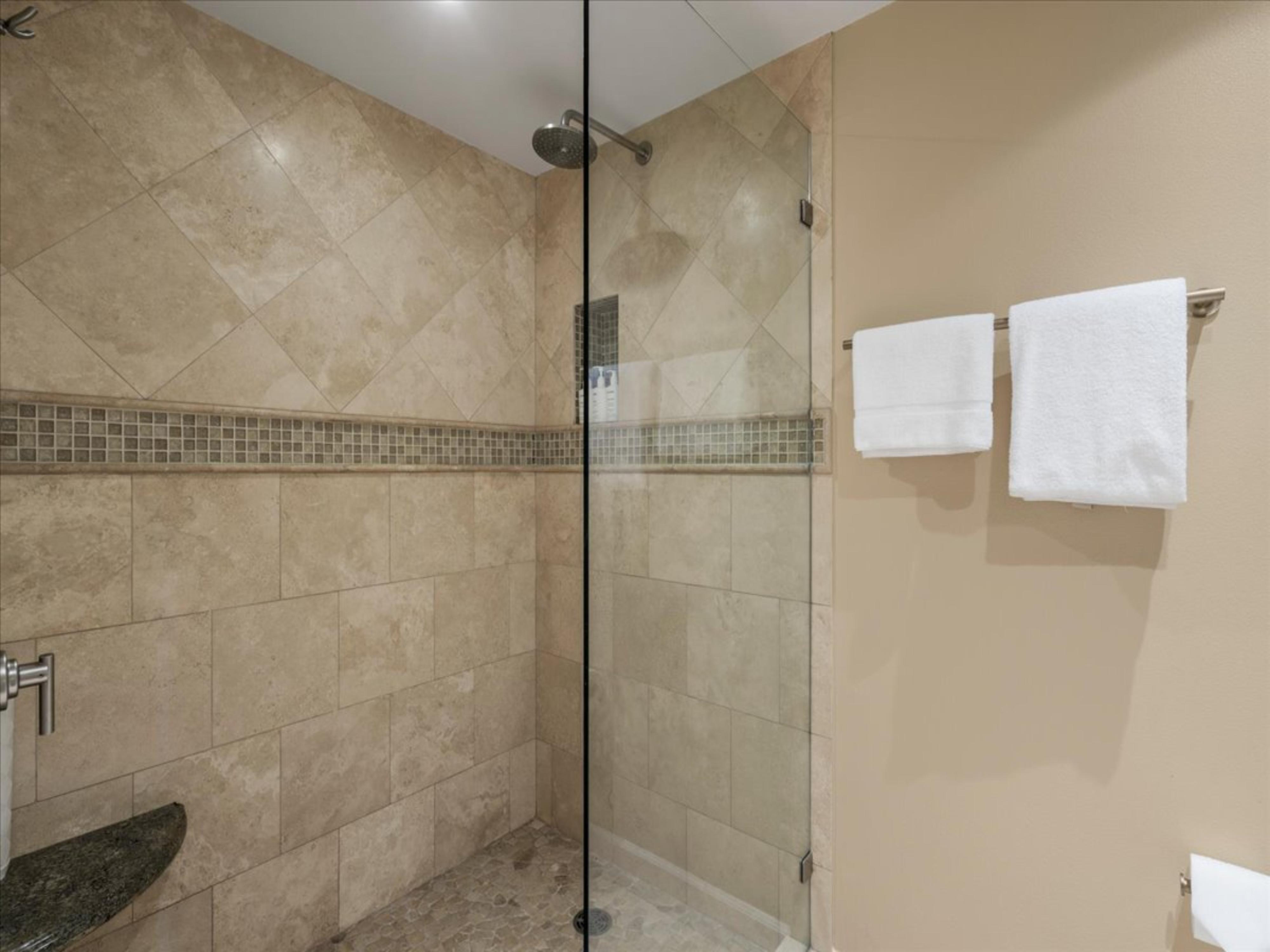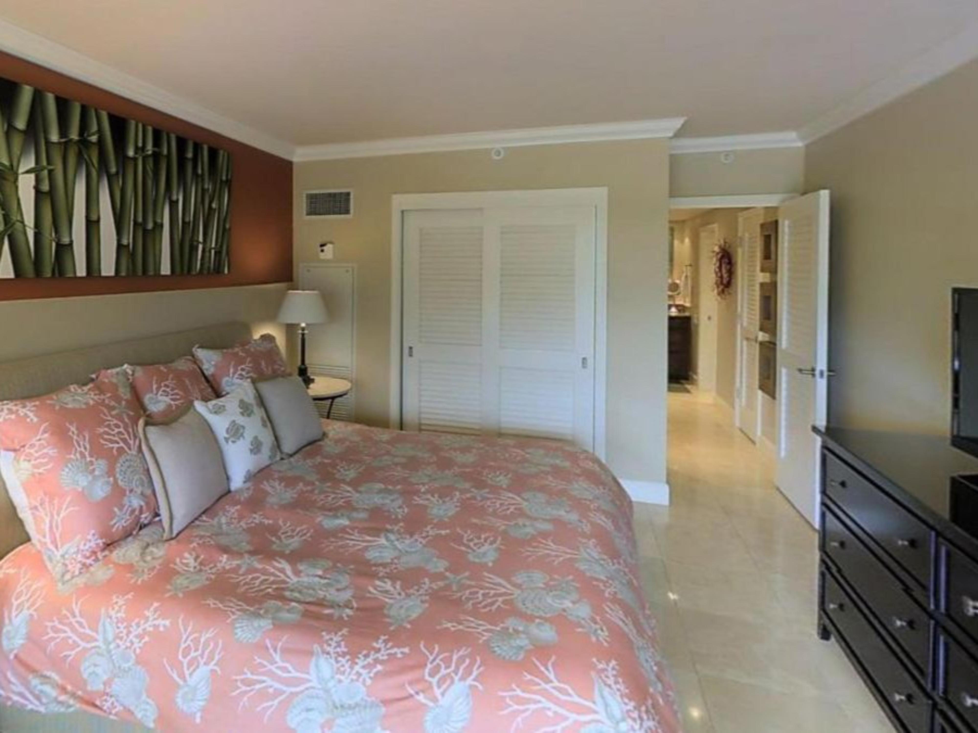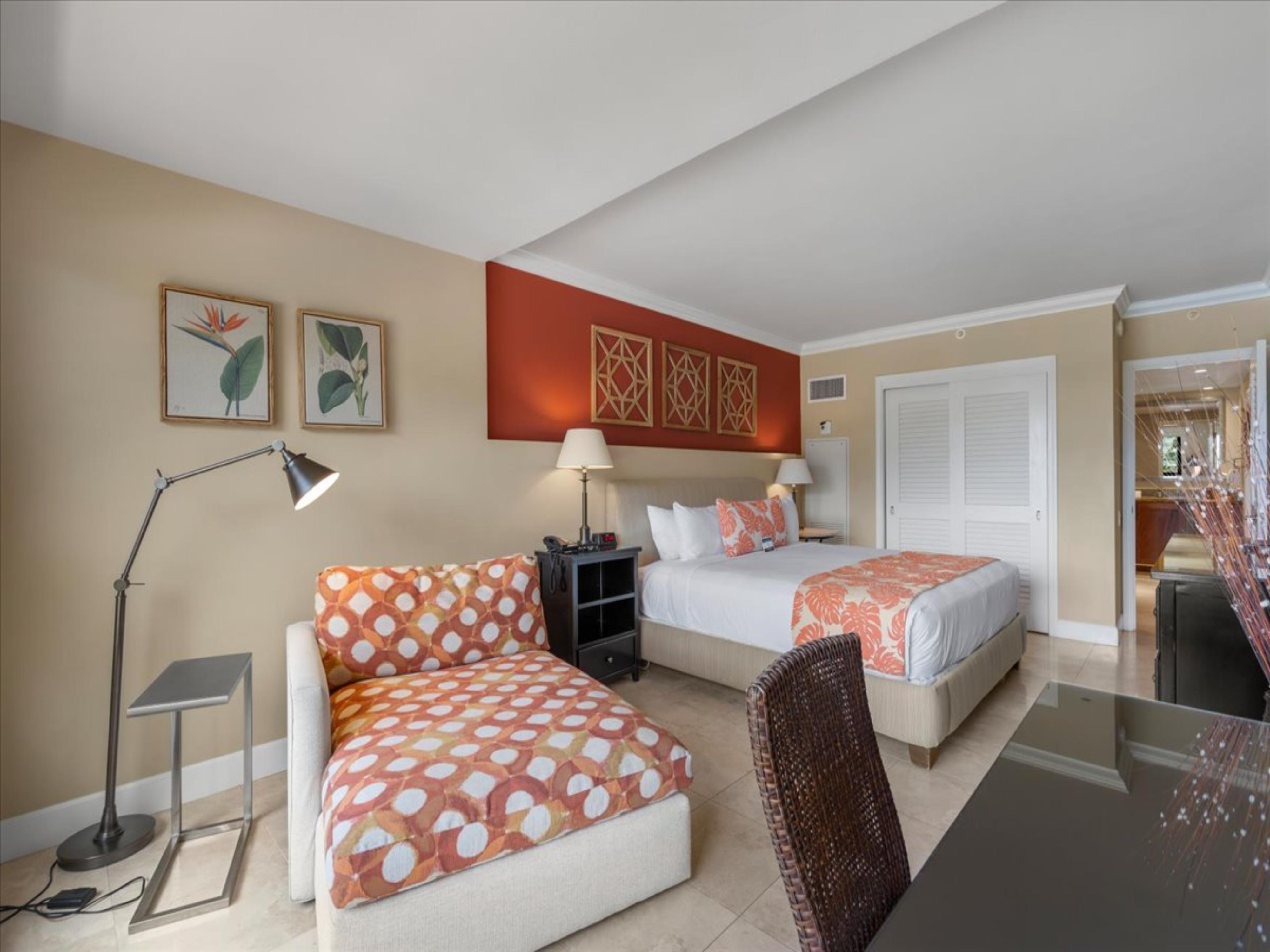 The primary bedroom features a California king bed, a chaise lounge perfect for reading, and a private workstation for guests who may need to stay connected during their stay. The fully enclosed den includes a queen bed and a wall-mounted TV, offering a peaceful and comfortable retreat at night.