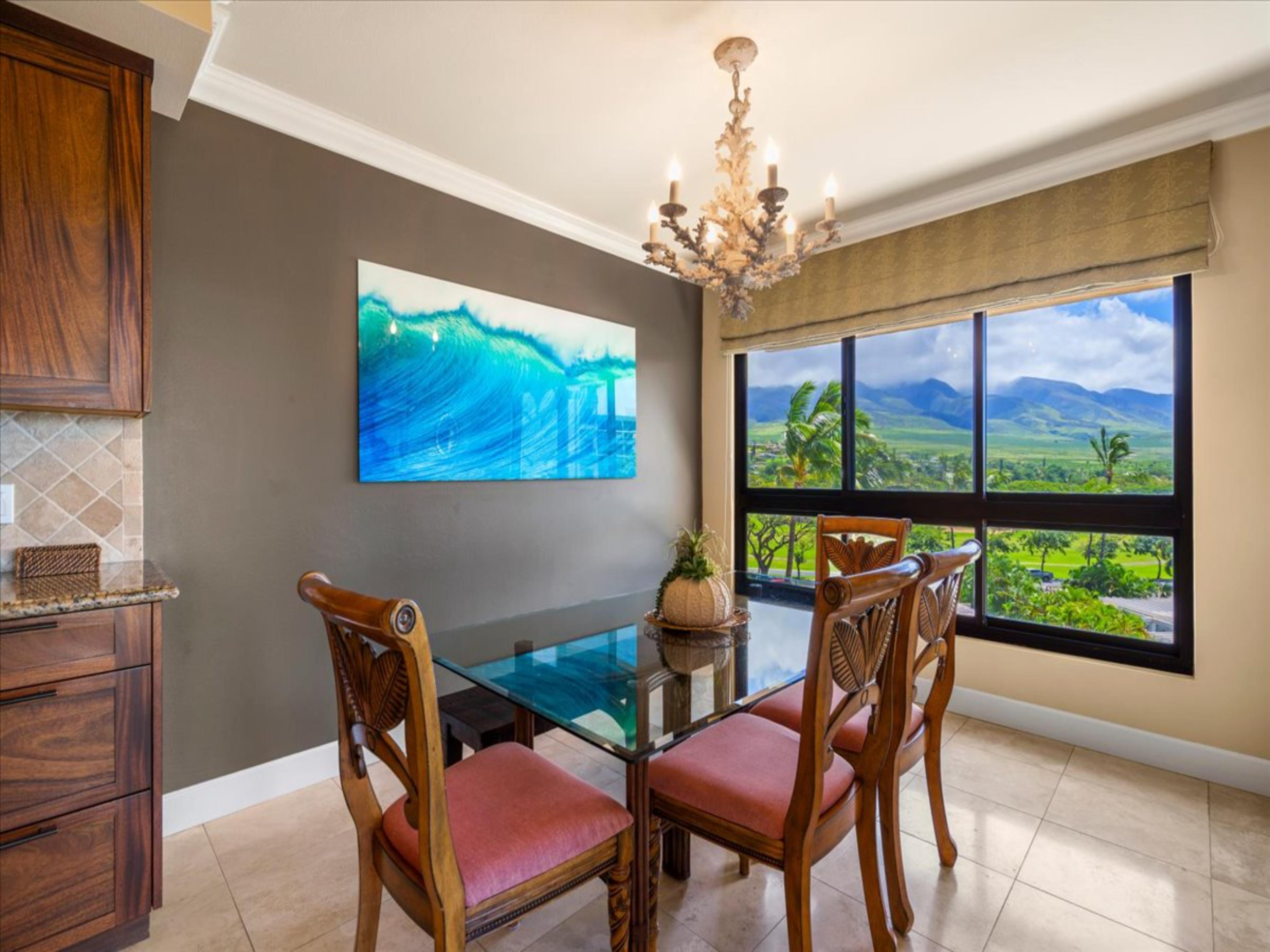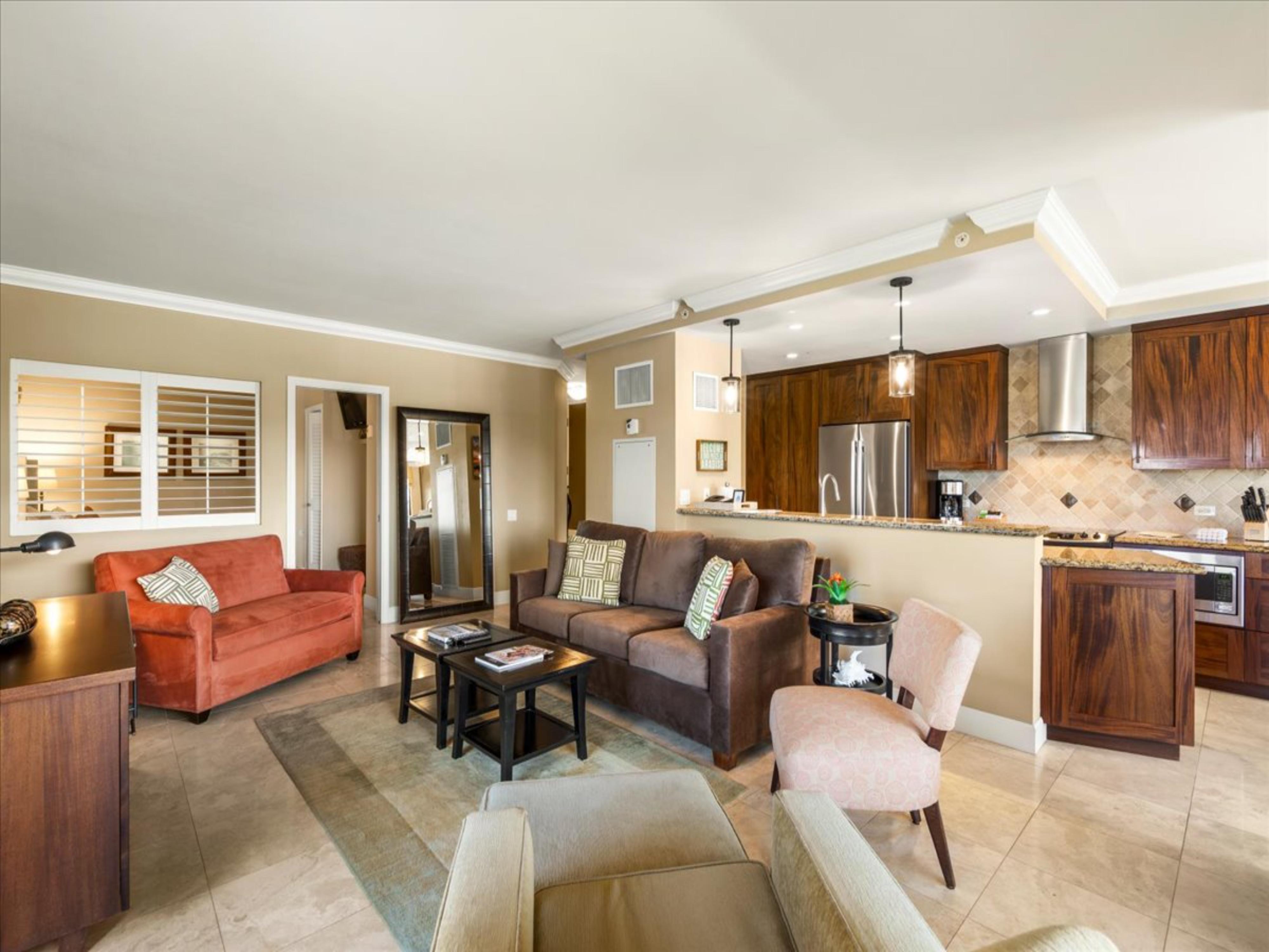 The fully equipped kitchen opens seamlessly into the dining area and comfortable living room, providing an effortless space for gathering and relaxing after a day of exploring Maui. Oversized windows bring in abundant natural light, enhancing the bright, airy ambiance throughout the home.