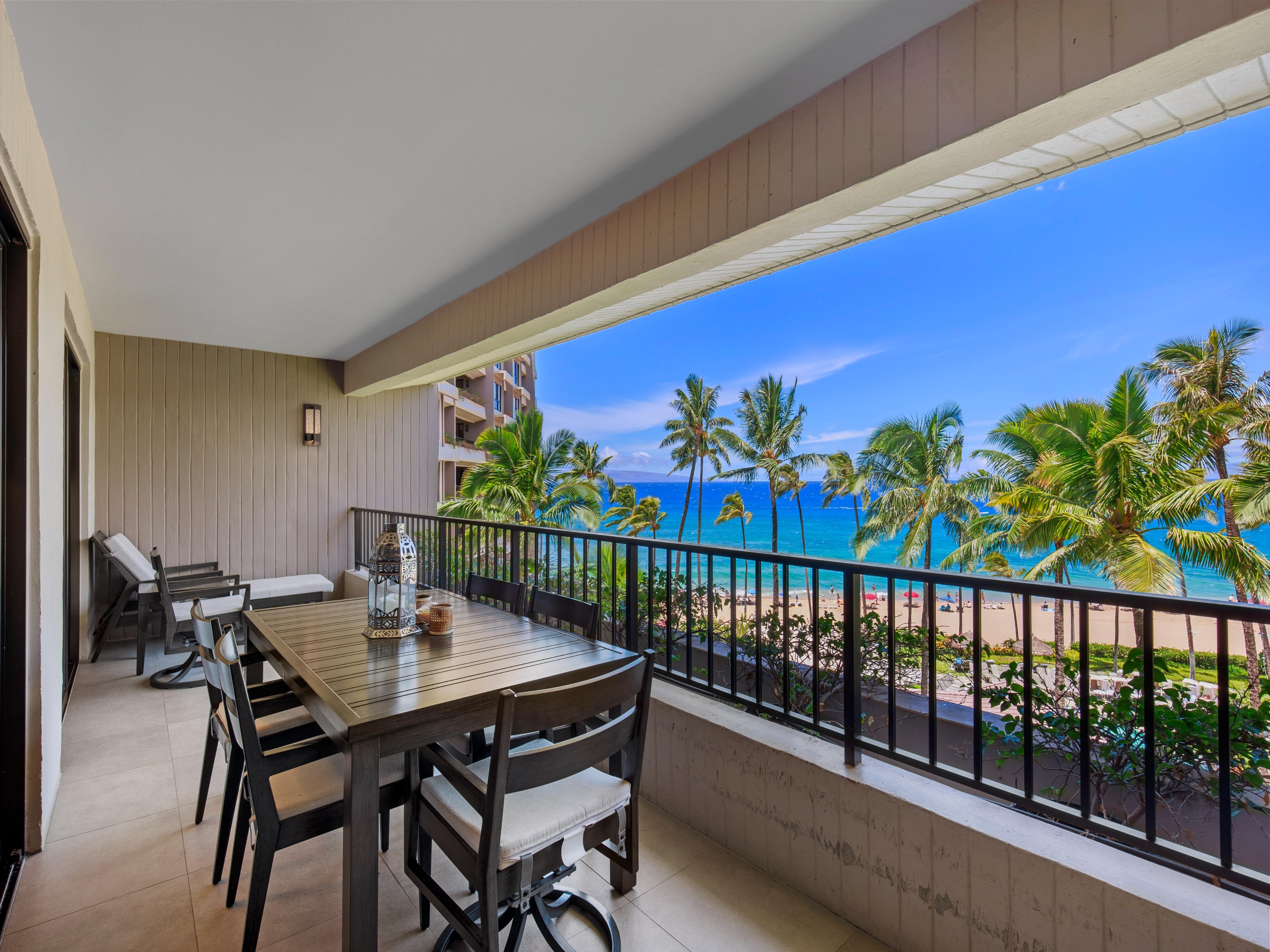 Step onto the private lanai designed to provide a perfect blend of indoor comfort and outdoor relaxation. It's ample seating and dining makes it an ideal spot for enjoying beautiful sunsets, tropical breezes, and dining al fresco.