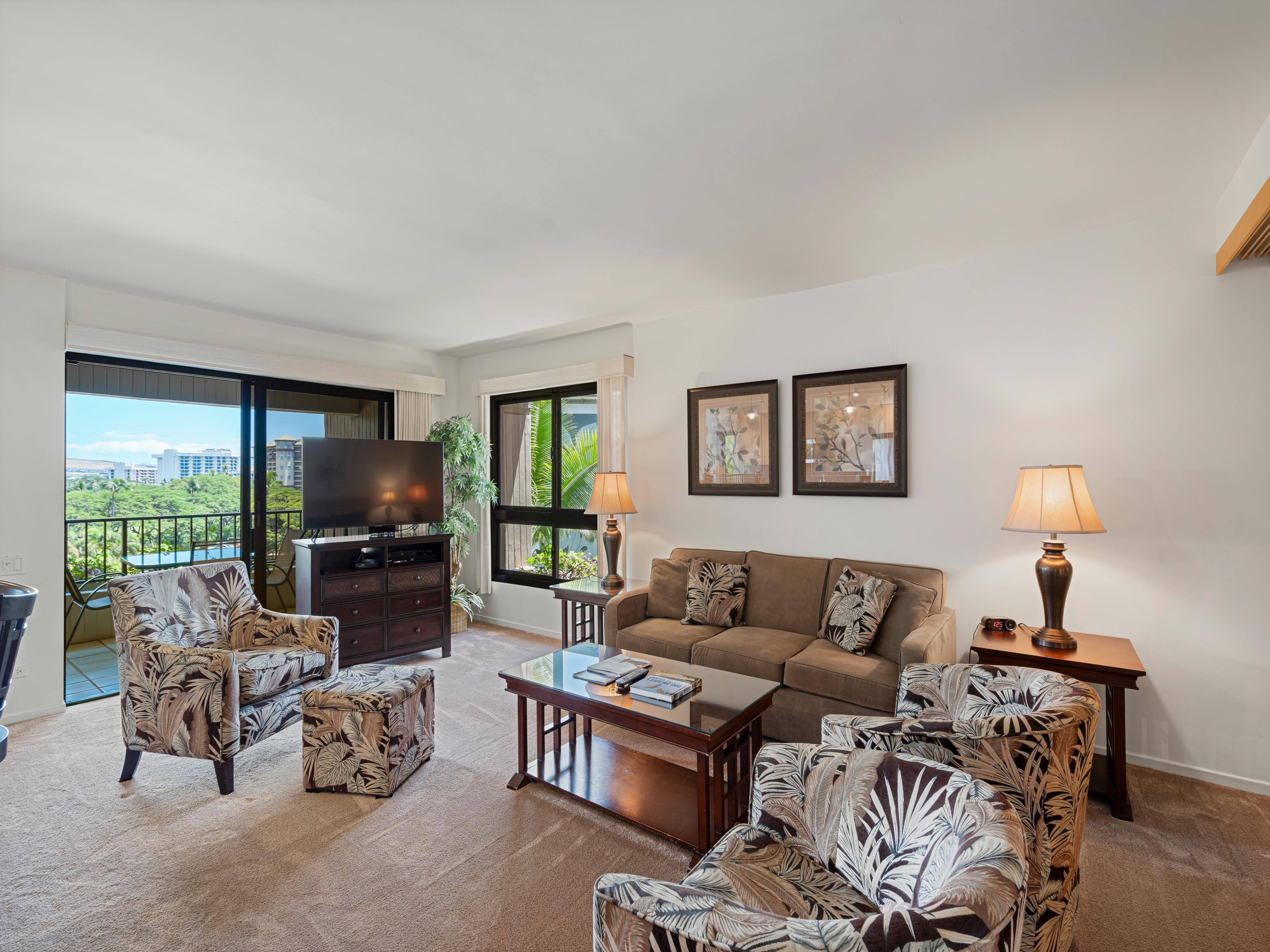 Welcome to Kaanapali Alii 471, a beautifully appointed one-bedroom condo with a fully enclosed den that comfortably serves as a second bedroom. Light furniture, light wood accents, and a bright, airy interior create a clean and serene atmosphere throughout the residence. Partial ocean views framed by swaying palms and lush tropical landscaping can be enjoyed from the private balcony.
