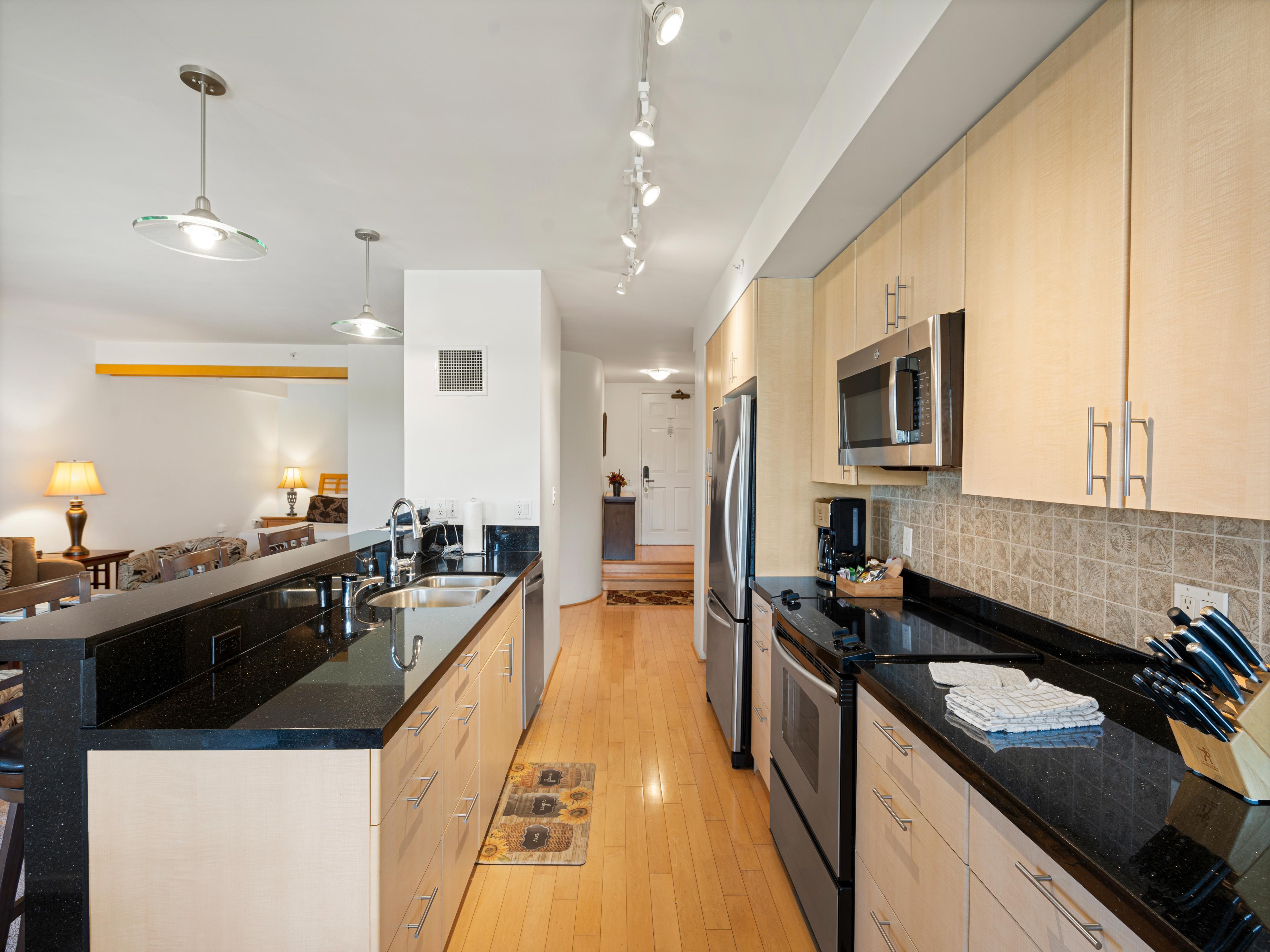 Inside, the spacious open living area features tasteful island-inspired décor and a generous amount of comfortable seating, making it easy to relax after days on the beach. The fully equipped kitchen includes stainless steel appliances, light cabinetry, and three bar stools, creating an inviting space for casual dining or morning coffee.