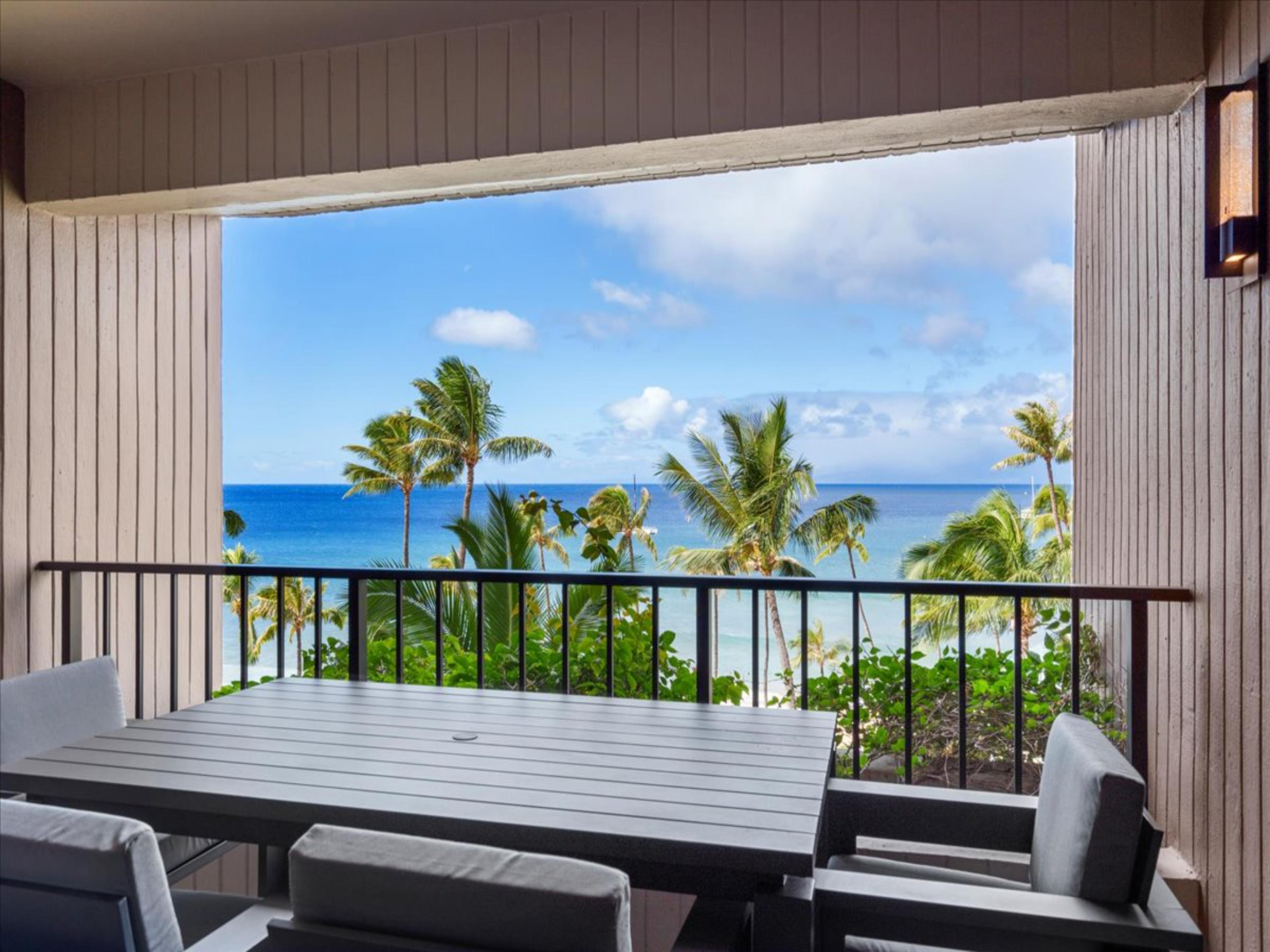 Step outside to the private lanai, where lounge chairs and a dining table create the perfect spot to enjoy the ocean breeze. Sunset views from this elevated outdoor haven are especially memorable, offering both beauty and privacy as the sky beautifully transforms each evening.