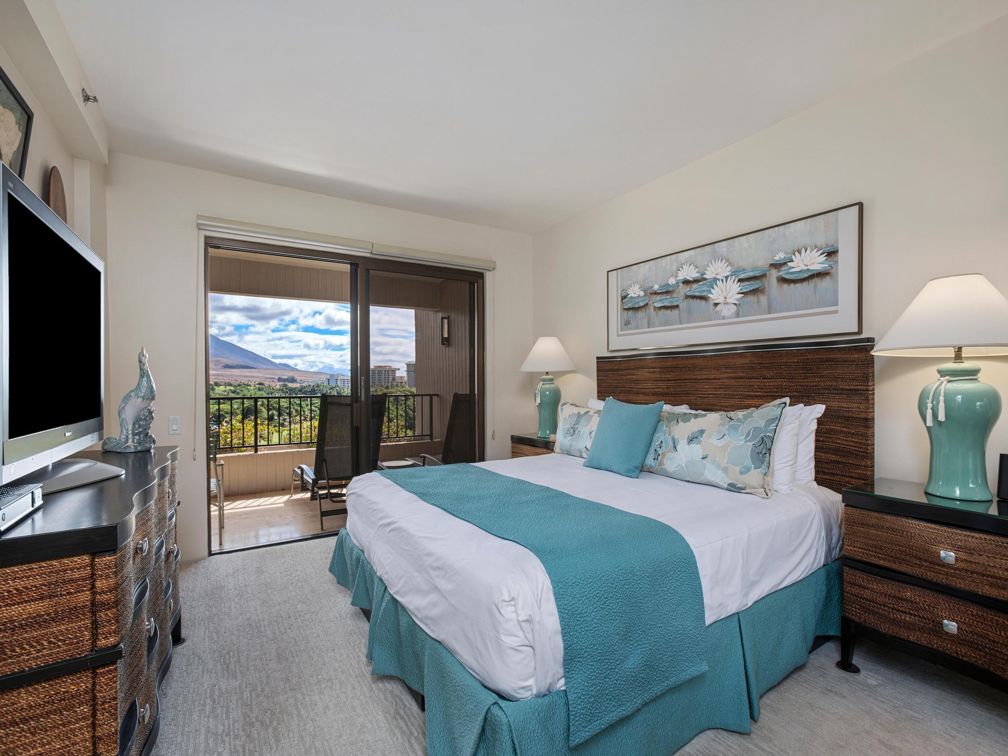 Whether you're traveling with kids or another couple, Kaanapali Alii 483 offers ample bedding options. The enclosed den, conveniently located off the living room, features a queen-sized bed and can be partitioned off for added privacy, serving as the second bedroom. A wall-mounted flat-screen TV in this room allows for personal viewing before drifting off to sleep. The primary bedroom, furnished with a comfortable king-sized bed, also provides private access to the lanai, where you can gaze at the verdant mountain slopes. A sofa bed in the living room adds even extra sleeping arrangements.