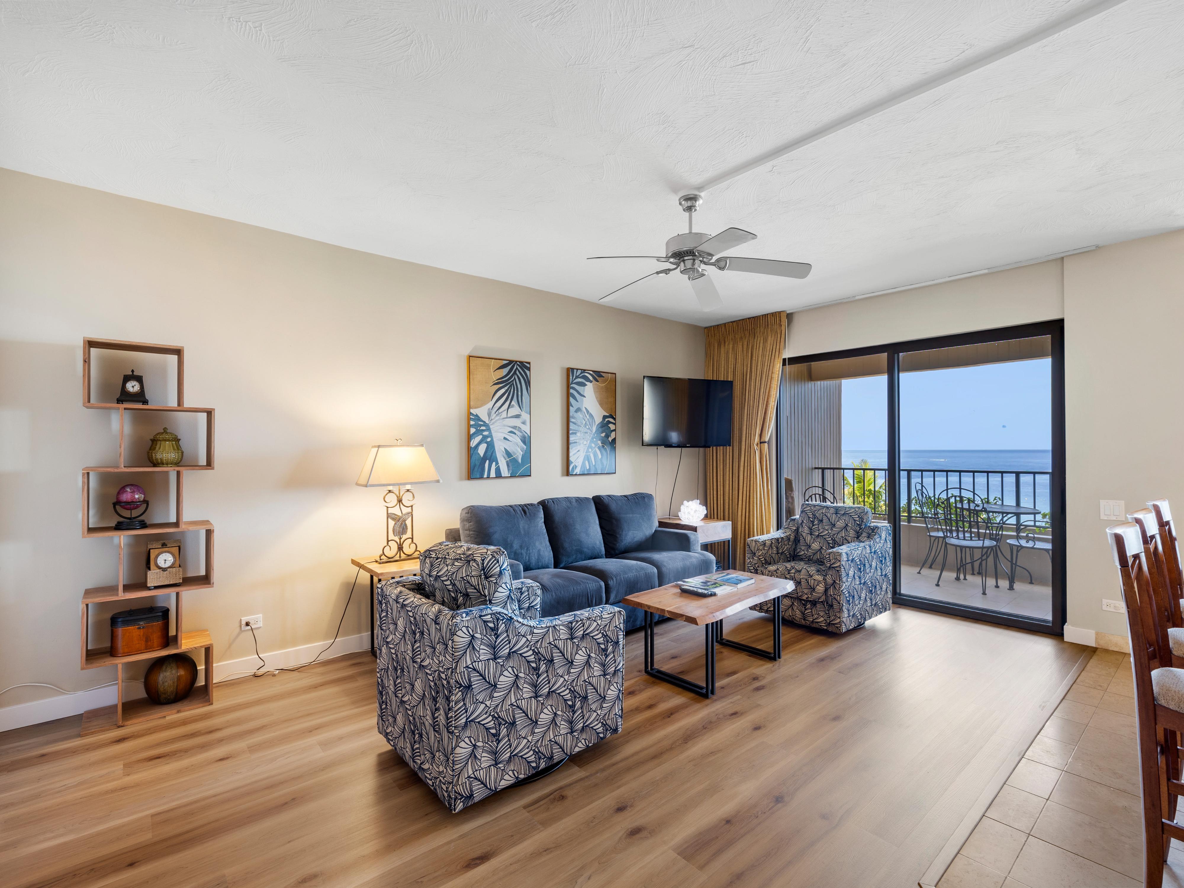 The adjacent dining area seats six and flows into a stylish lounge that is perfect for gathering with family and friends after a day in the sun. With its updated finishes, thoughtful décor, and spacious design, Kaanapali Alii 492 blends modern comfort with a refined island feel.