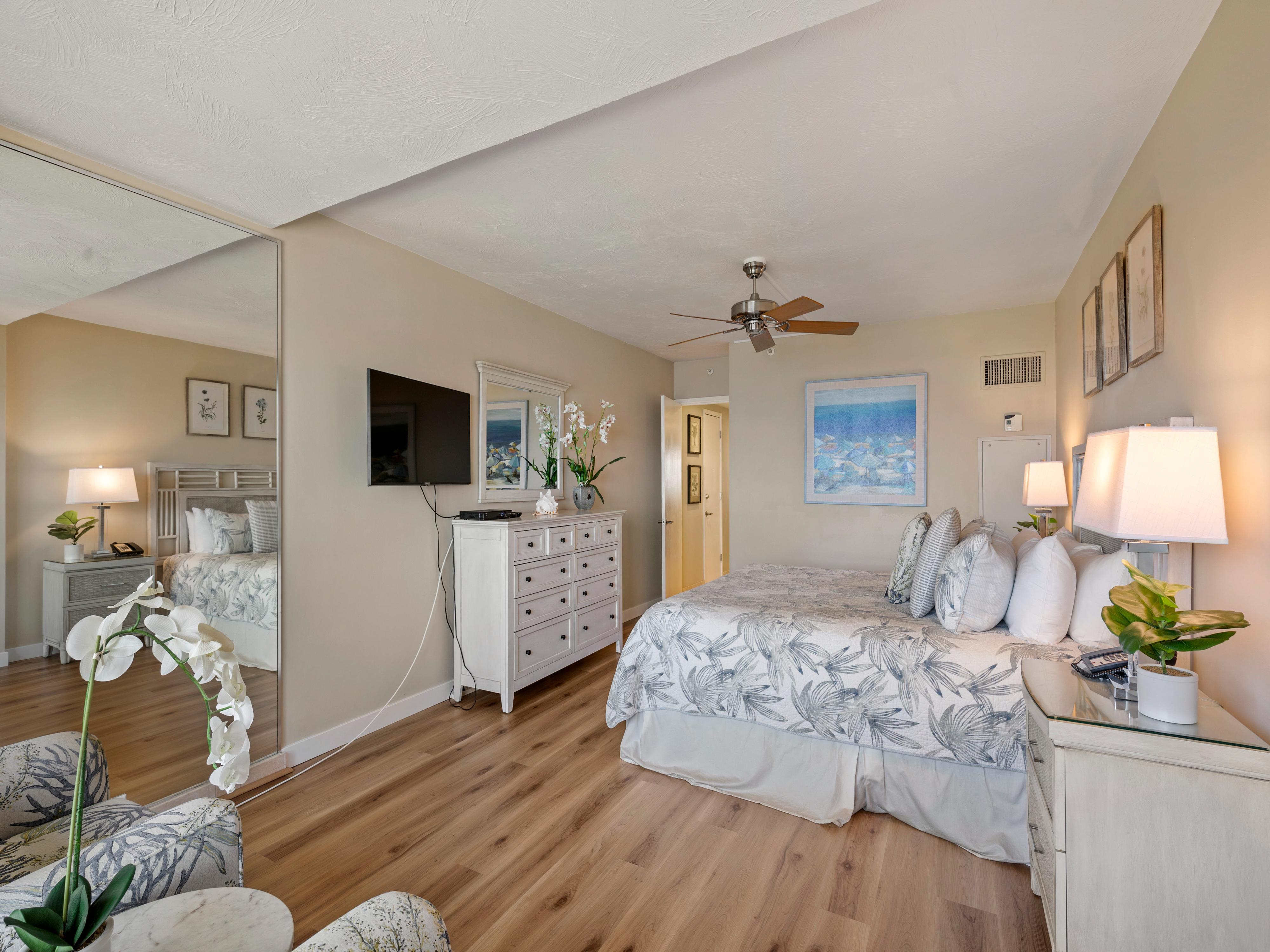 Inside, the condo features clean and sleek interiors with updated flooring and fun blue design elements that evoke the colors of the ocean. The bright, open layout is designed for effortless comfort and relaxation. The fully stocked gourmet kitchen includes high-end stainless steel appliances, light wood cabinetry, generous workspace, and bar seating for three that creates an inviting place for casual dining or morning coffee.