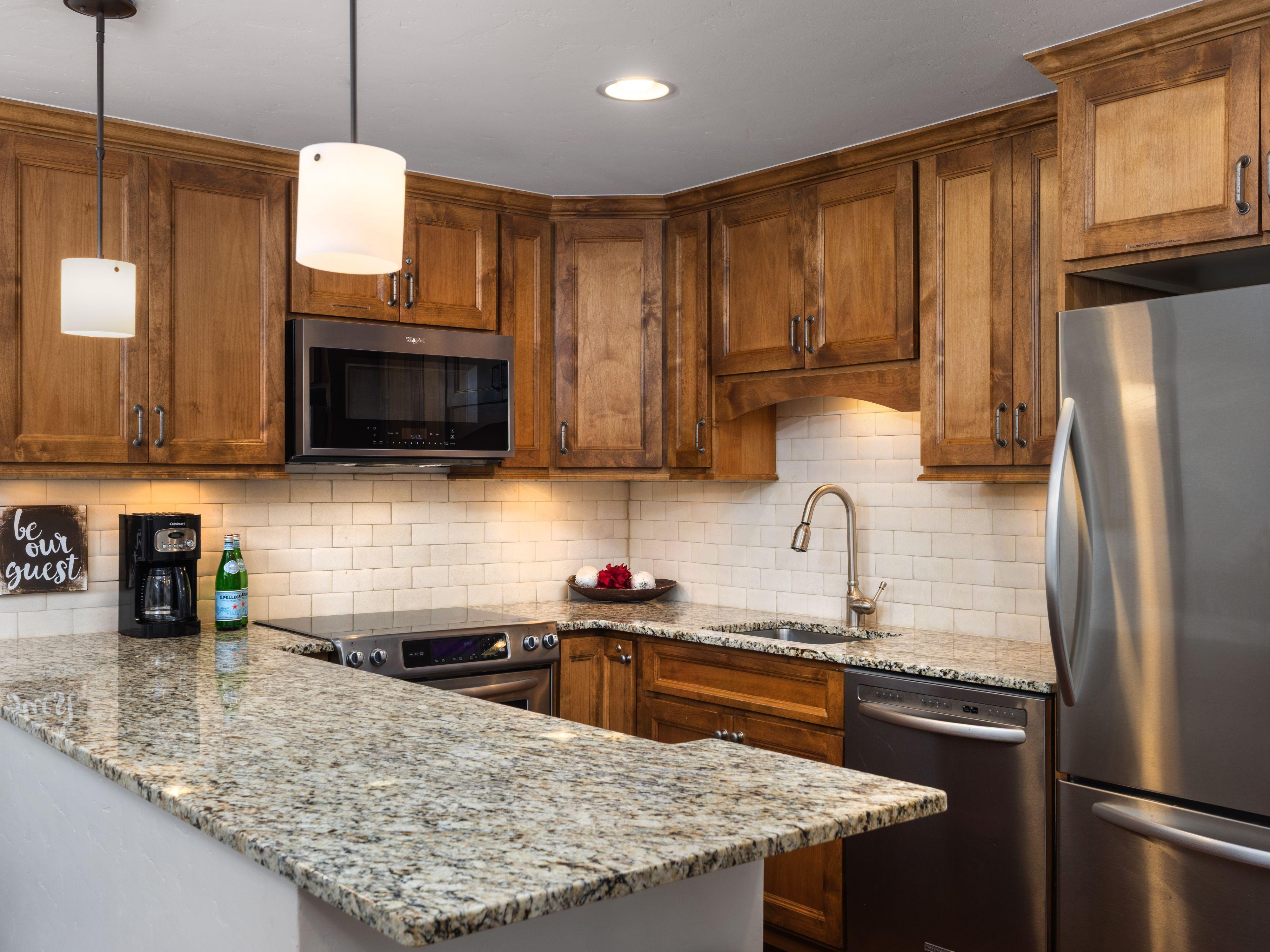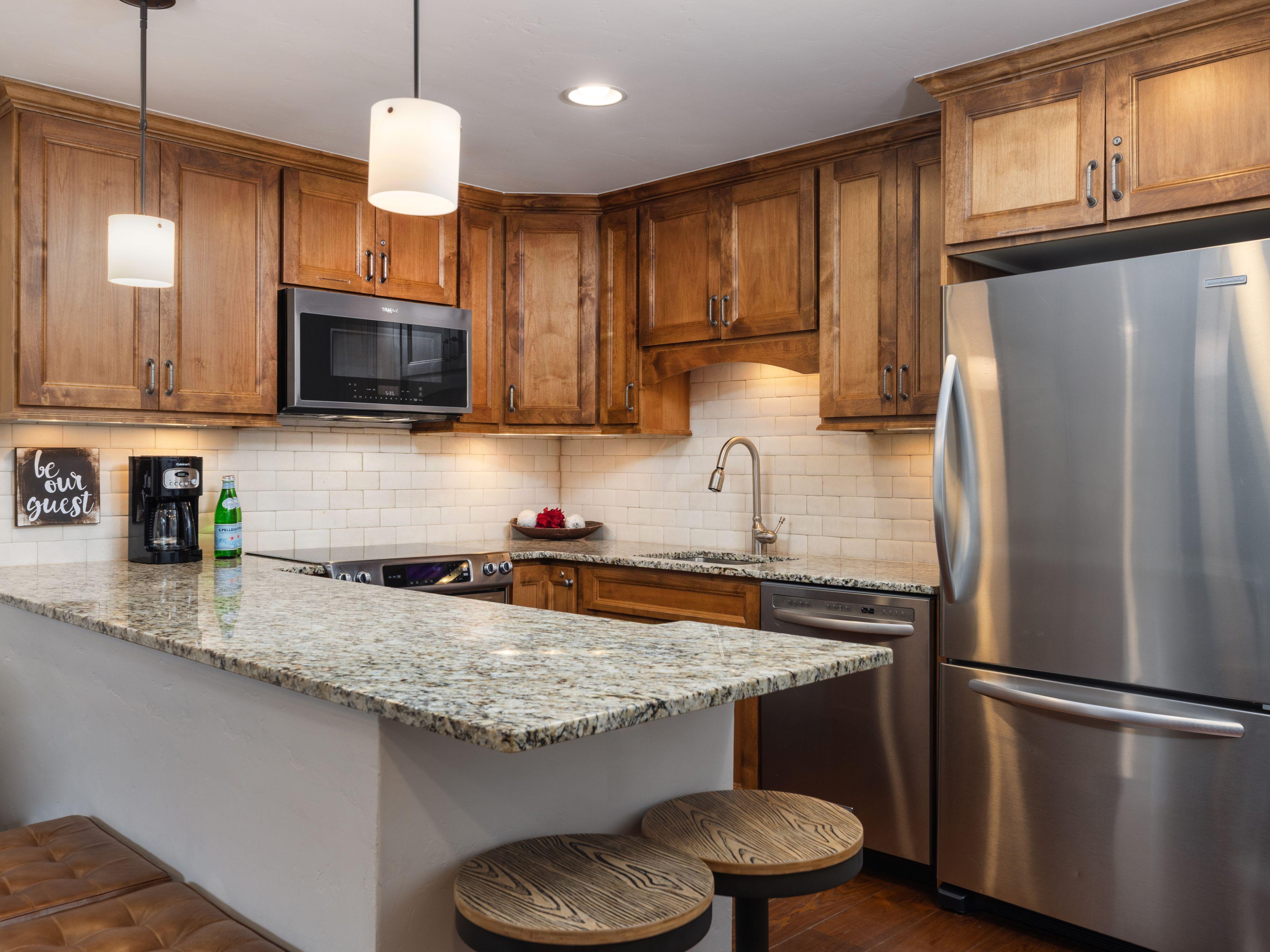 Landmark 118 is a spacious 720 square foot mountain view condominium in Lionshead Village with air conditioning, offering a comfortable and modern retreat for your Vail stay. This one-bedroom, one-bathroom unit features a master bedroom with a king bed and an additional 'flex' bedroom with a full bed, along with a pull-out sleeper sofa in the living area, making it ideal for families or small groups. Enjoy the fully equipped kitchen with granite countertops and hardwood floors, perfect for preparing meals after a day on the mountain.
