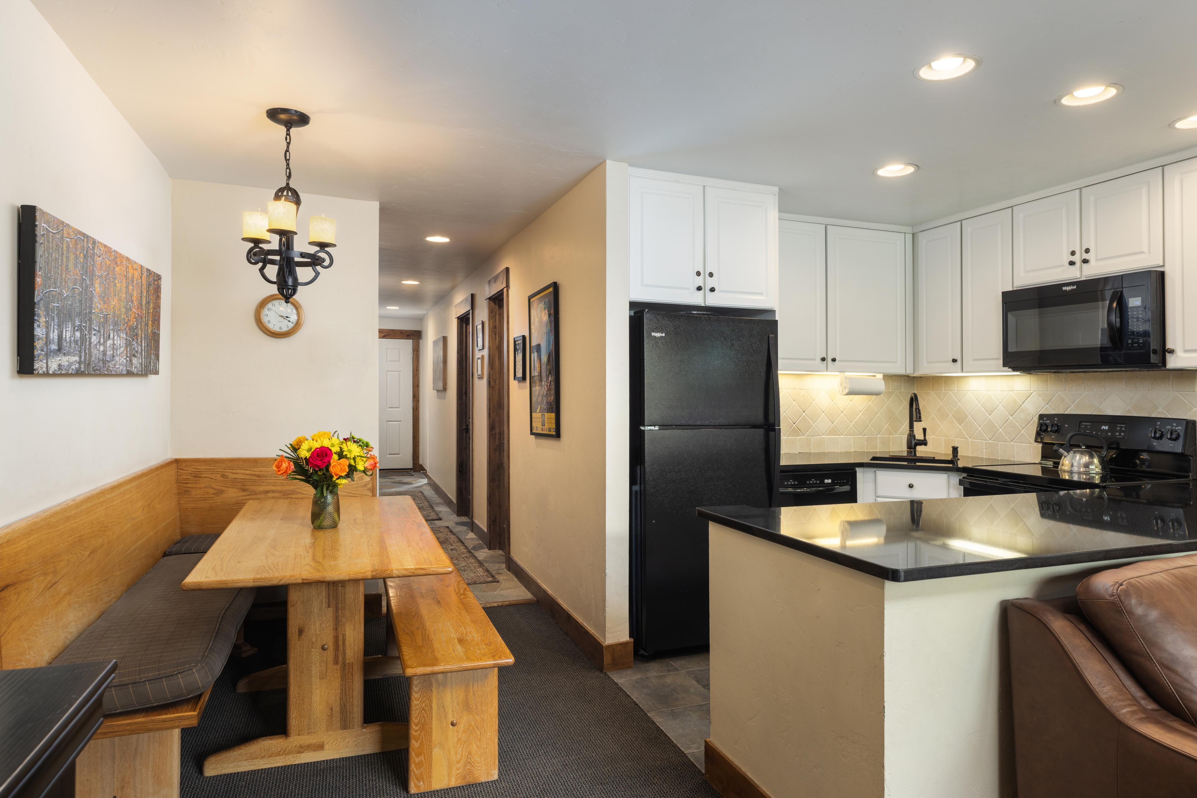 Landmark 209 is a 1,310 square-foot, two-level retreat. This residence features a mountain-inspired décor with stone flooring in the entryway and guest bathroom, a fully equipped kitchen with granite countertops and upgraded appliances, and a cozy living area with leather furnishings, a flat-screen TV, and a stone gas fireplace. Each of the three bedrooms is tastefully decorated, with the lower level offering one guest room and updated bath, while the second level includes a master suite with a gas fireplace and stunning mountain views, a third bedroom with twin beds and a private bath, and a washer/dryer. With ample space for a family or group of six, Landmark 209 is the perfect base for a memorable Vail ski vacation.