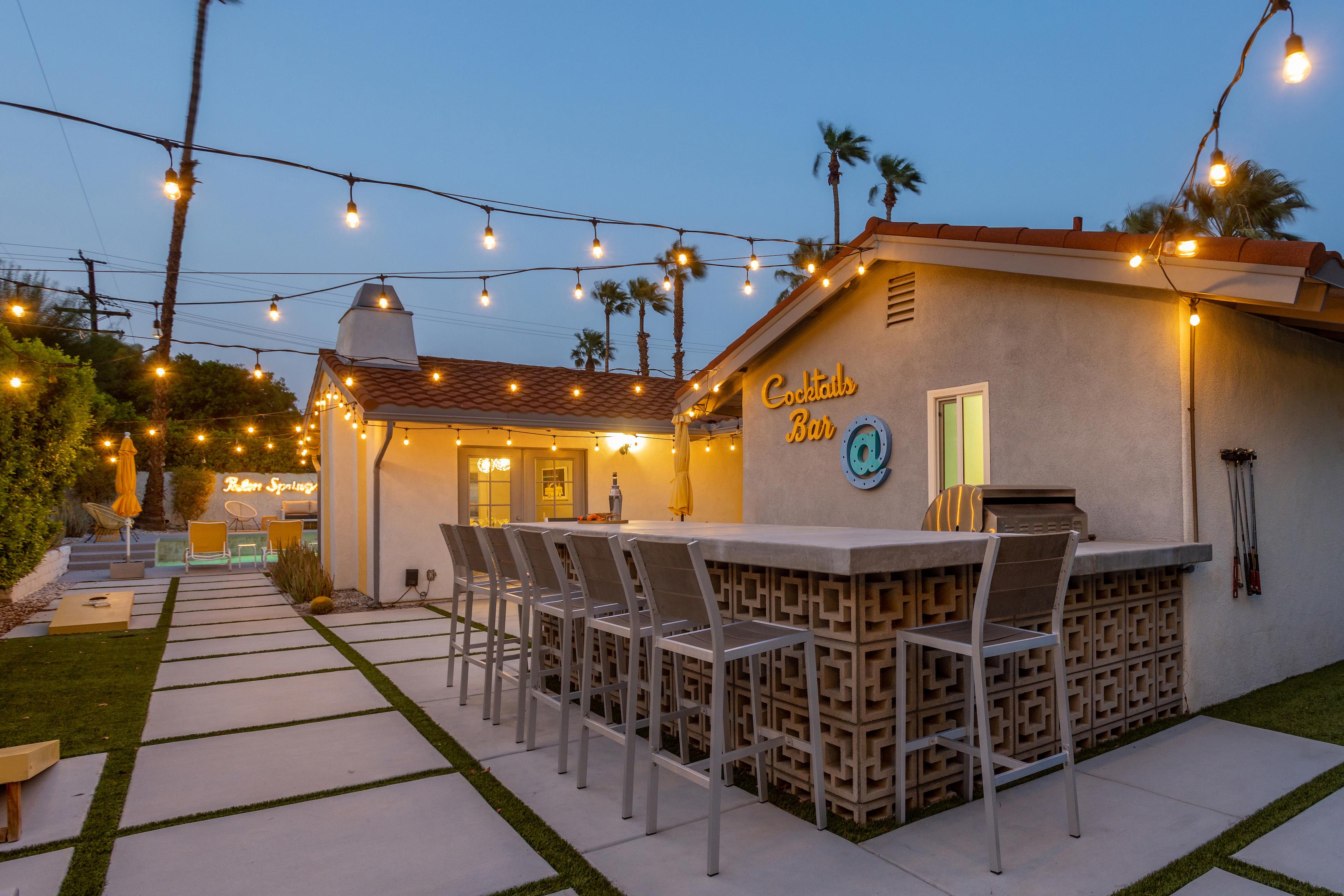 The fabulous resort-style pool yard has been completely walled for privacy. Gorgeous mountain views from the heated inground pool, spa, and covered outdoor living pavilion. Awesome outdoor bar and lounge area with a huge fire feature. Yes - there are even gorgeous twinkly lights, a corn hole game and mini golf. This place is off the charts gorgeous! Here at Lemon Twist - it’s all about having fun and relaxing in the Palm Springs sunshine!
