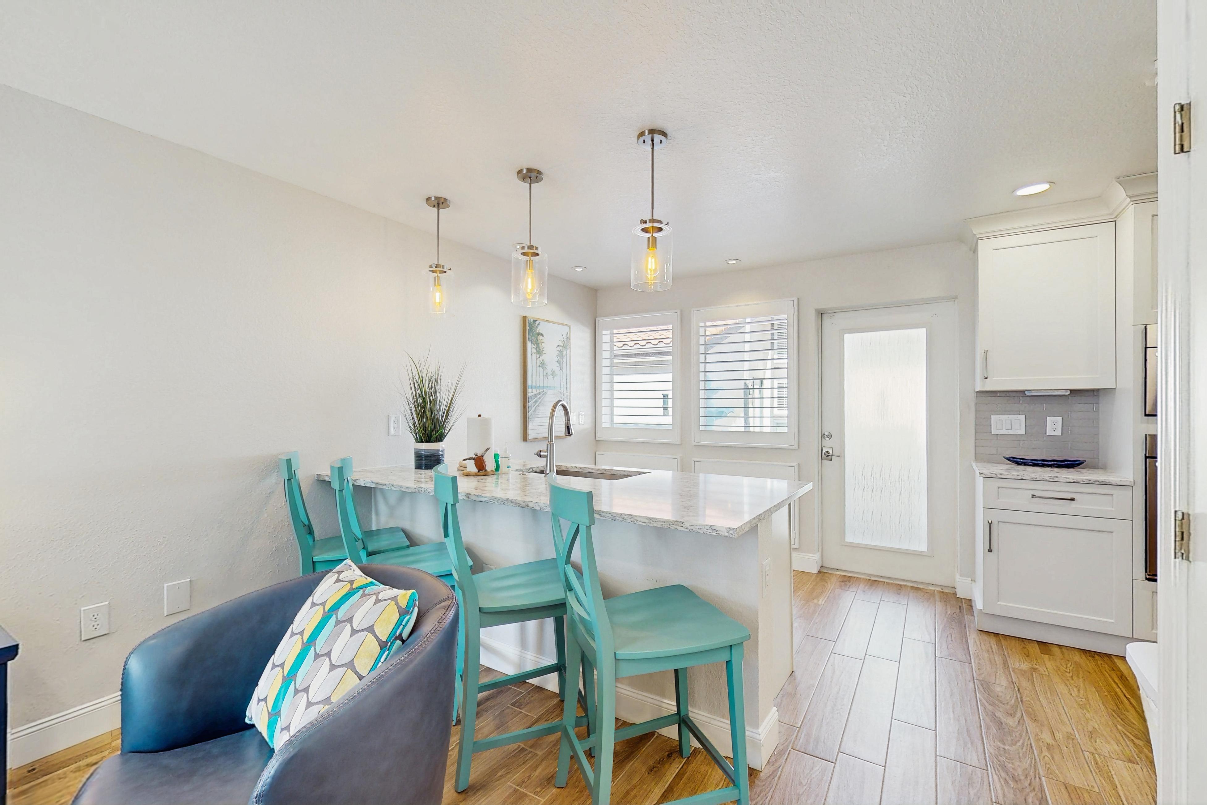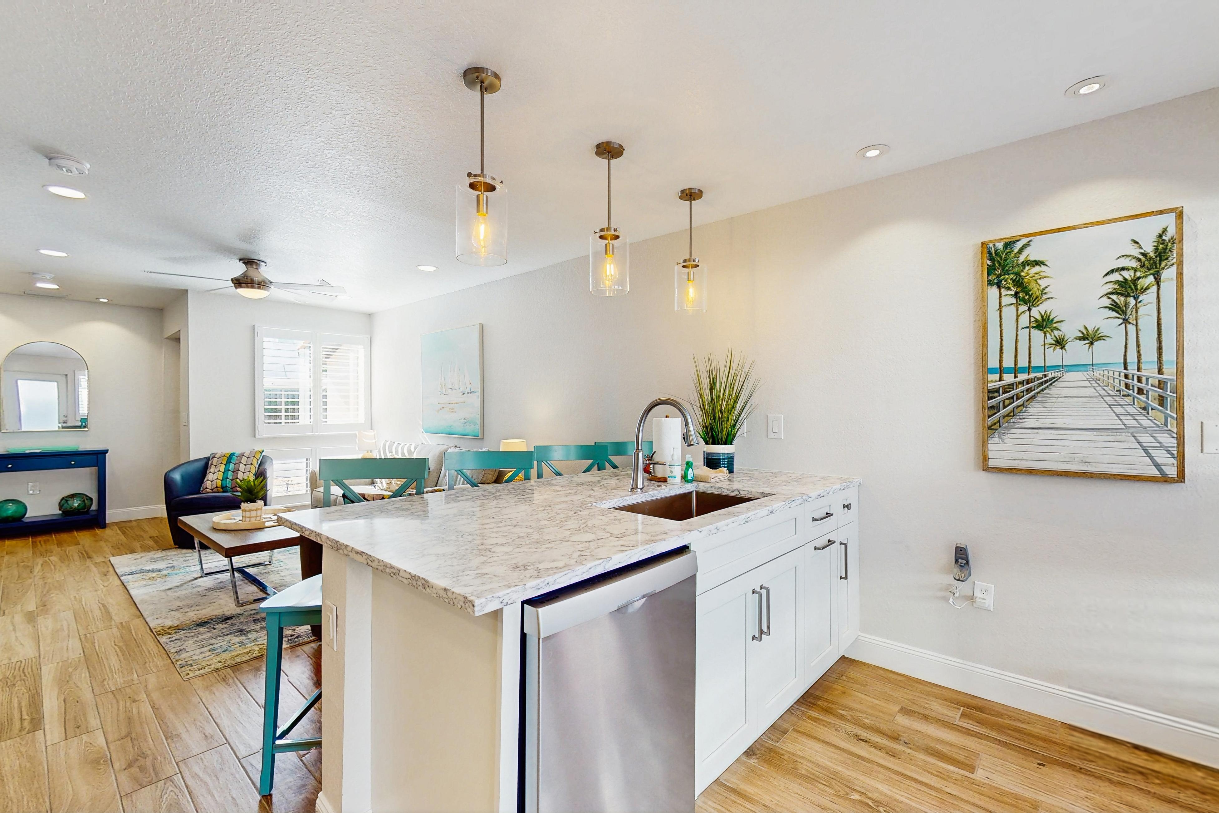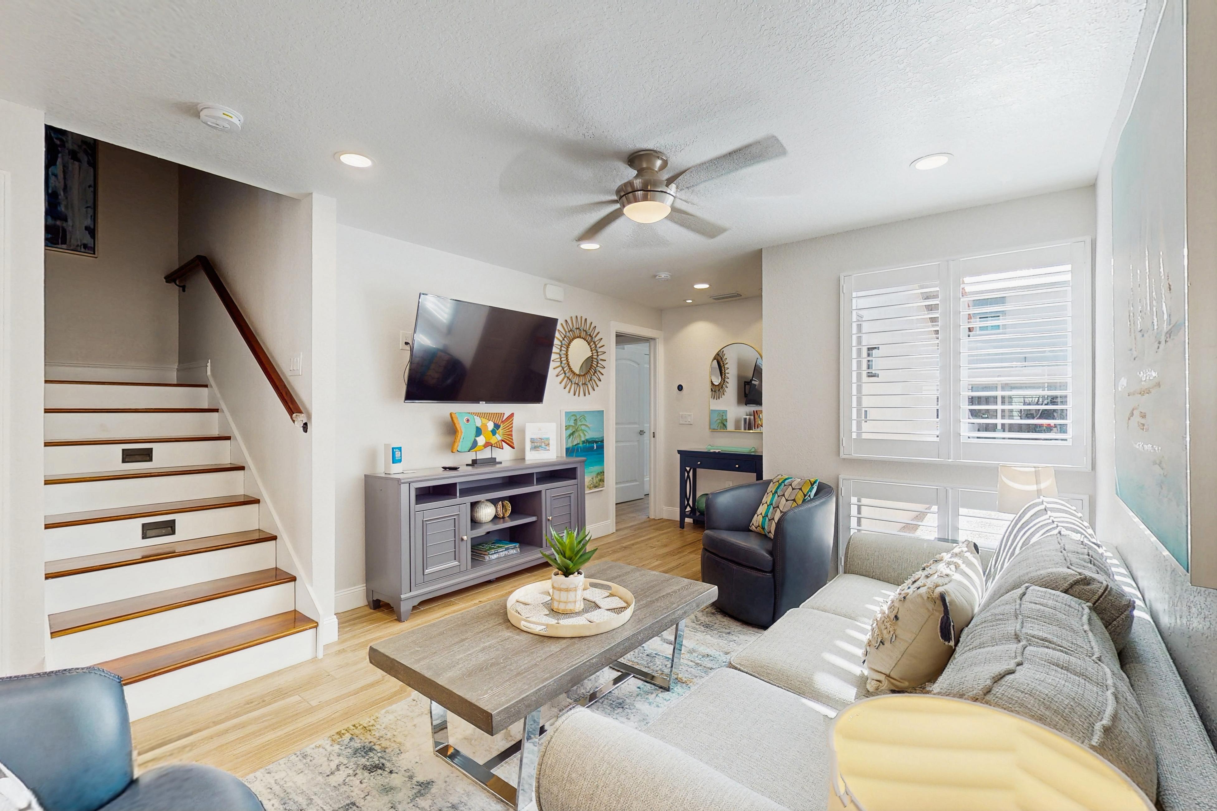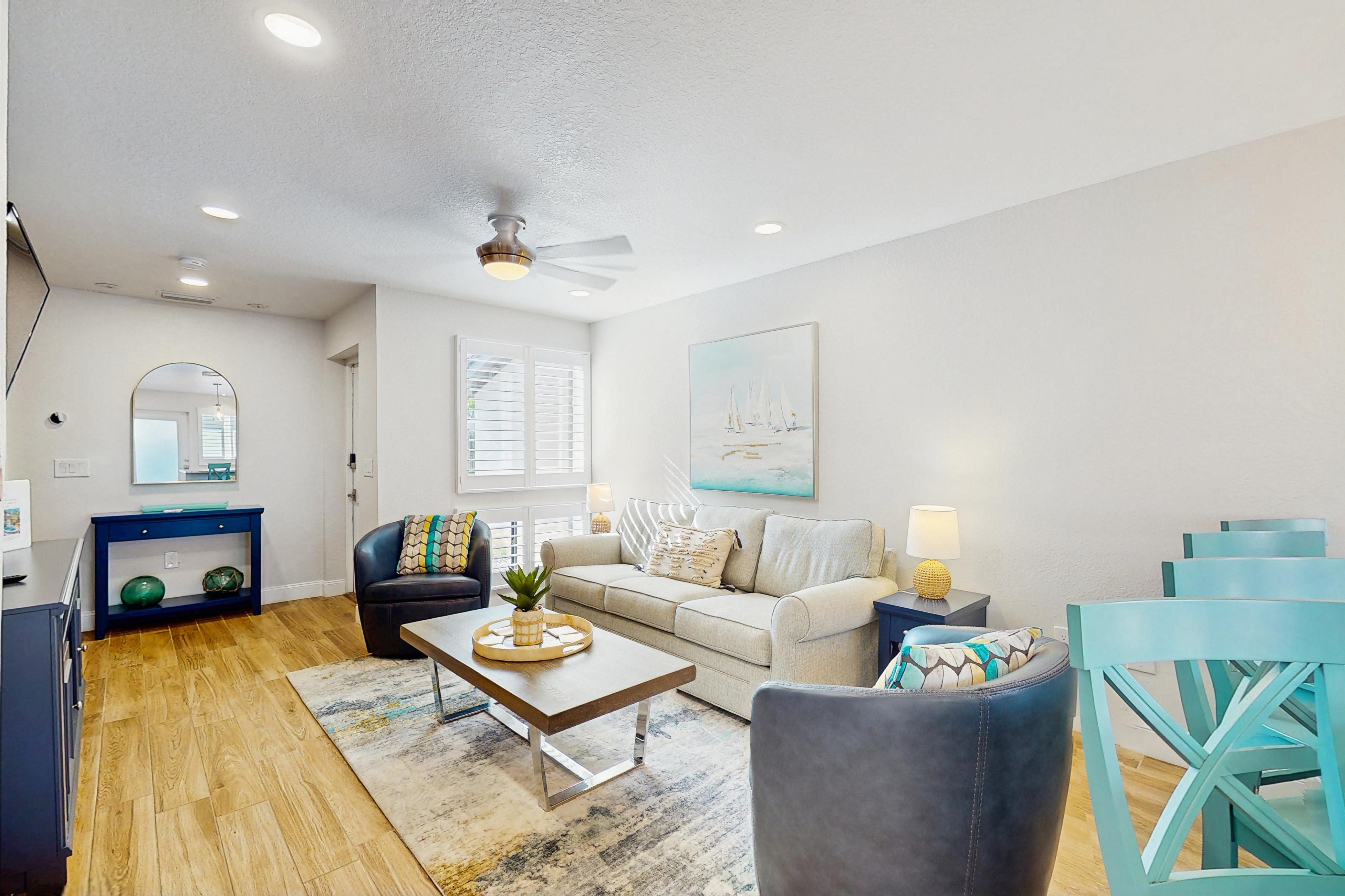 This tasteful coastal home with vaulted ceilings is light, open, and airy. You can relax in the main living space with a sofa and two day chairs. Watch TV after a long day at the beach or set up your laptop/tablet and work remotely at the lovely wooden desk. The ground-level primary bedroom has a large TV and a spectacularly tiled main bathroom with a spacious walk-in shower. A guest bedroom features another TV and a stunning, updated bath. This beautiful condo has been remodeled down to the studs and now boasts wood-plank tile throughout, granite countertops, stainless steel appliances, and a central air-conditioning unit.